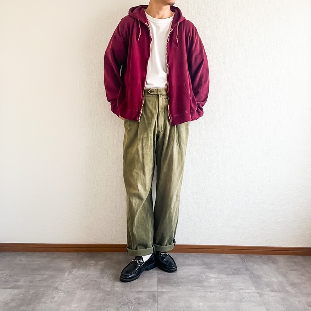 サイズ 表記:表記なし 着用感:M~L相当 ※着用感は当店の独自の基準によるサイズ感です。 実寸:cm(多少の誤差がございます) 肩幅:61 身幅:60 着丈:56 袖丈:53 商品詳細 年代 :1970年代~ 生産国 :USA ブランド:ー 素材 :恐らくコットン、ポリ 色 :マルーン系 特徴 :1970年代頃の希少なヴィンテージスウェットパーカー。 アメリカでも非常に人気が高く枯渇、高騰が止まらないヴィンスウェ。 マルーン系のカラーリングにフロントは"IDEAL"のピンロックのフルジップ。 紐だけブラウンカラーになっているのが良いですね。 フルジップパーカーはこれから秋に向けてかなり活躍してくれるアイテム。 着丈は長くないですが身幅は比較的しっかりとある比較的良い条件。 フェードも相まって非常に良い雰囲気な個体です。 ※ユニセックスで着ていただけます。 着用者170cm相当 コンディション こちらの商品は【B~C】ランクです。 ※※古着故の多少の着用感や画像のような汚れやダメージ、フェードがございます。古着に理解のない方のご購入はお控えください。 【S】ほぼ新品。美USEDの商品。 【A】若干の使用感はあるが、状態の良いUSED。 【B】使用感はあるが、目立つダメージや大きな汚れはない。 【C】使用感と部分的に目立つダメージや汚れあり。 【D】過度の使用感、目立つダメージや汚れあり。使用は可能。 【N】新品、展示品、デッドストックなど。 ご注意事項 掲載商品は実店舗でも販売しているため、 既に販売済みである場合やご注文が重複する場合があります。 その場合は誠に申し訳ございませんが、ご注文時刻が早い方を優先させていただきますのでご了承ください。 またご注文後のクレーム、返品対応は出来かねますのでコンディション、サイズ等気になる点がございましたら必ずお問い合わせの上ご注文下さいませ。