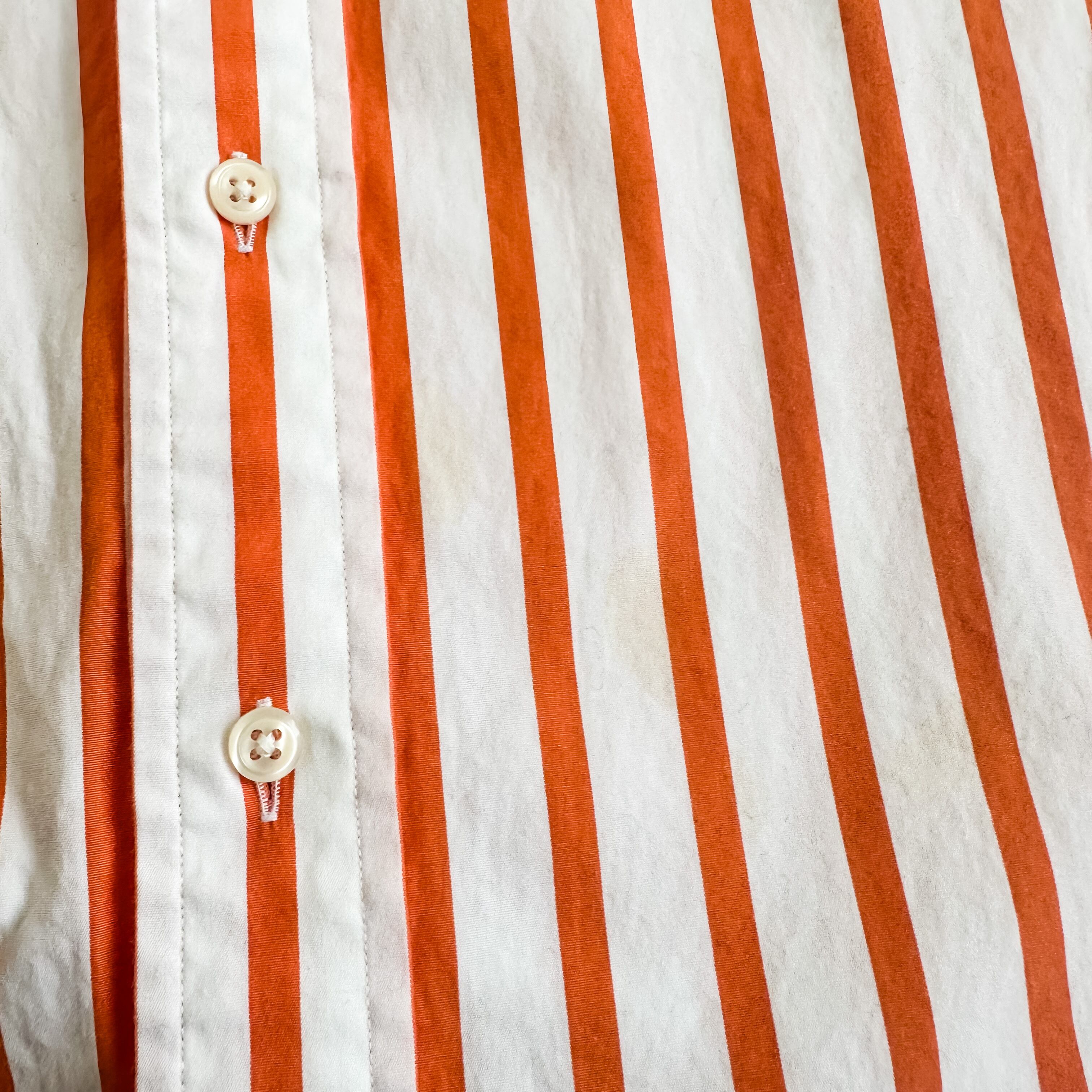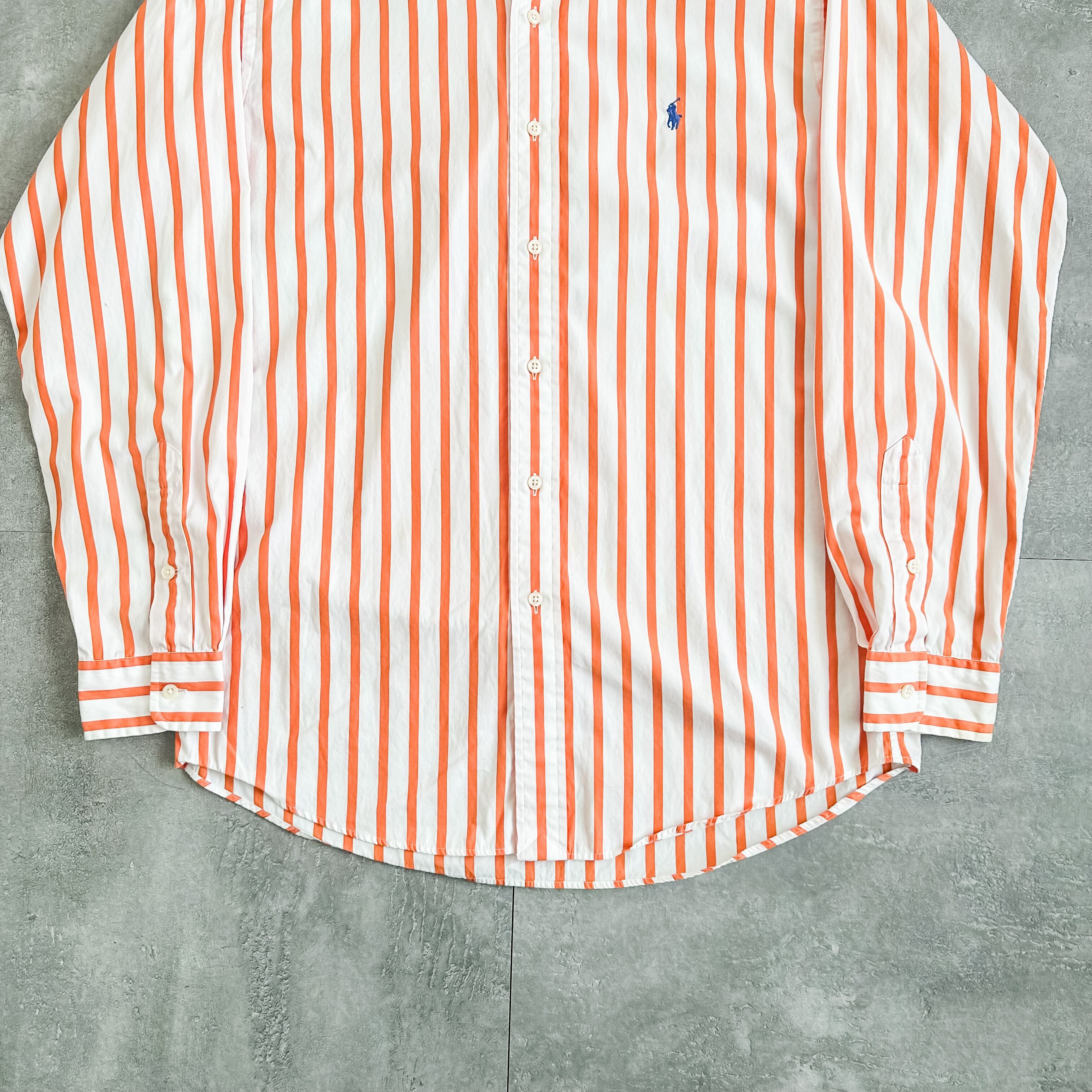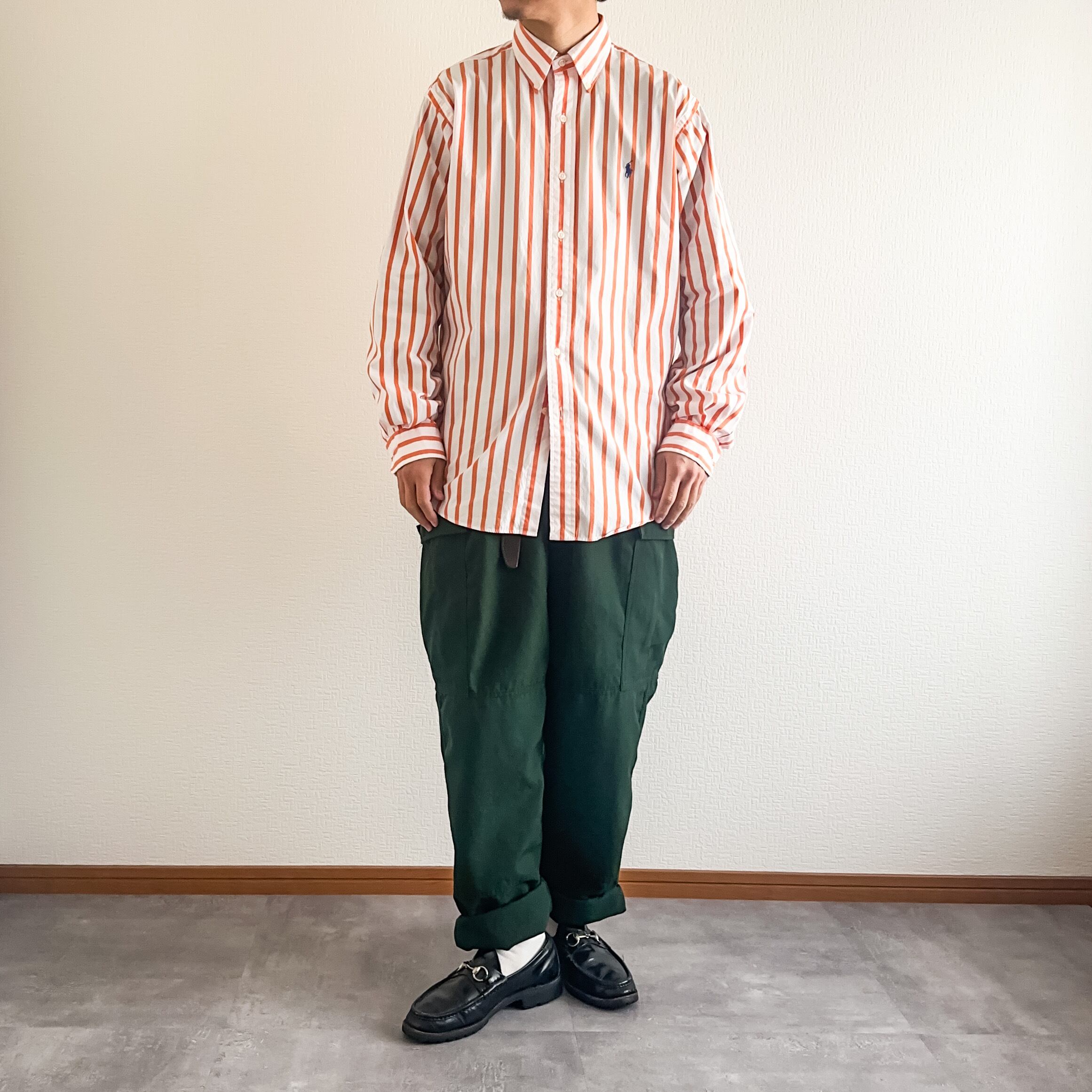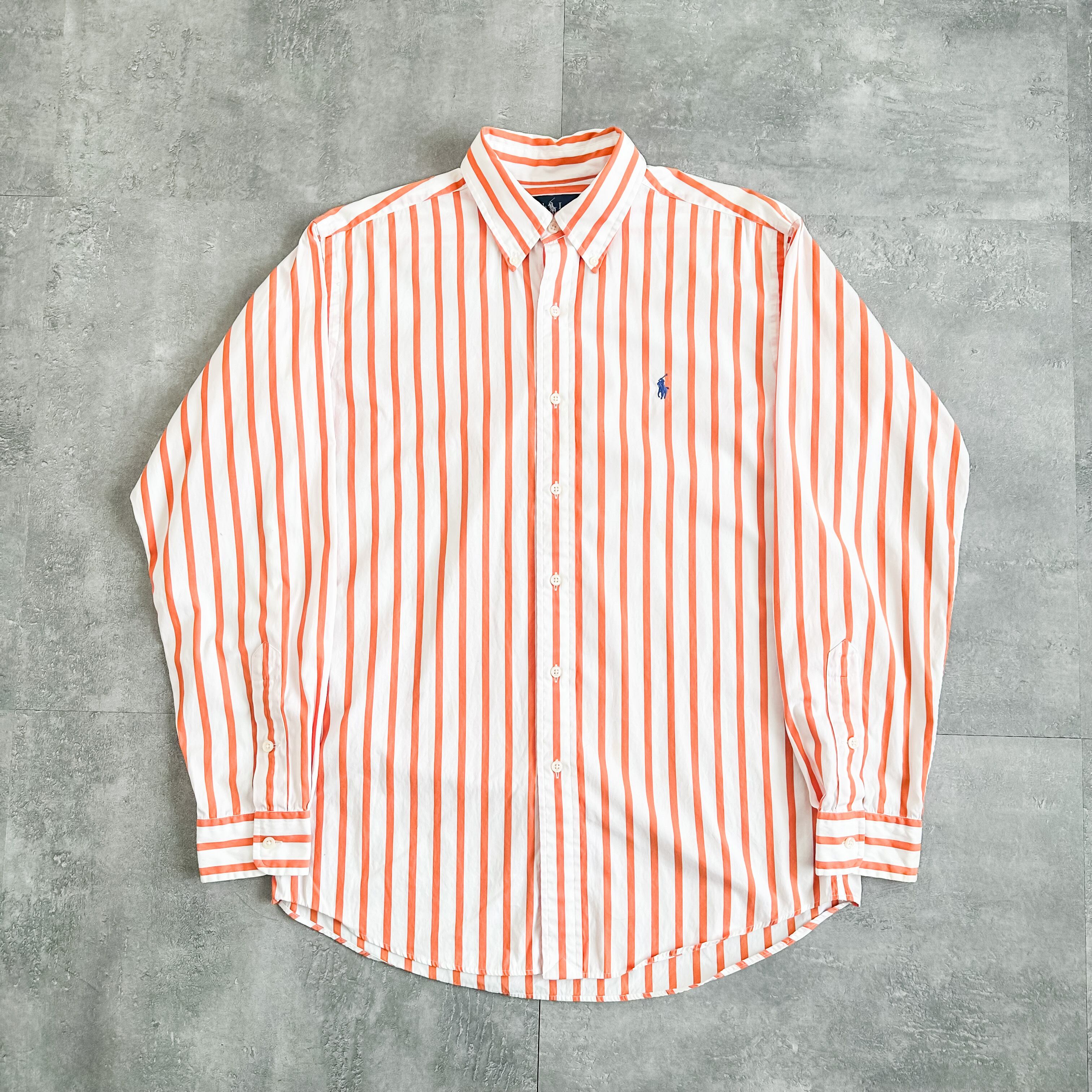 ストライプの中でも春らしいカラーリングのホワイト×オレンジのストライプに、ボタンダウンで胸にはポニーのワンポイント刺繍◎