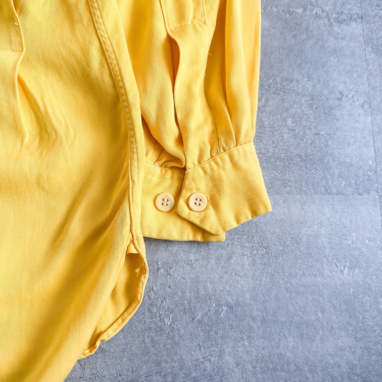 とろみがあり美しいドレープ感のあるレーヨンファブリックに春らしいイエローカラー、バックには三段のチェーンステッチの刺繍が映える素晴らしい逸品です。