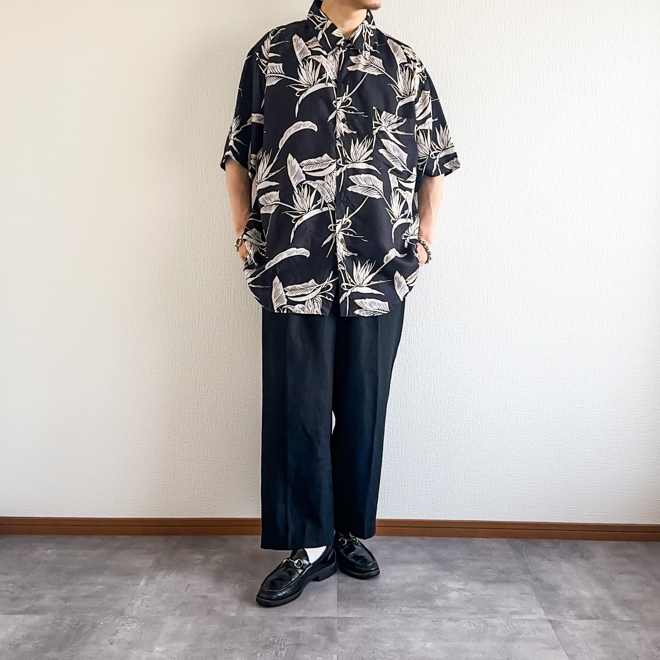 ボックスシルエットにブラックカラー、ボタニカル柄のハワイアンらしいテキスタイルがグッドな一枚。