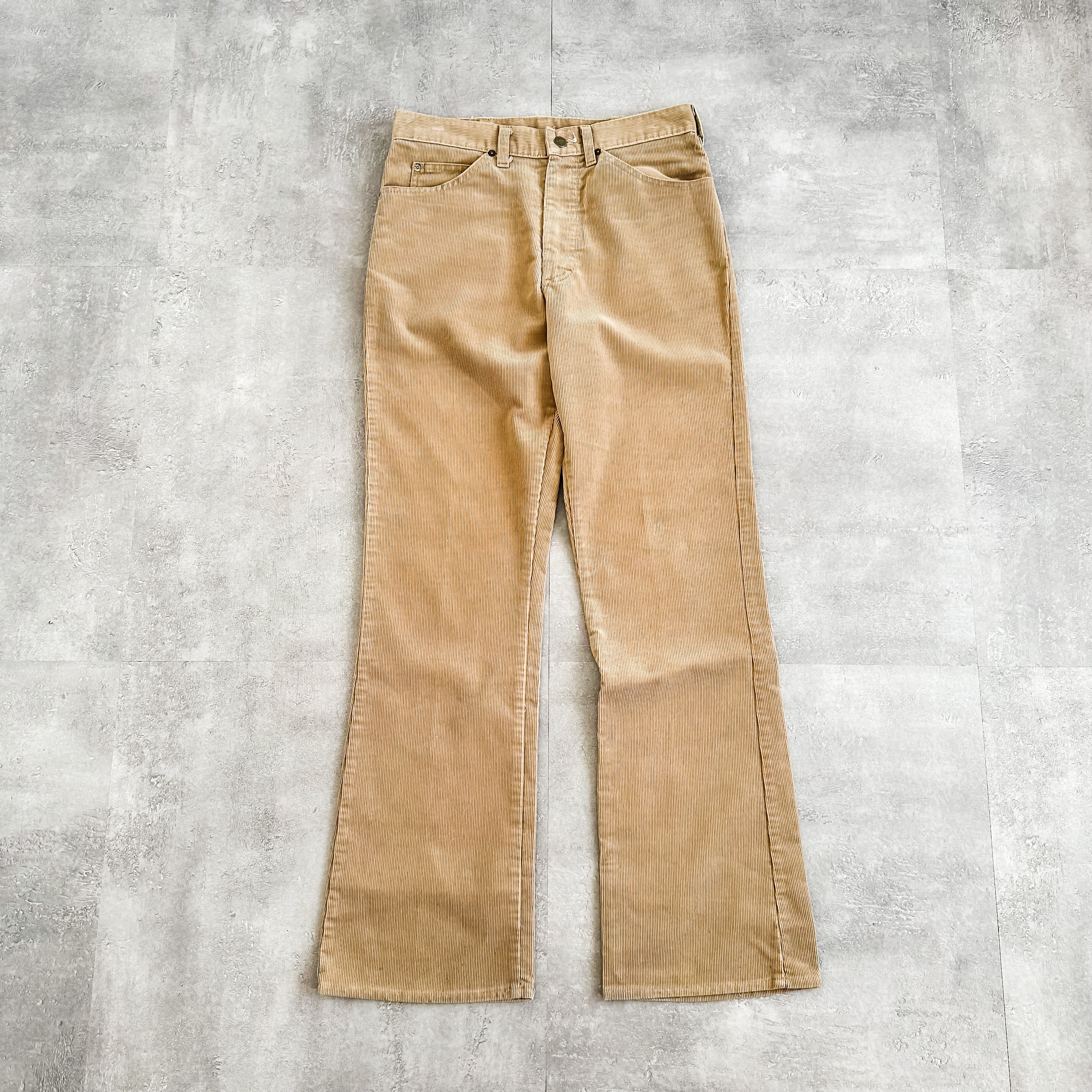 定番で合わせやすいベージュカラーの細畝に、少し裾が広がるフレアシルエットがグッドな一本です。