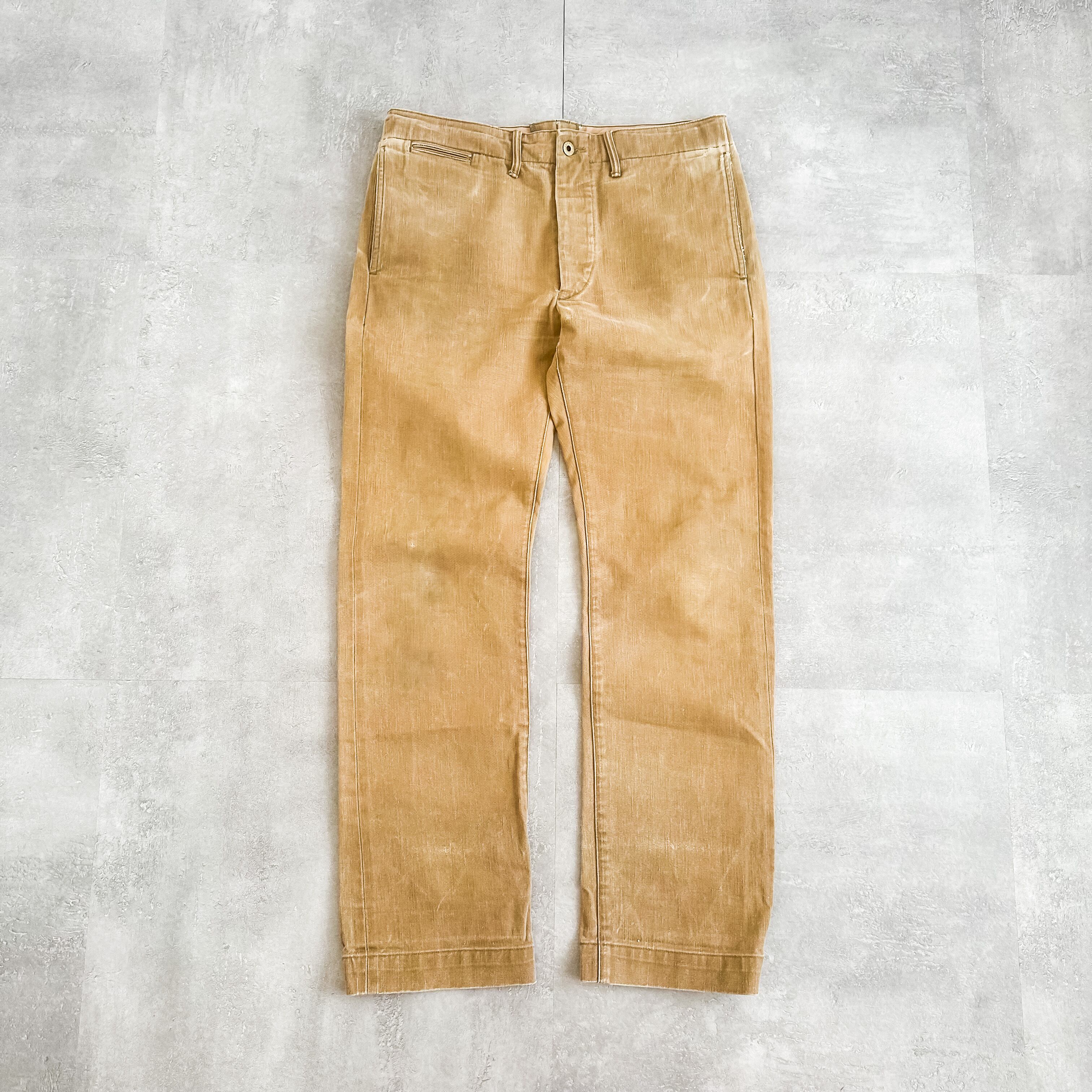 両玉縁のコインポケットが付く5ポケット仕様で、背面にはバックルバックの付くディテールもグッドな一本です。