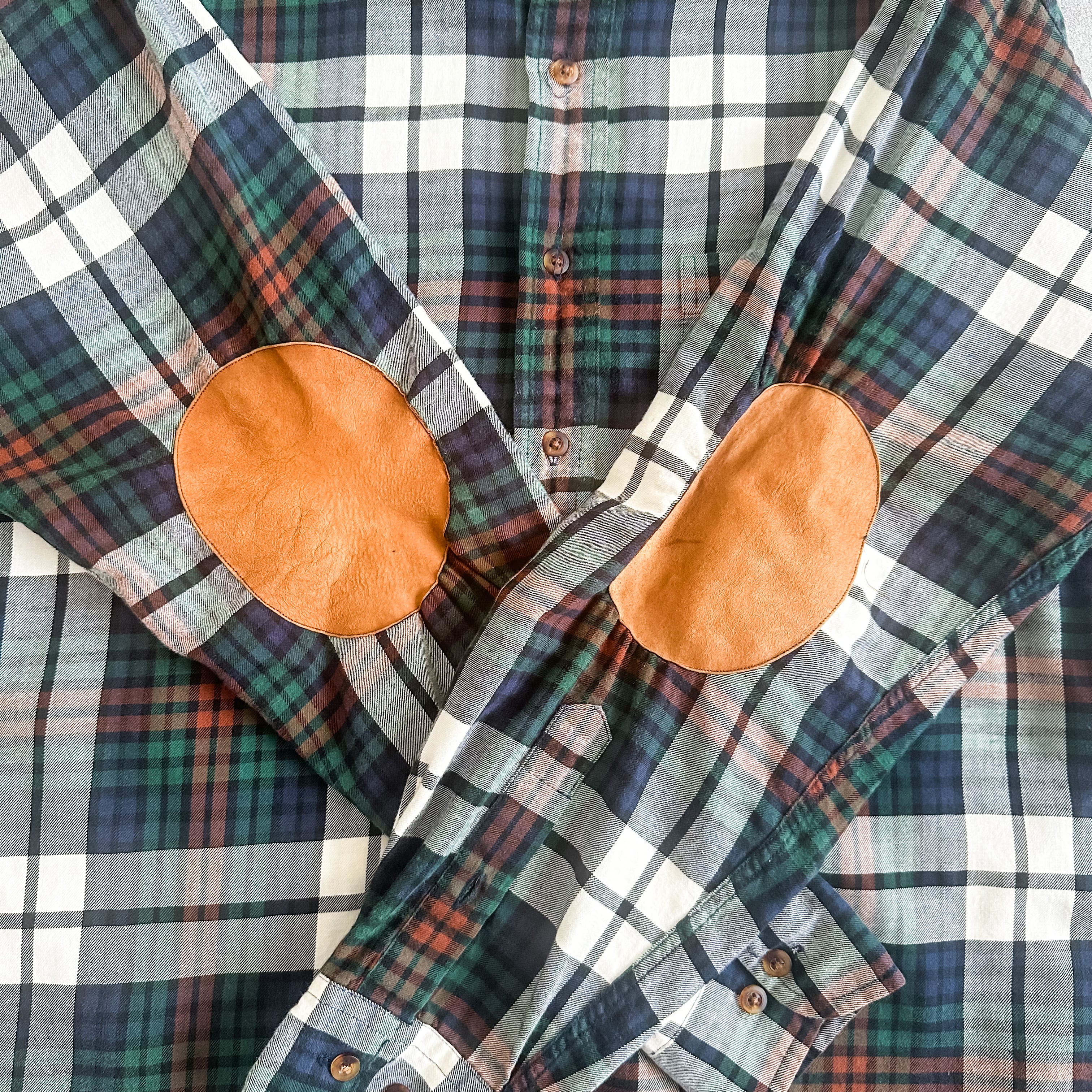 この手のチェックシャツでは珍しいレザー襟の切り替えに、レザーのエルボーパッチまで付く素晴らしい逸品。