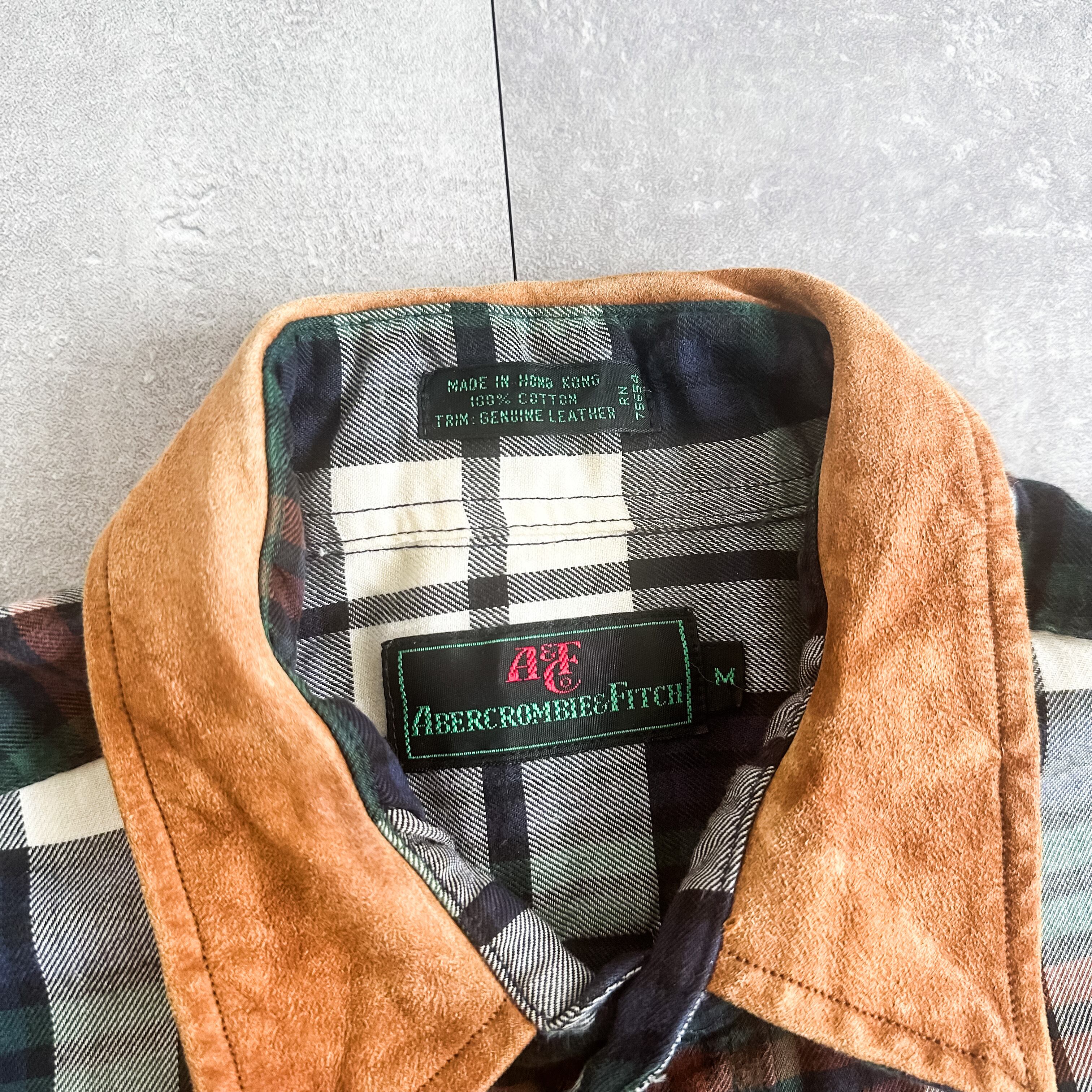 1980's "Abercrombie&Fitch" leather collar plaid pattern cotton shirt with elbow patch