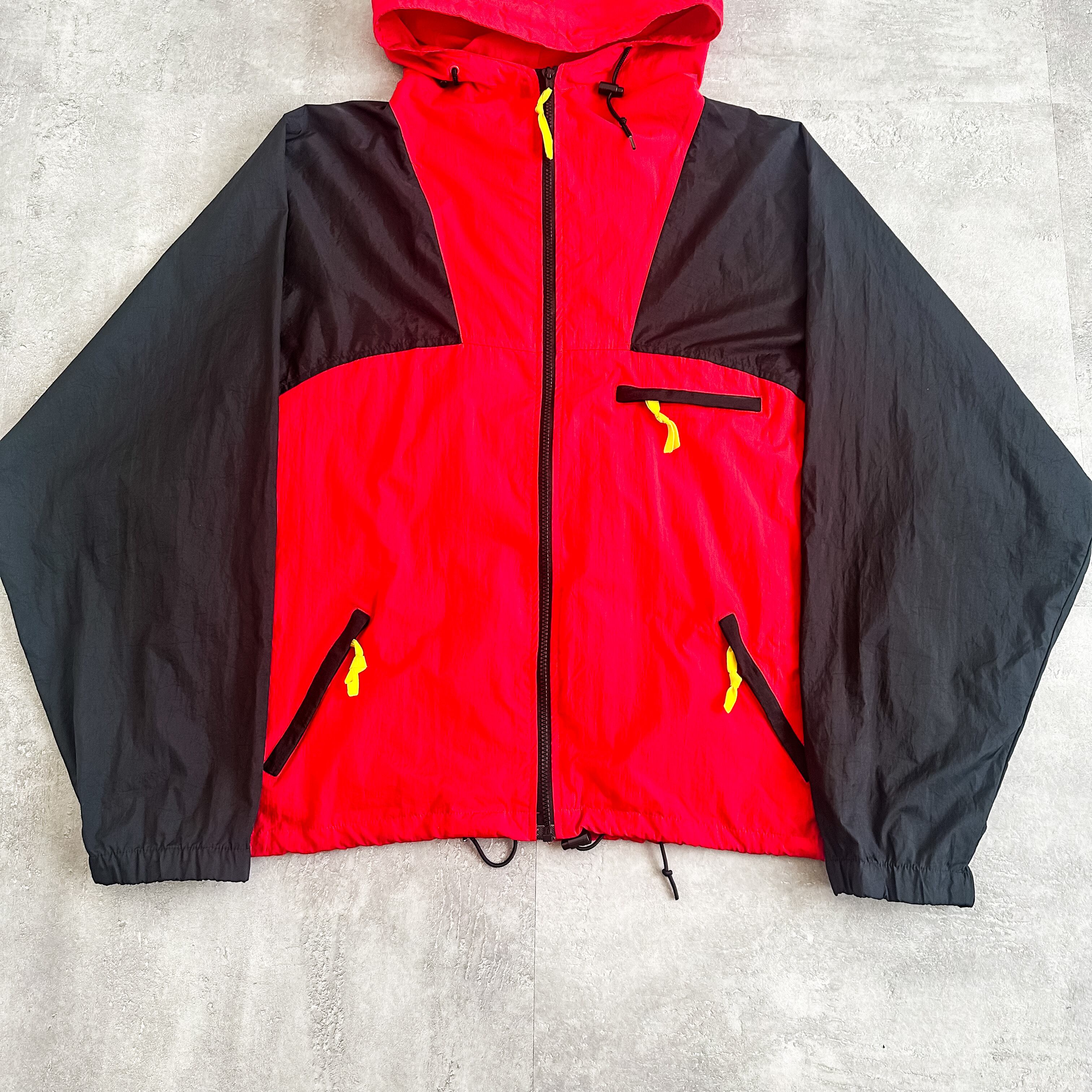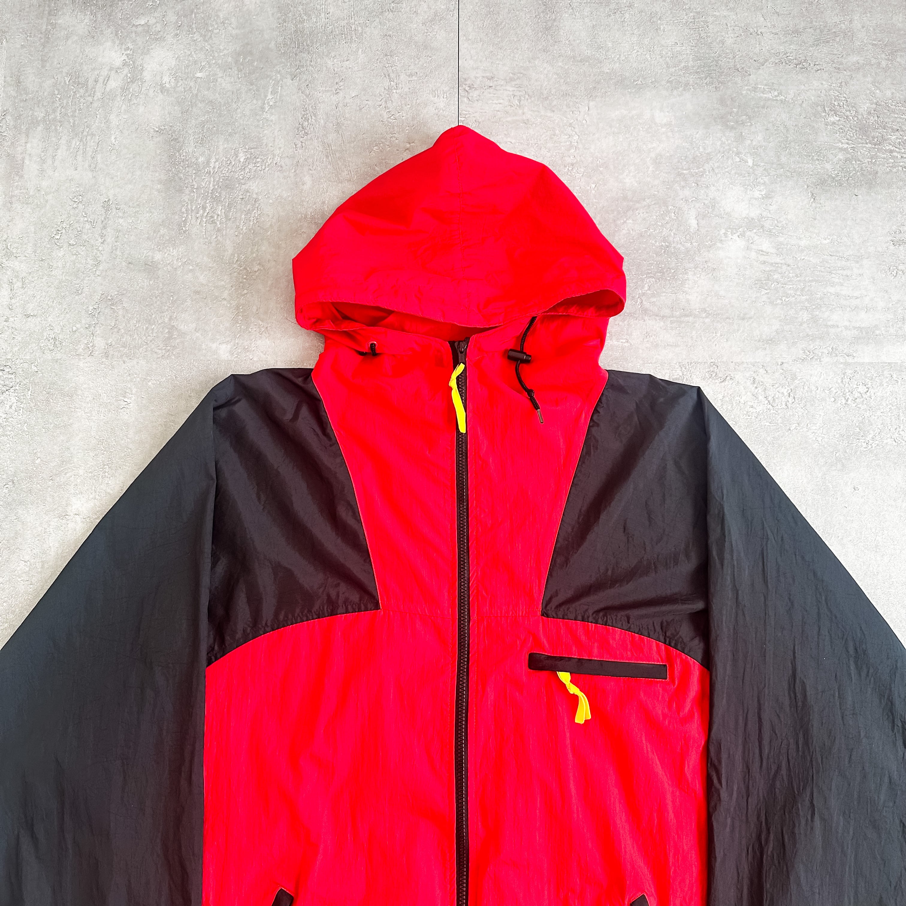 シャリ感のあるナイロンファブリックに、レッド×ブラックの大胆な切り替えがグッドなデザイン。