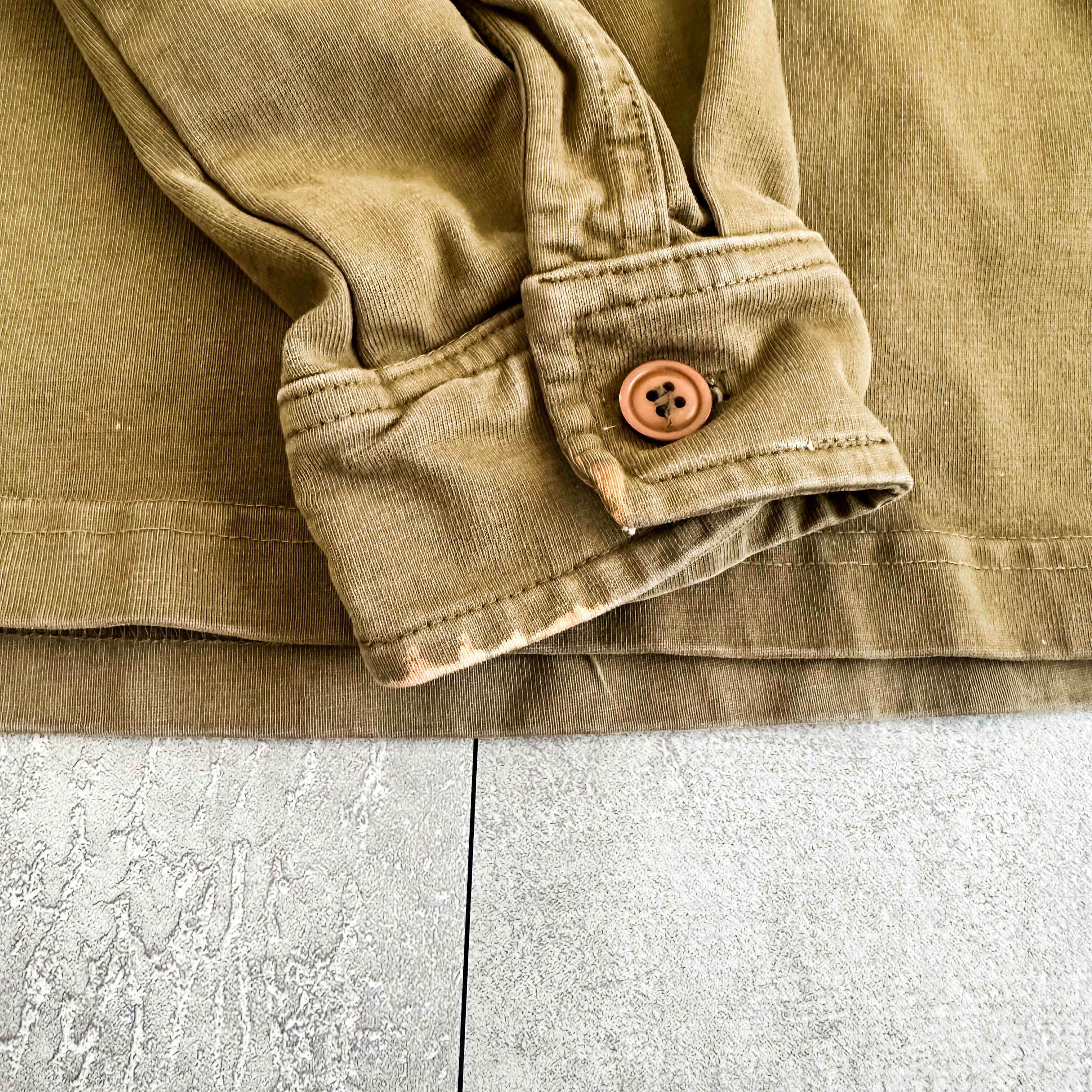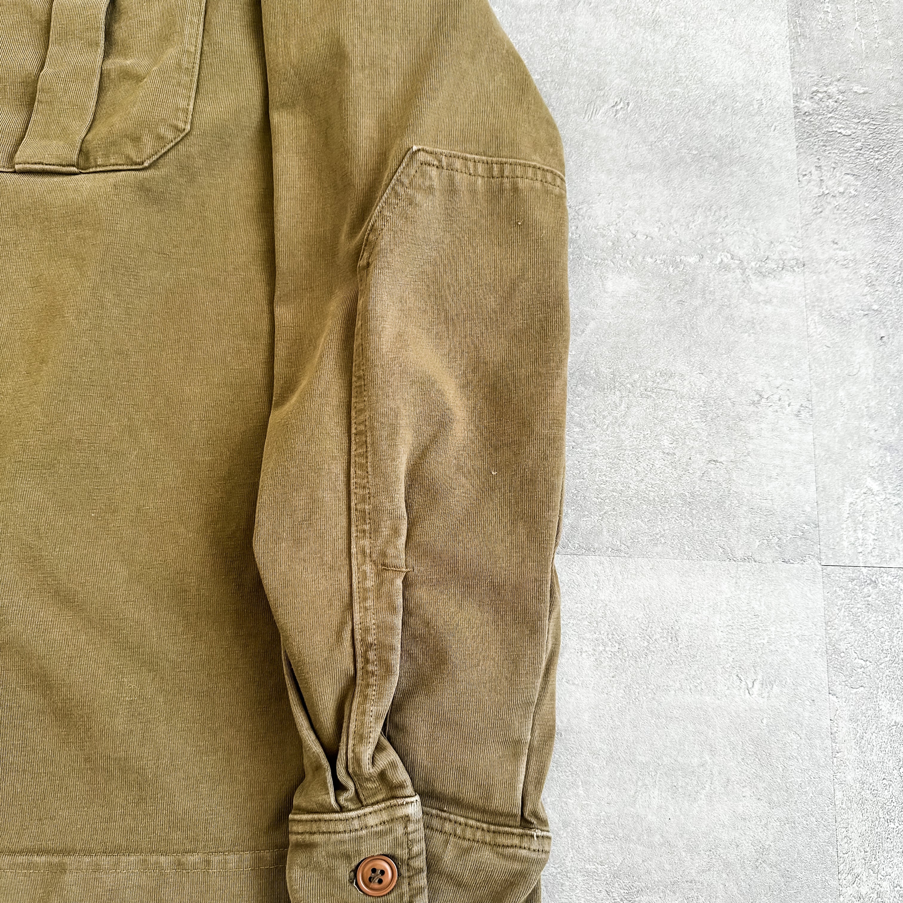 ミリタリーのようなオリーブカラーに、ハリのある肉厚なコットンファブリック。