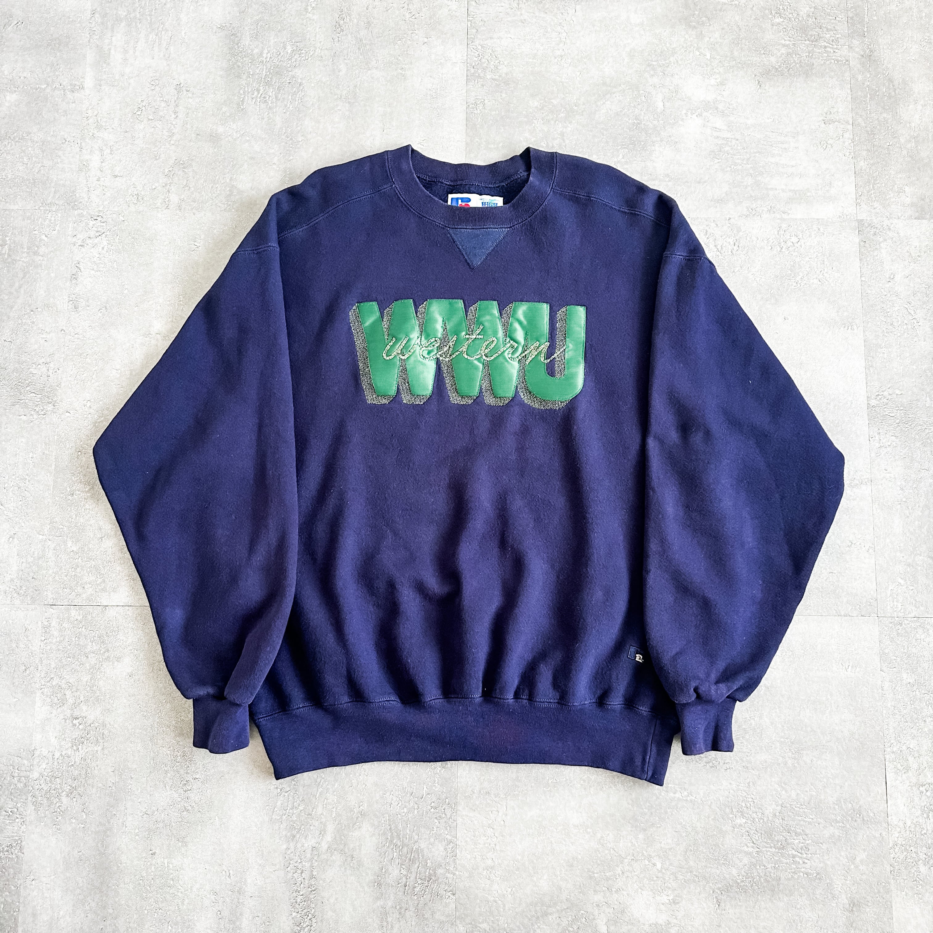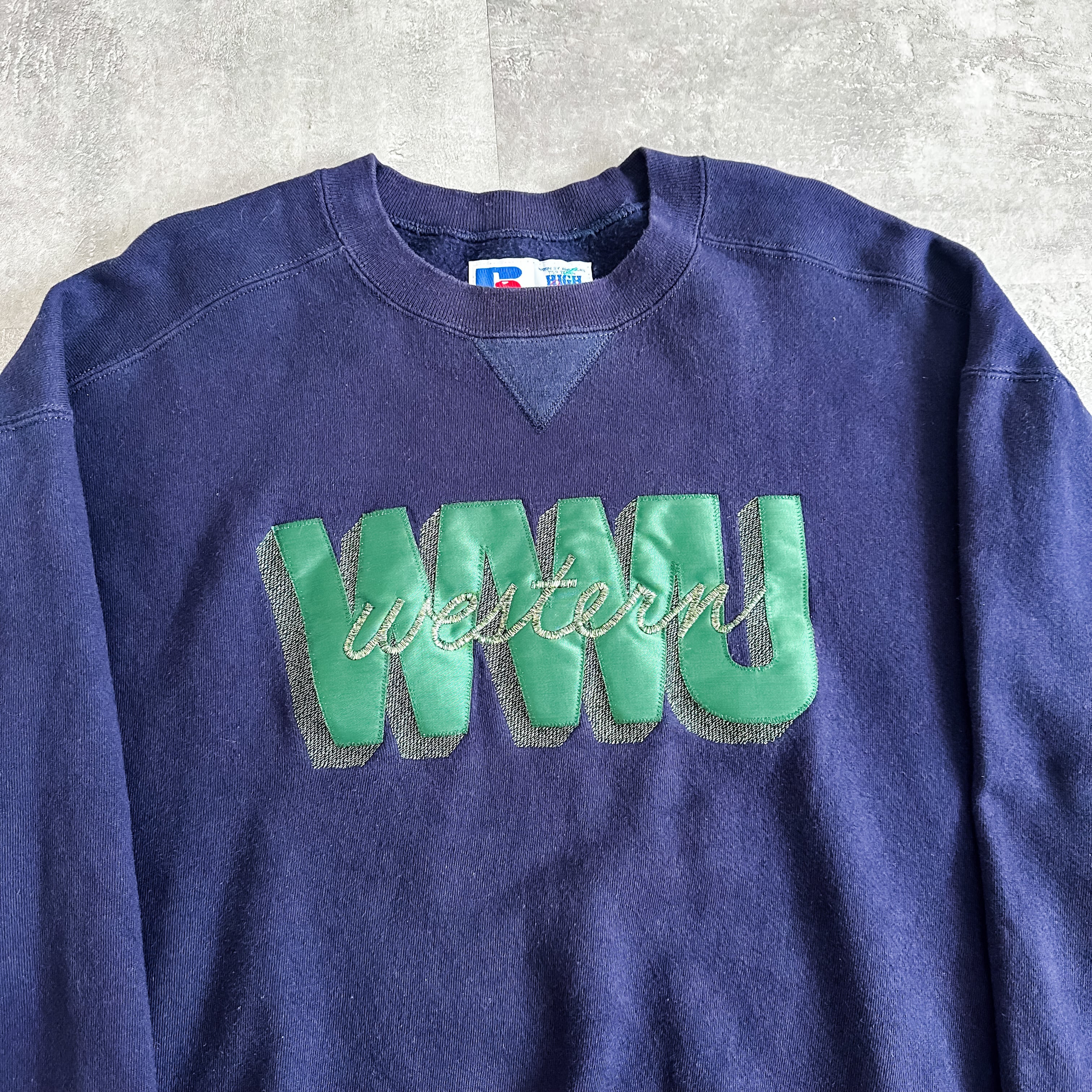 ネイビーカラーにフロントには立体感のある"WWU"のグリーンの大きいワッペンと刺繍が入るグッドな一枚。