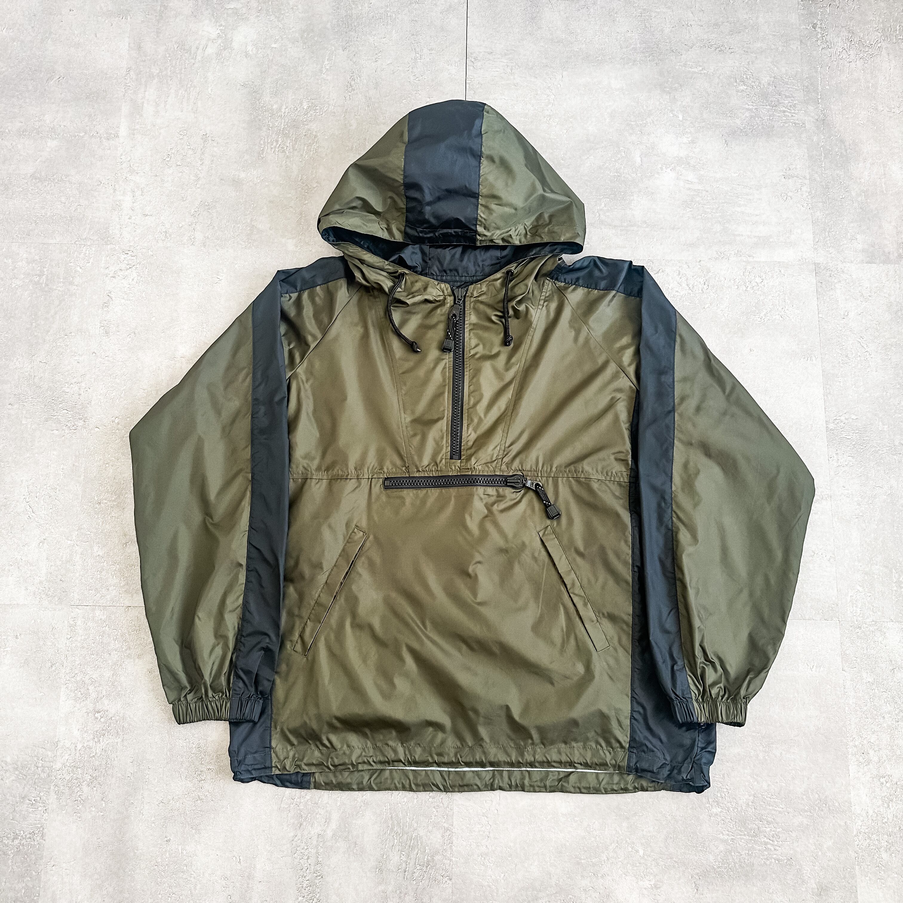 オリーブ×ブラックの配色の良いツートンカラーに、ハーフジップのプルオーバーデザイン。