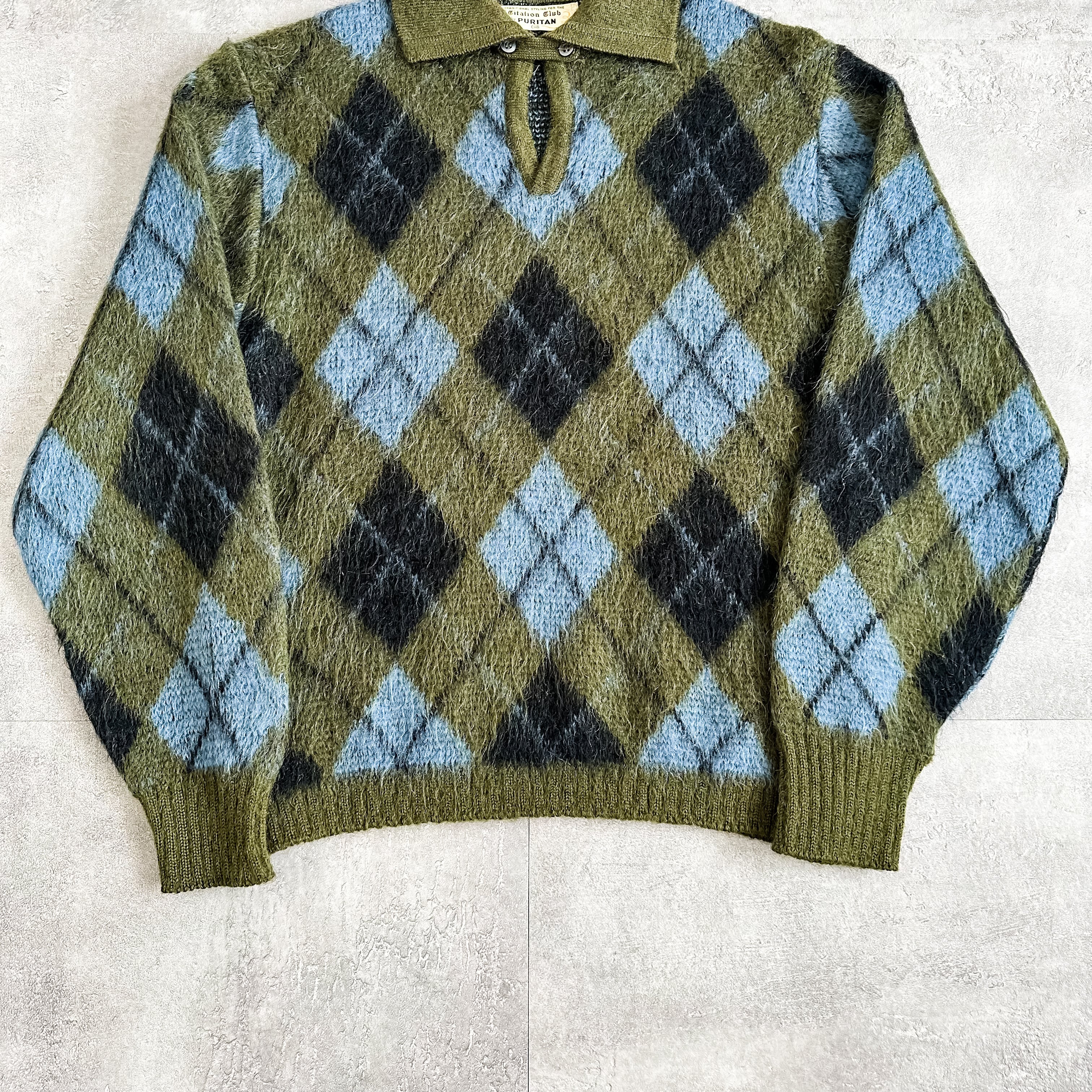 Vintage 1960's "PURITAN" argyle pattern mohair knit sweater with chinstrap