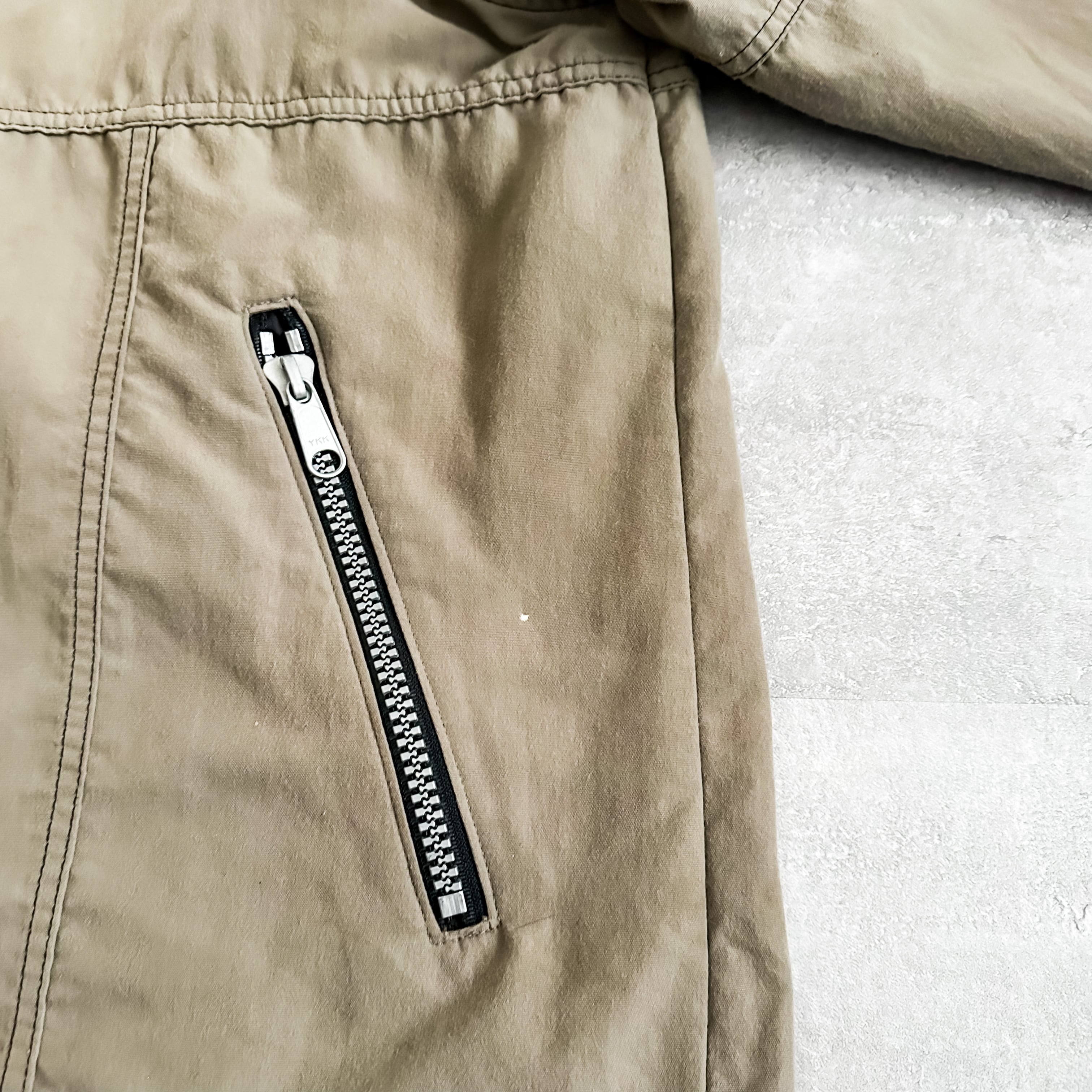 落ち着いたベージュカラーに、ブラックの補強当て布の切り替えが施されたディテール。
