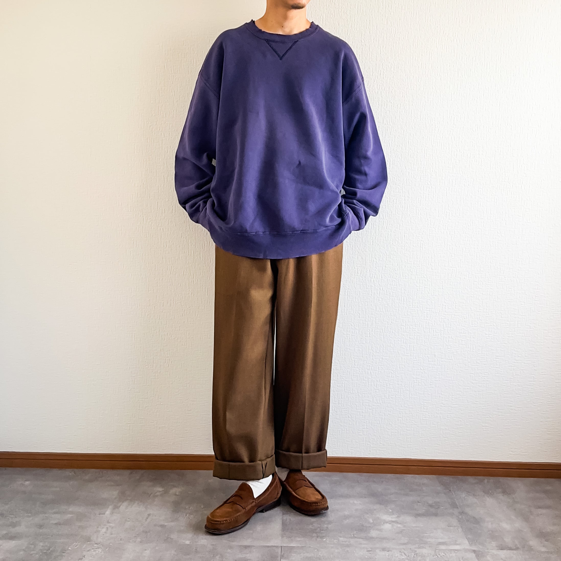ネイビーがかったパープル系のカラーに肉厚なコットンに脇下ガゼット、前V仕様というシンプルながらもグッドな一着。