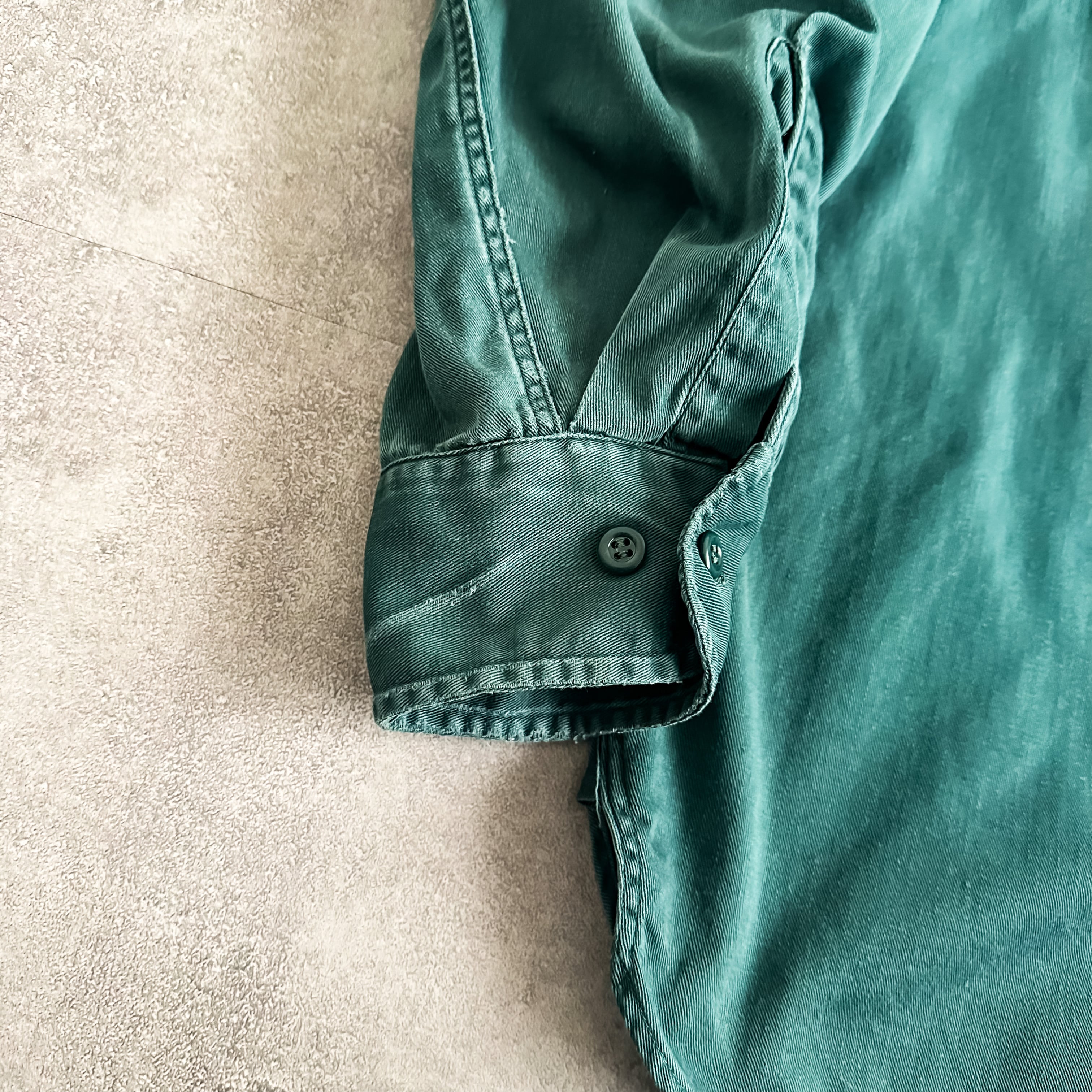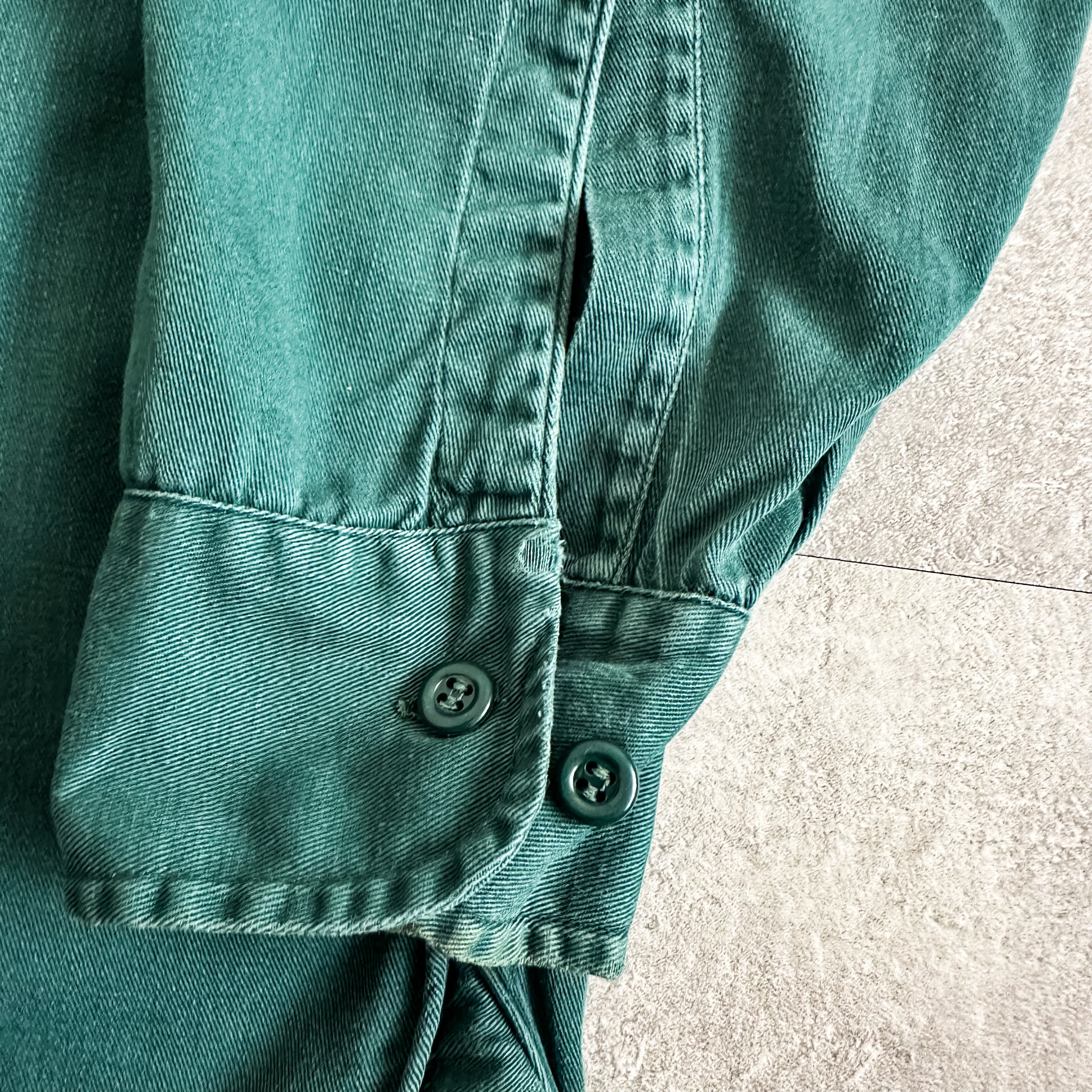 グリーンカラーのコットンツイル地で風合いも良く、洗いや着込む事によって経年変化も楽しめる一着でしょう。
