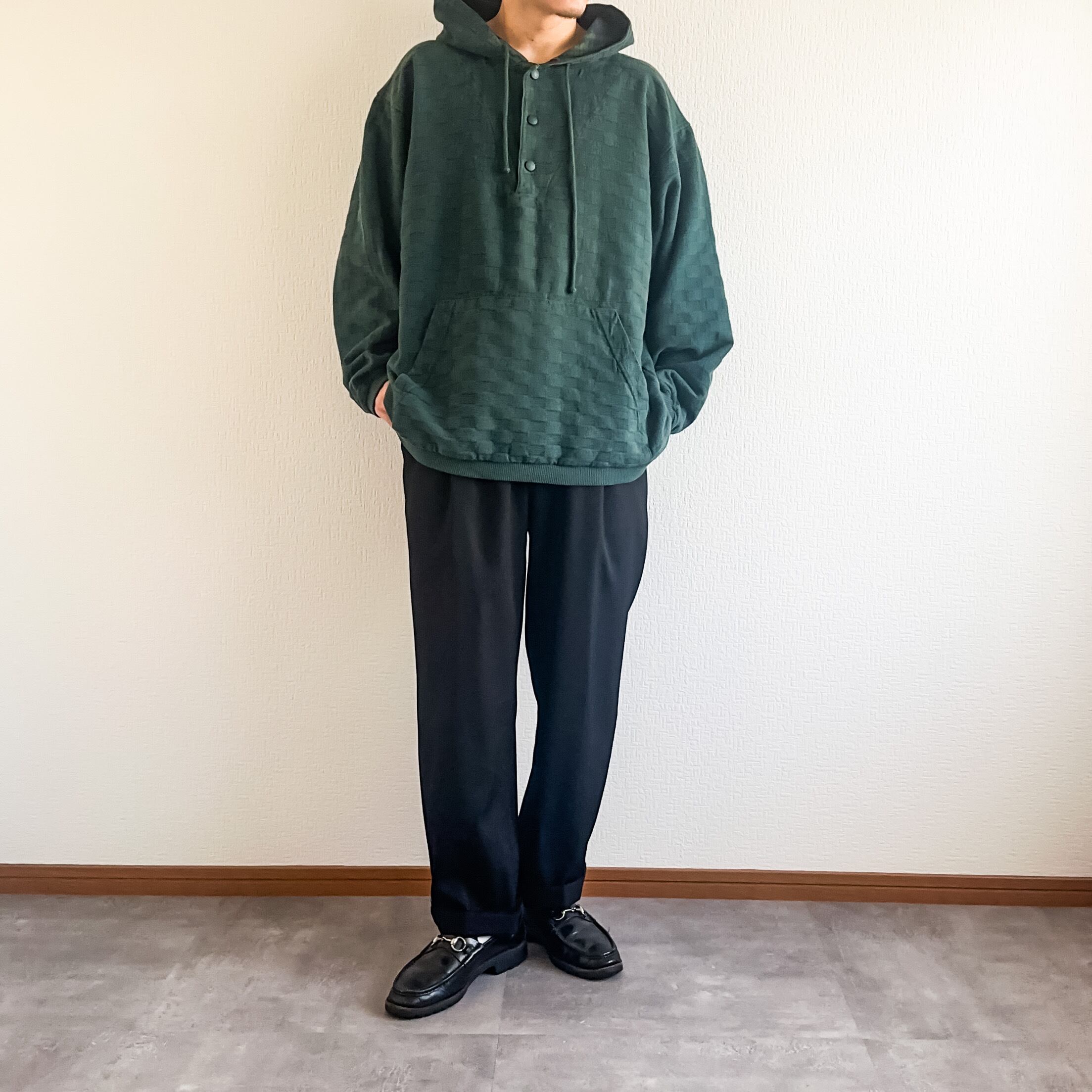 横に広いゆったりとしたシルエットに、ハーフスナップのプルオーバーデザイン。