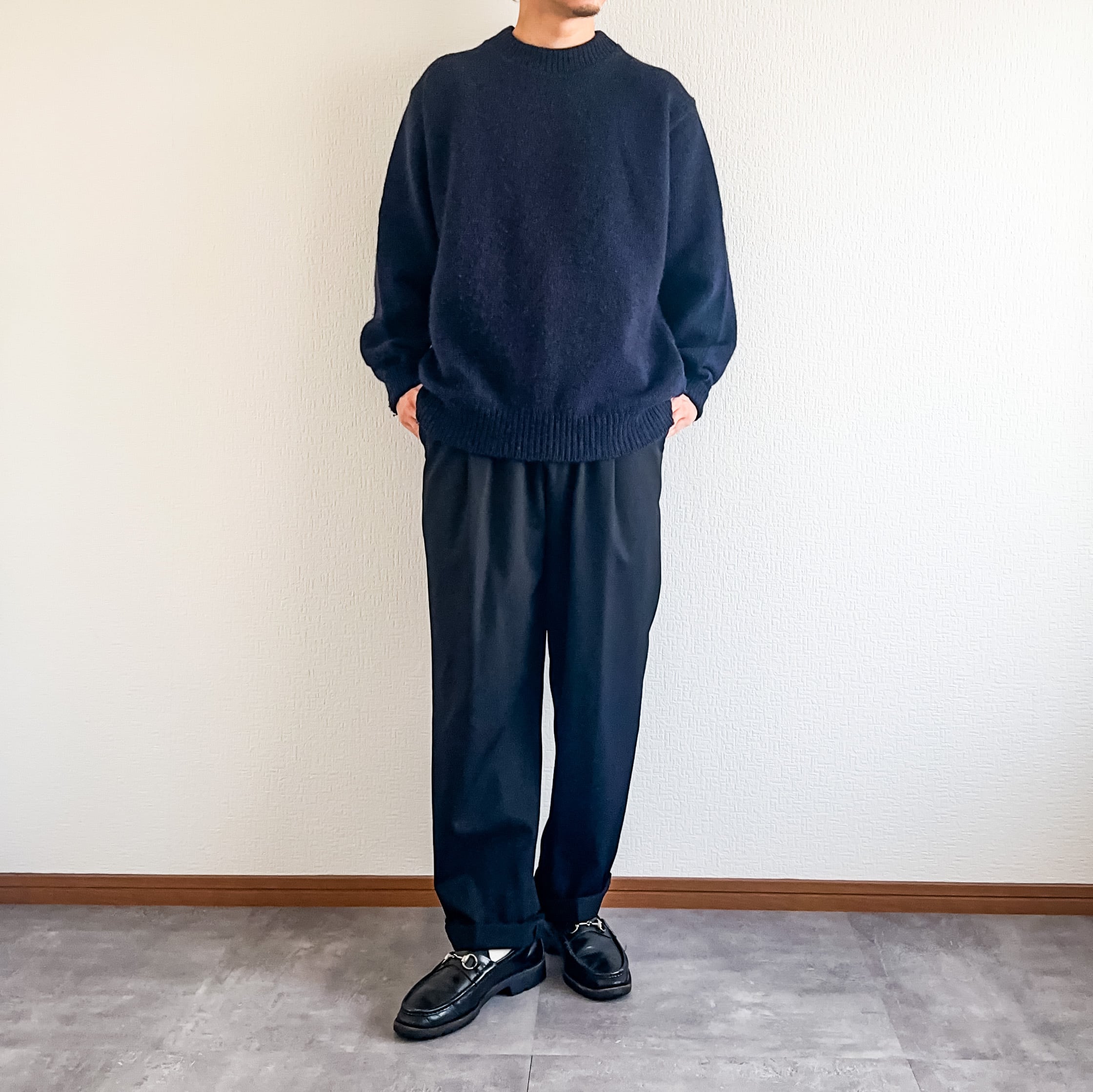 深みのあるネイビーカラーに、保温性の高い厚みのあるウール×ナイロンの混紡ファブリック。