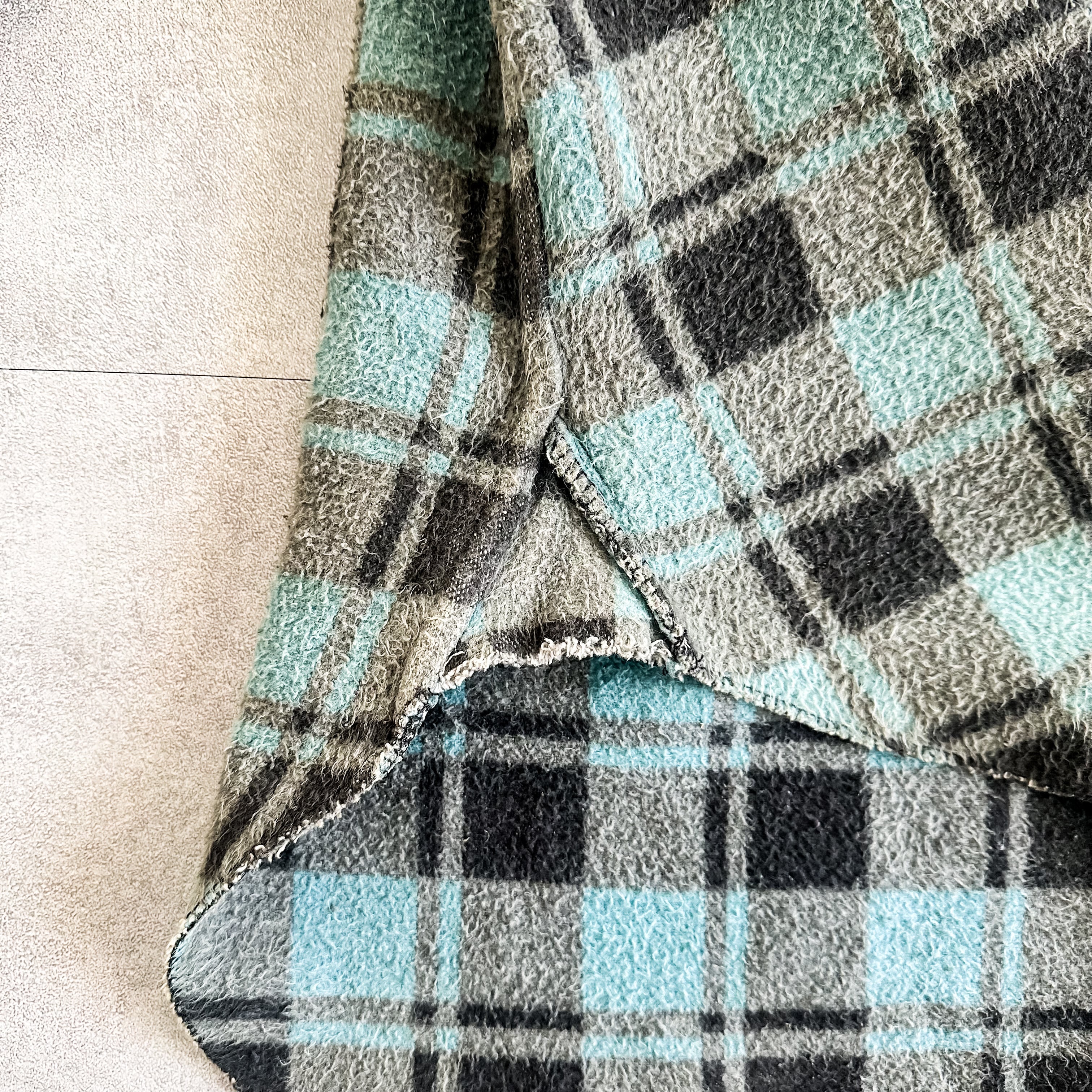 少しグレーがかったミントグリーン×オリーブ×チャコールグレー×ブラックの4トーンの配色のチェック柄が使用された素晴らしい一枚です。