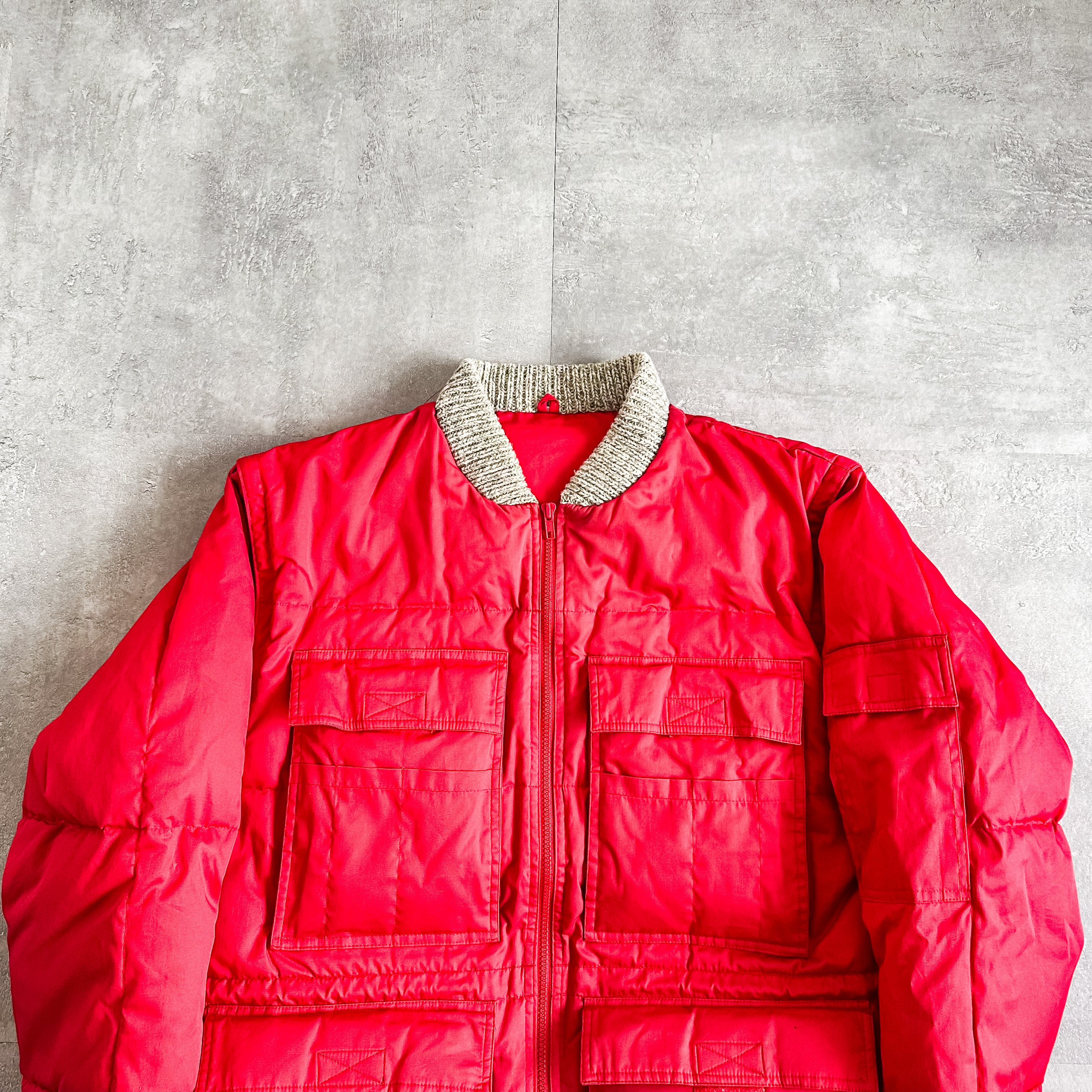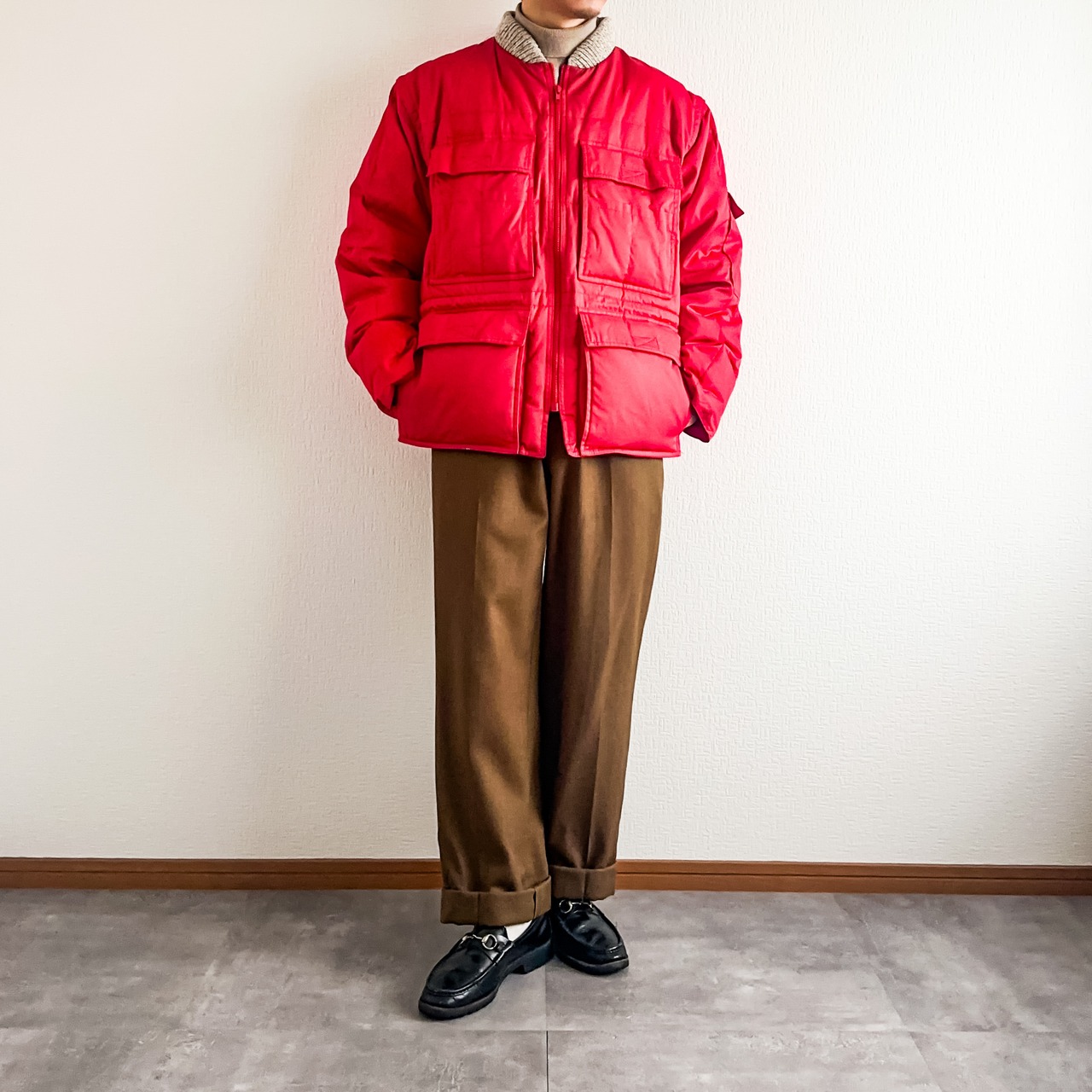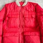 目を引くレッド系のカラーリングにフィールドジャケットポケットのデザイン。