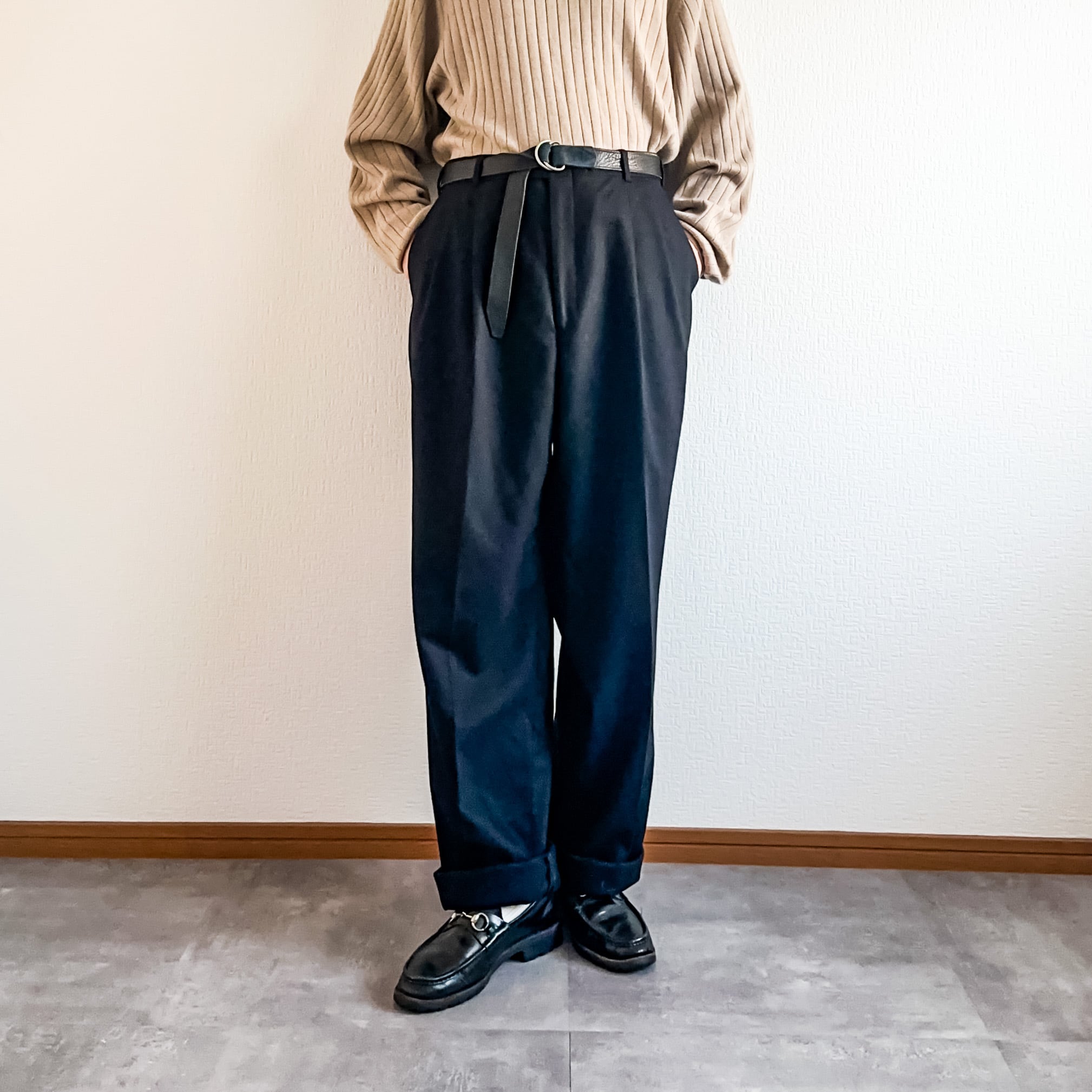 ツータックで太もも周りは比較的ゆったりめで、裾にかけて少しテーパードのかかった絶妙なシルエット。