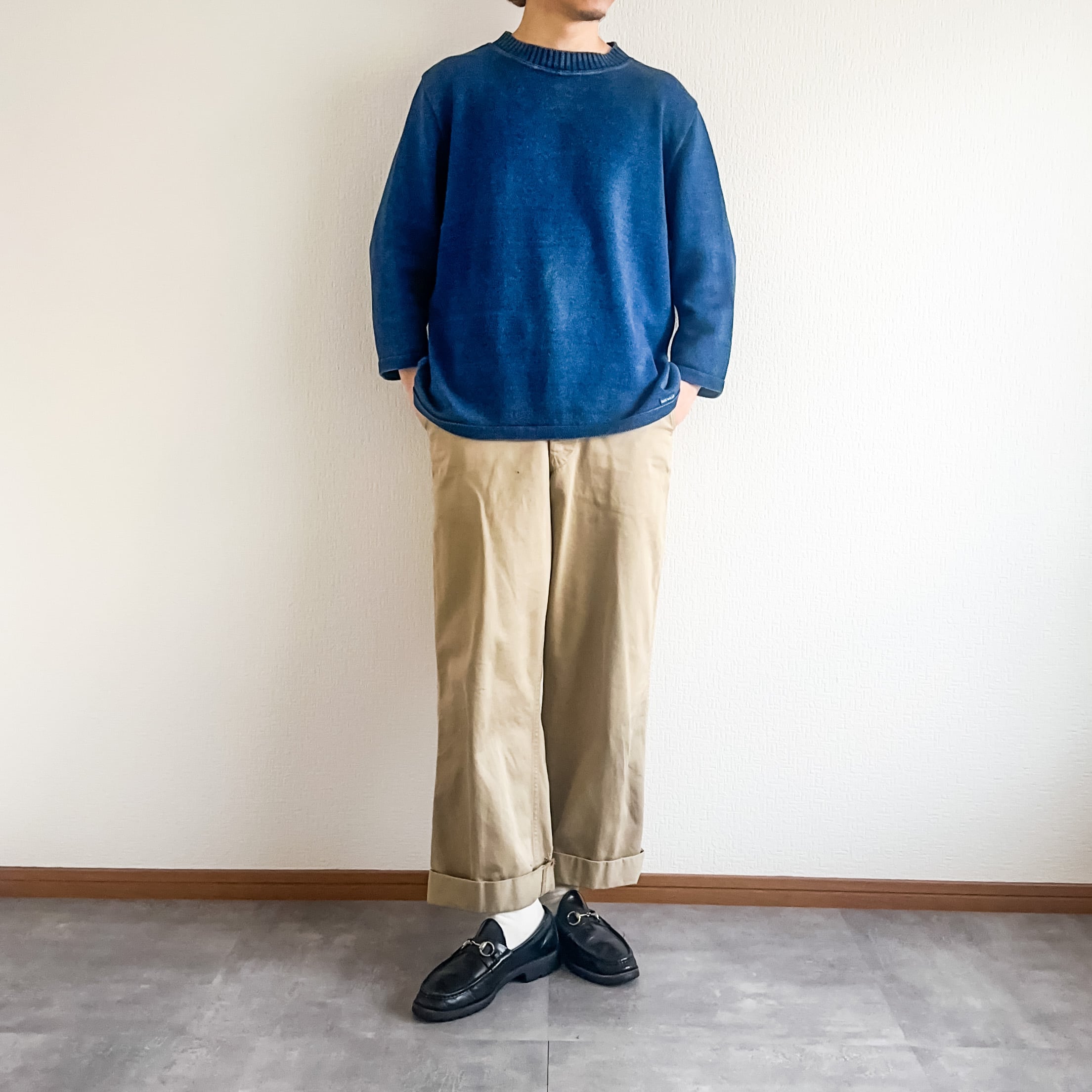 通常のコットンニットよりも薄手な印象で、袖も少し短めでカットソーにも近い印象の少し珍しい一着です。