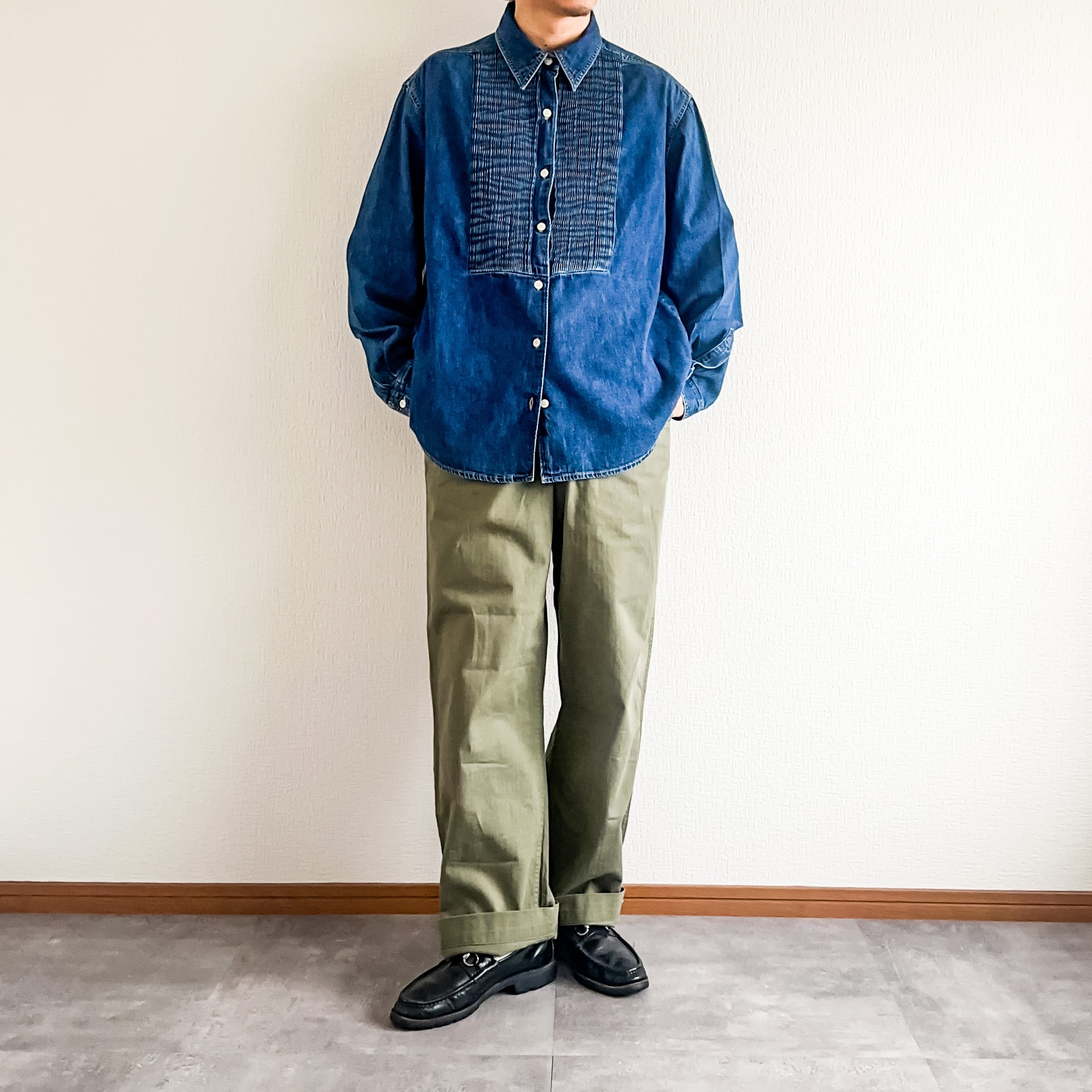 デニム素材ではかなり珍しいドレスシャツのような胸元はプリーツデザインになった素晴らしい一着です。
