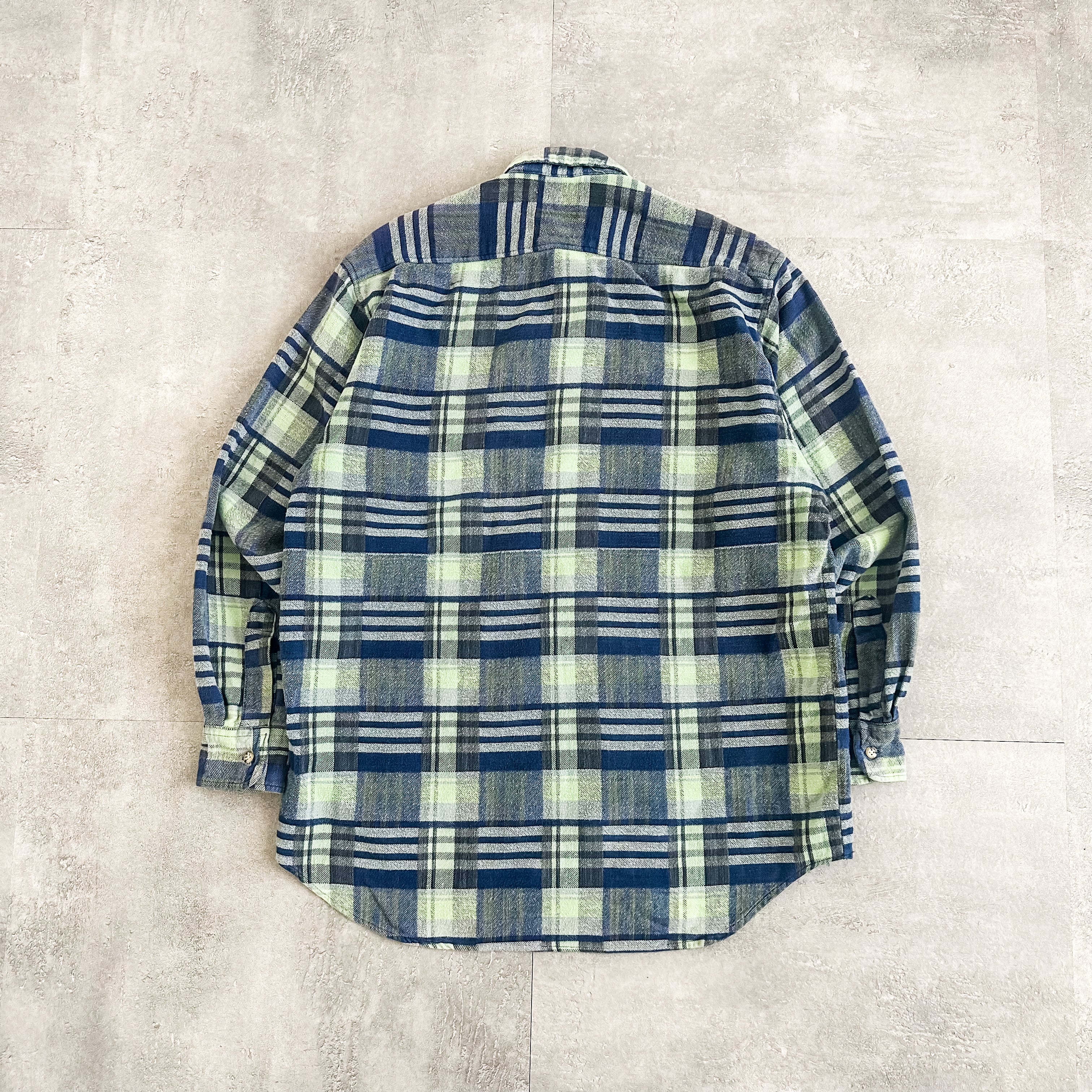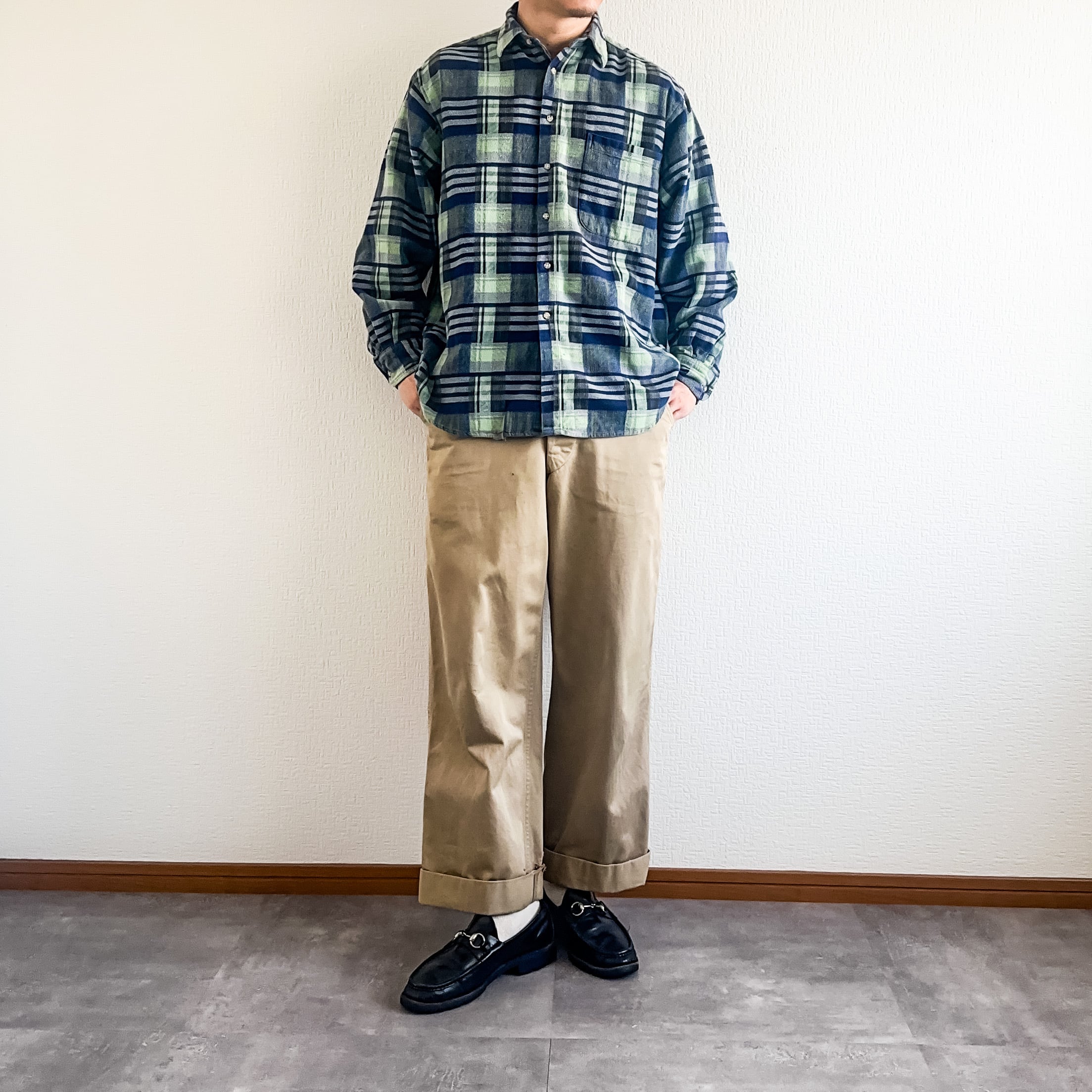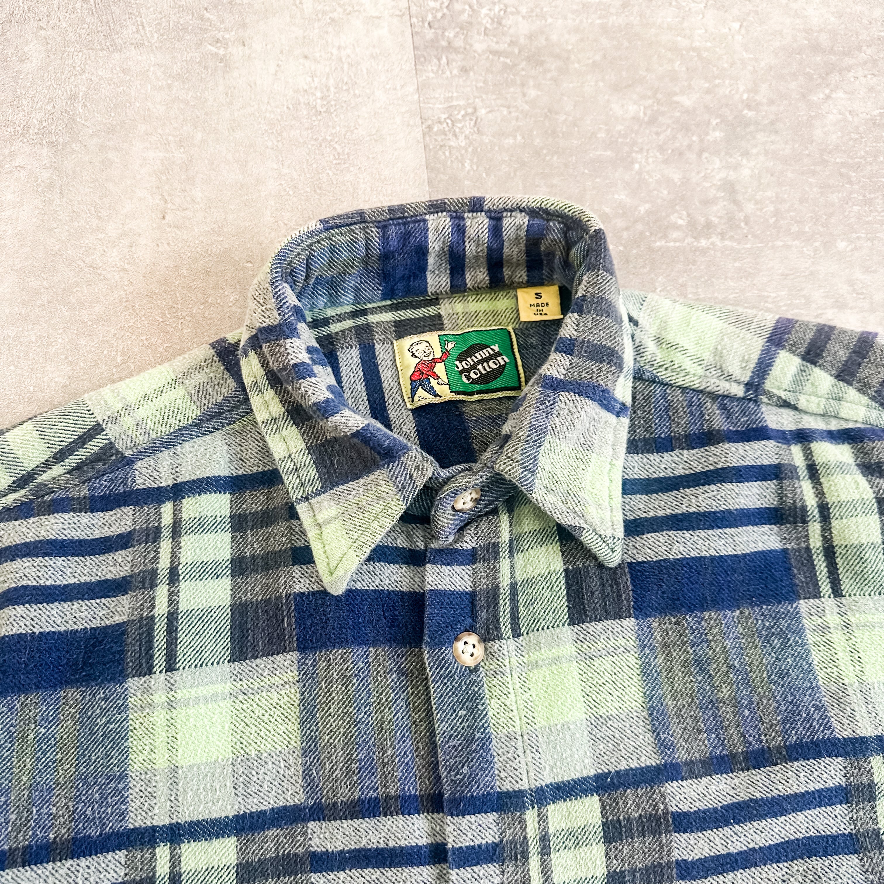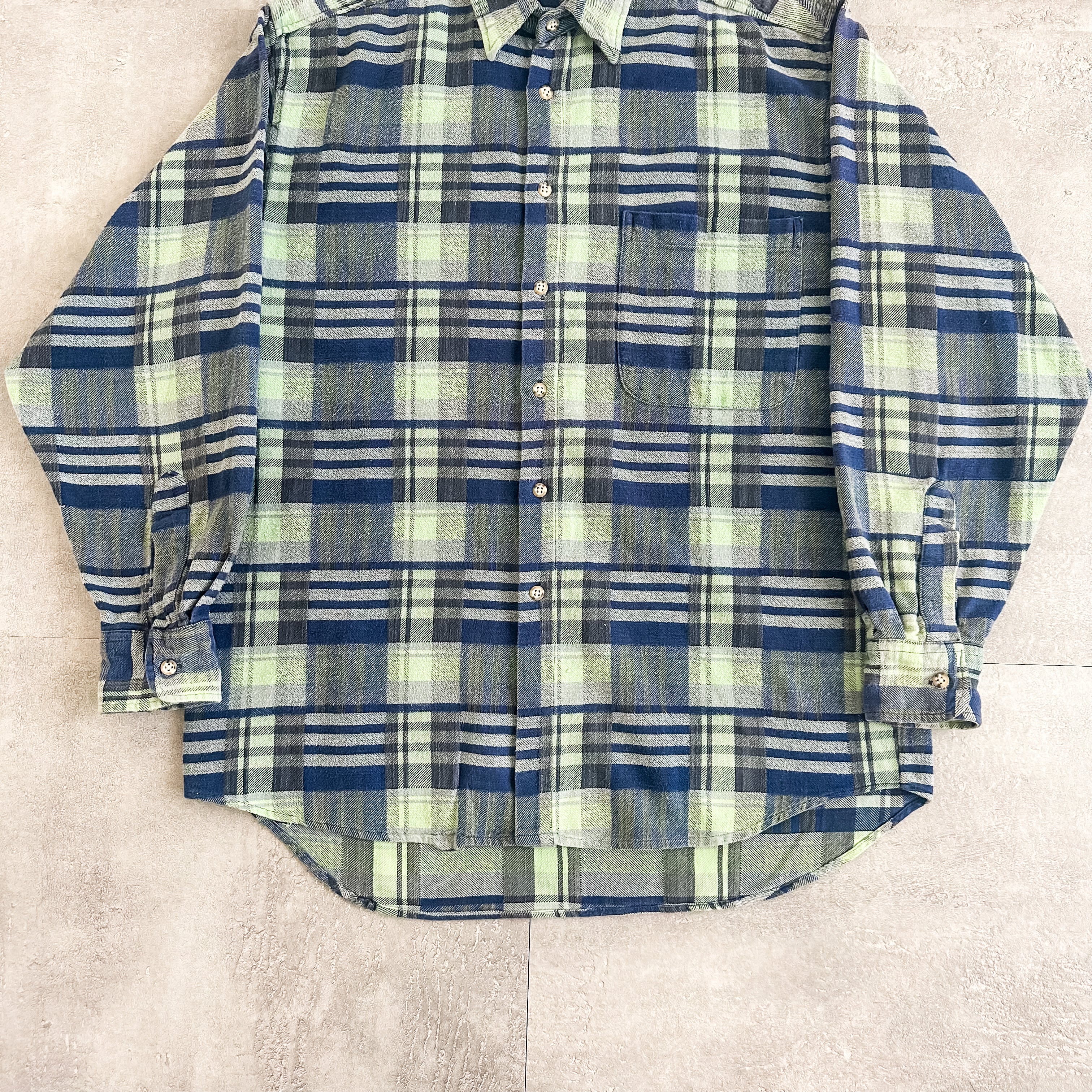 ネルシャツではあまり見かけない蛍光グリーンの入った配色のチェック柄がグッドな一枚です。