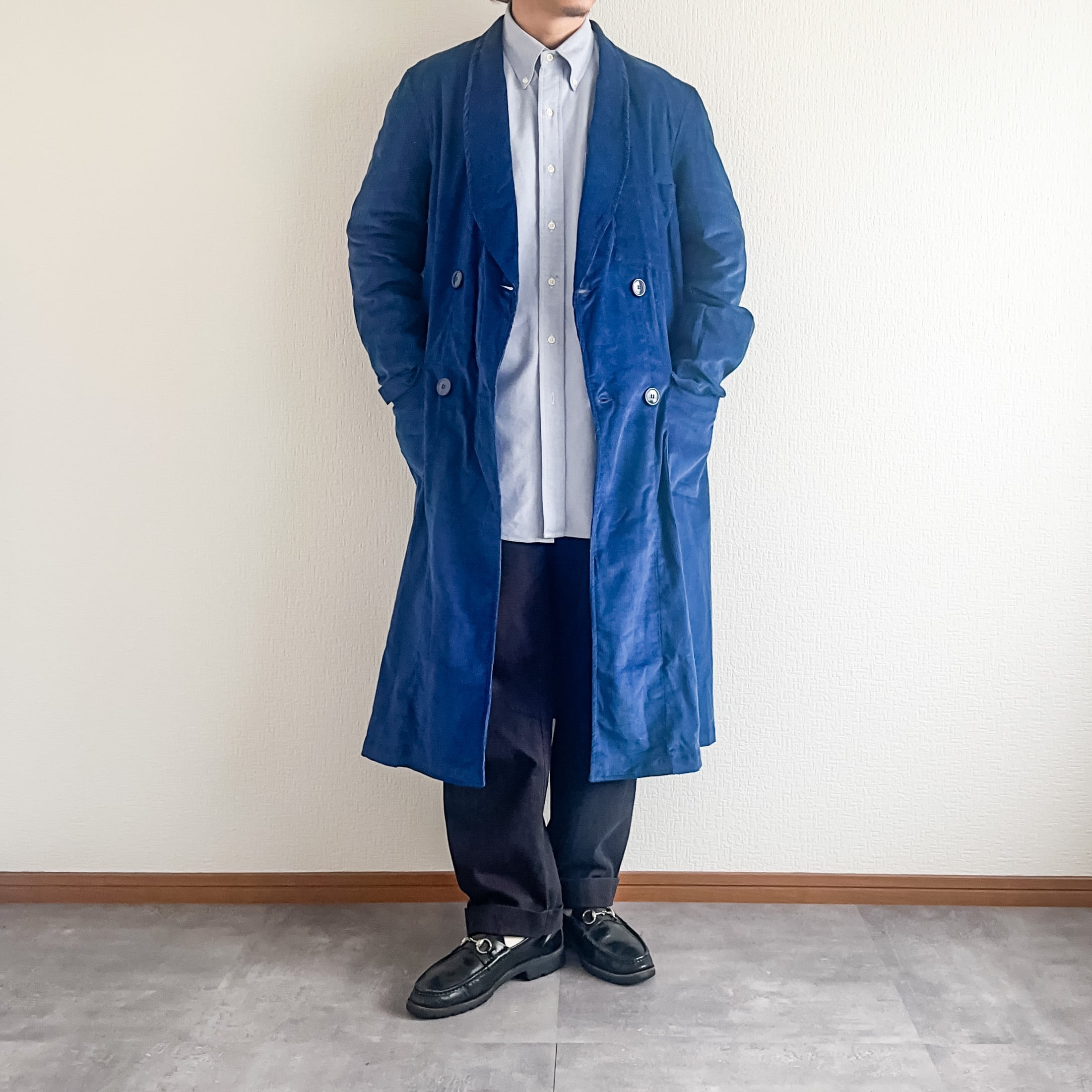 ショールカラーでフロントはダブルブレスト、ロング丈と非常に洒落たアイテムです。