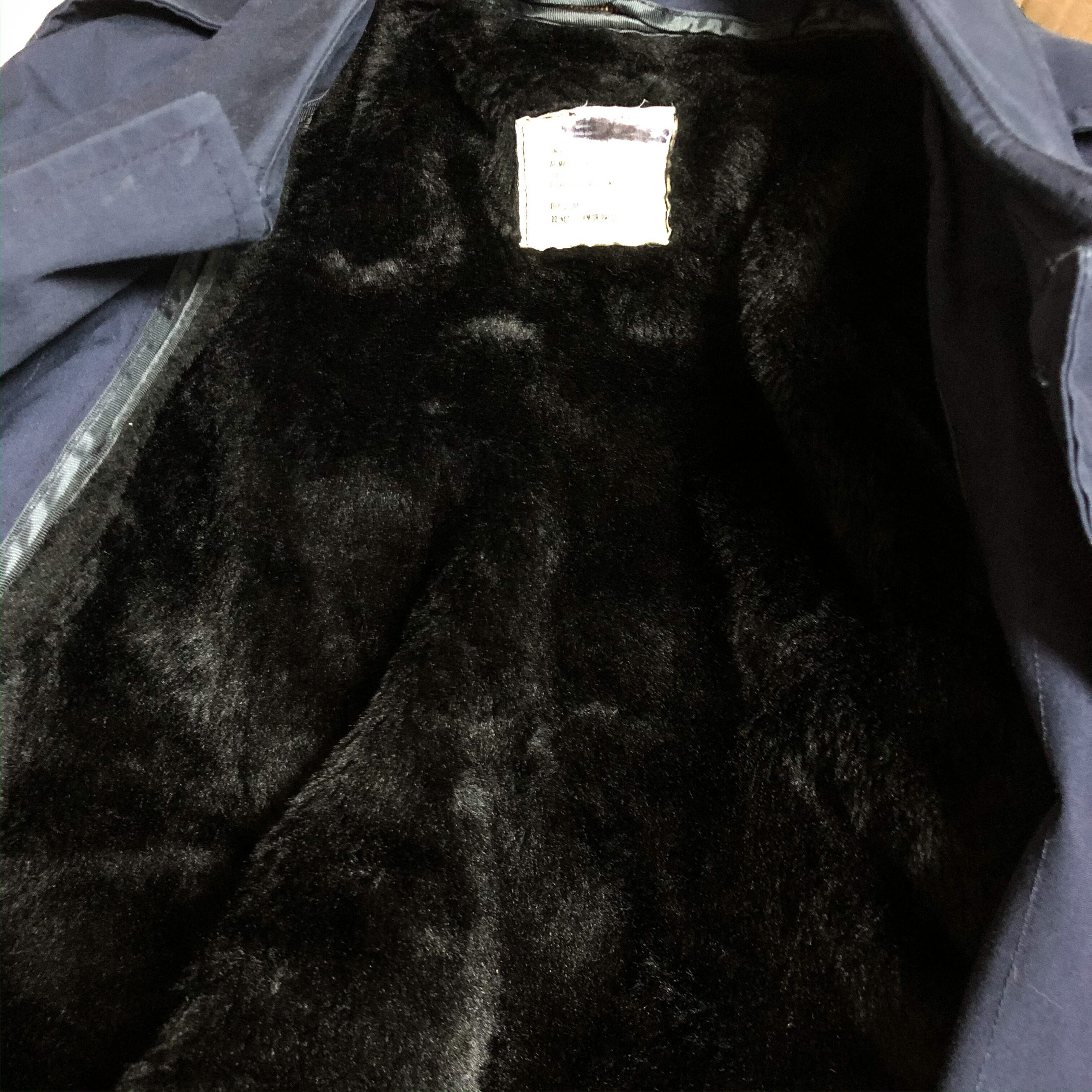 生地は張りとコシのあるコットン・ポリエステル混紡生地で、取り外しのできる黒のボアライナー付きで防寒性にも優れています。