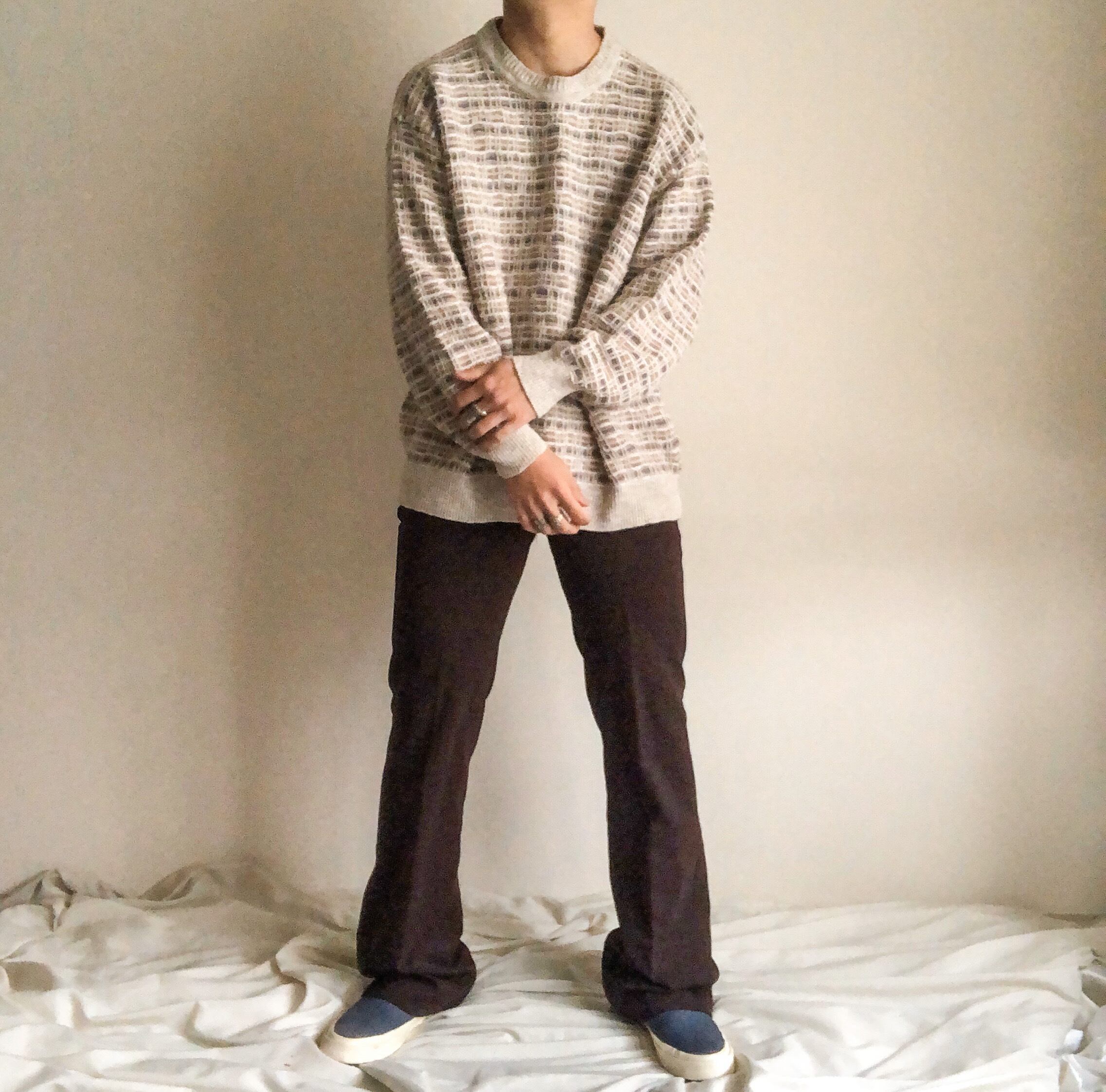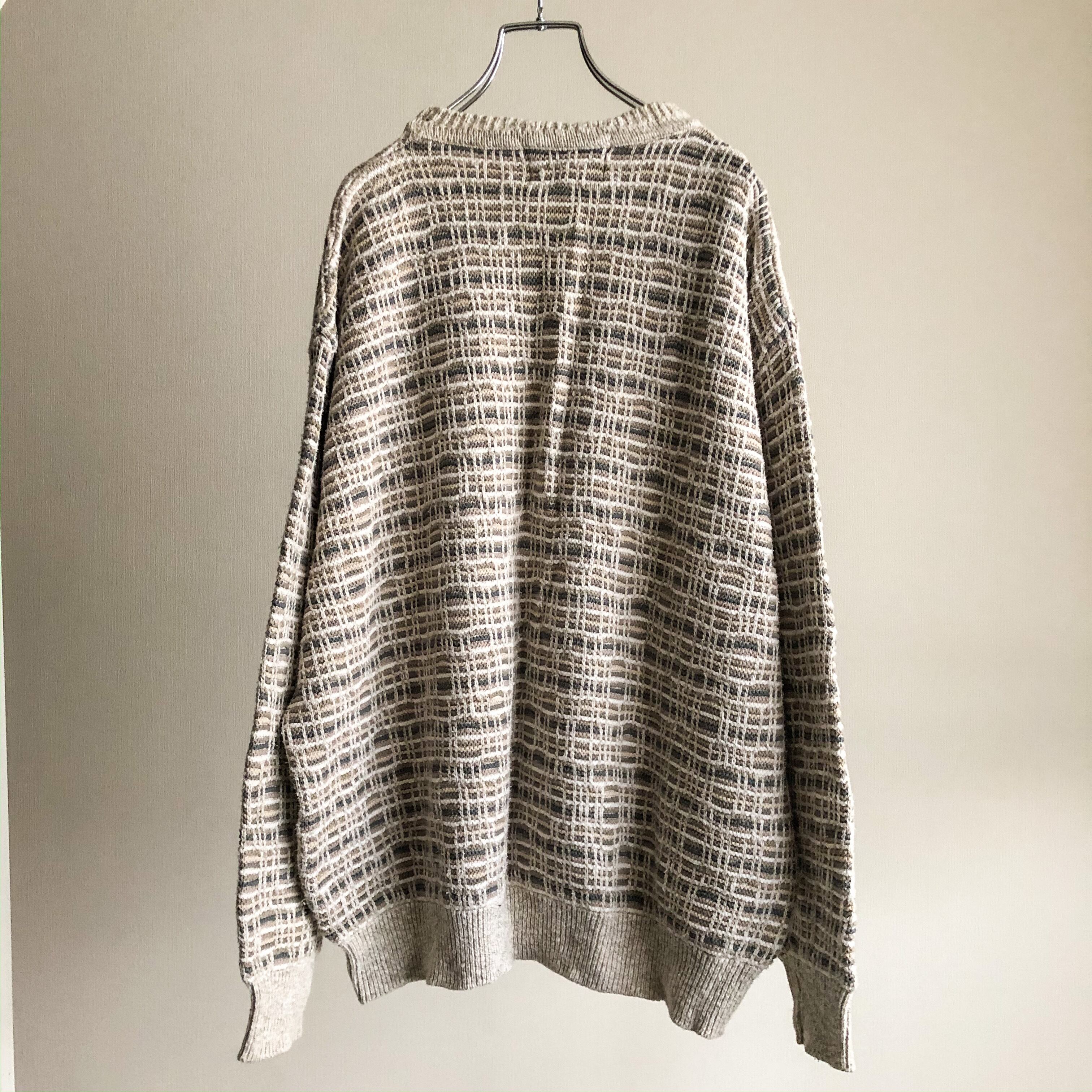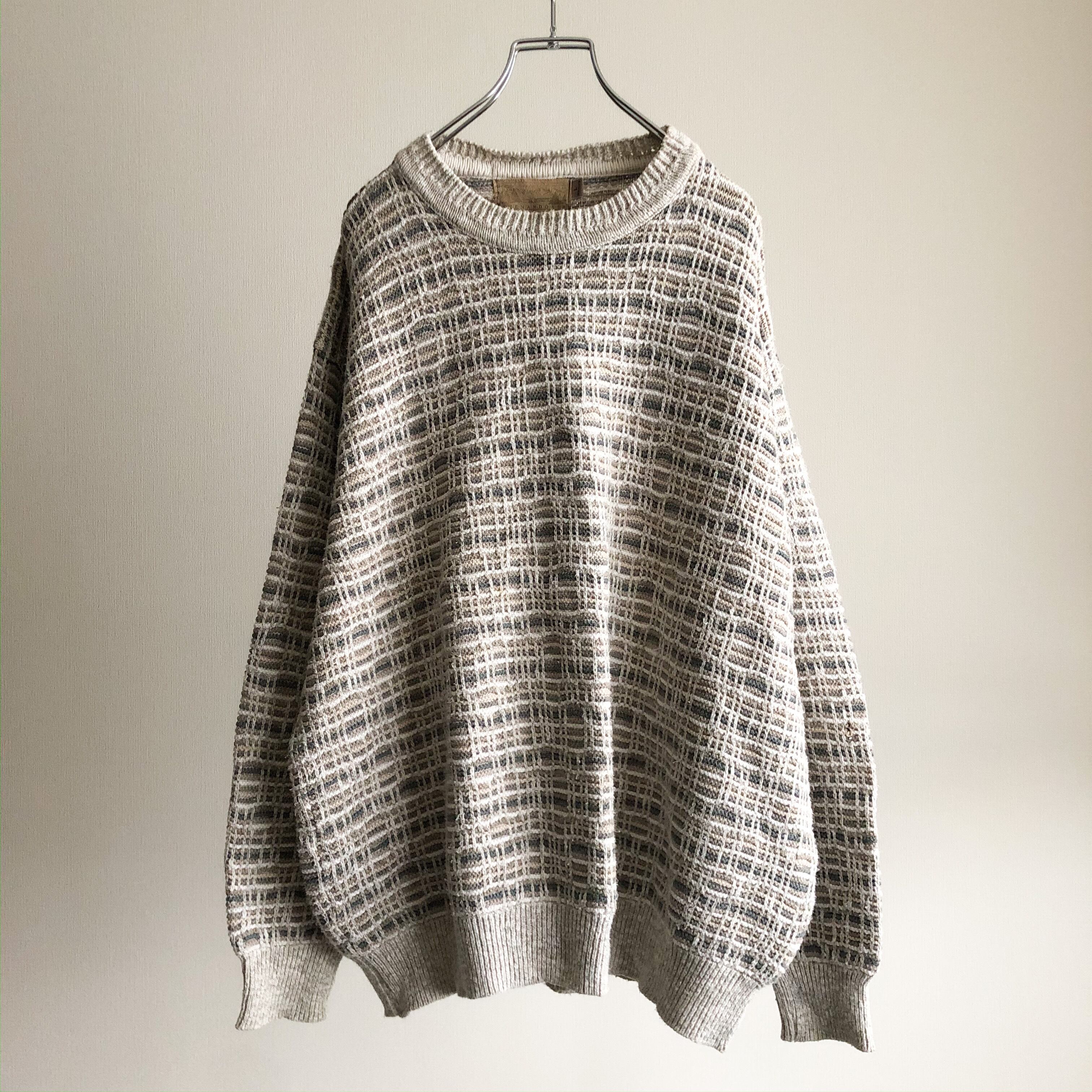 特徴 :複数の縦の線と横の線が交差した格子状の独特な編みのパターンが素晴らしい80年代頃の総柄セーター。