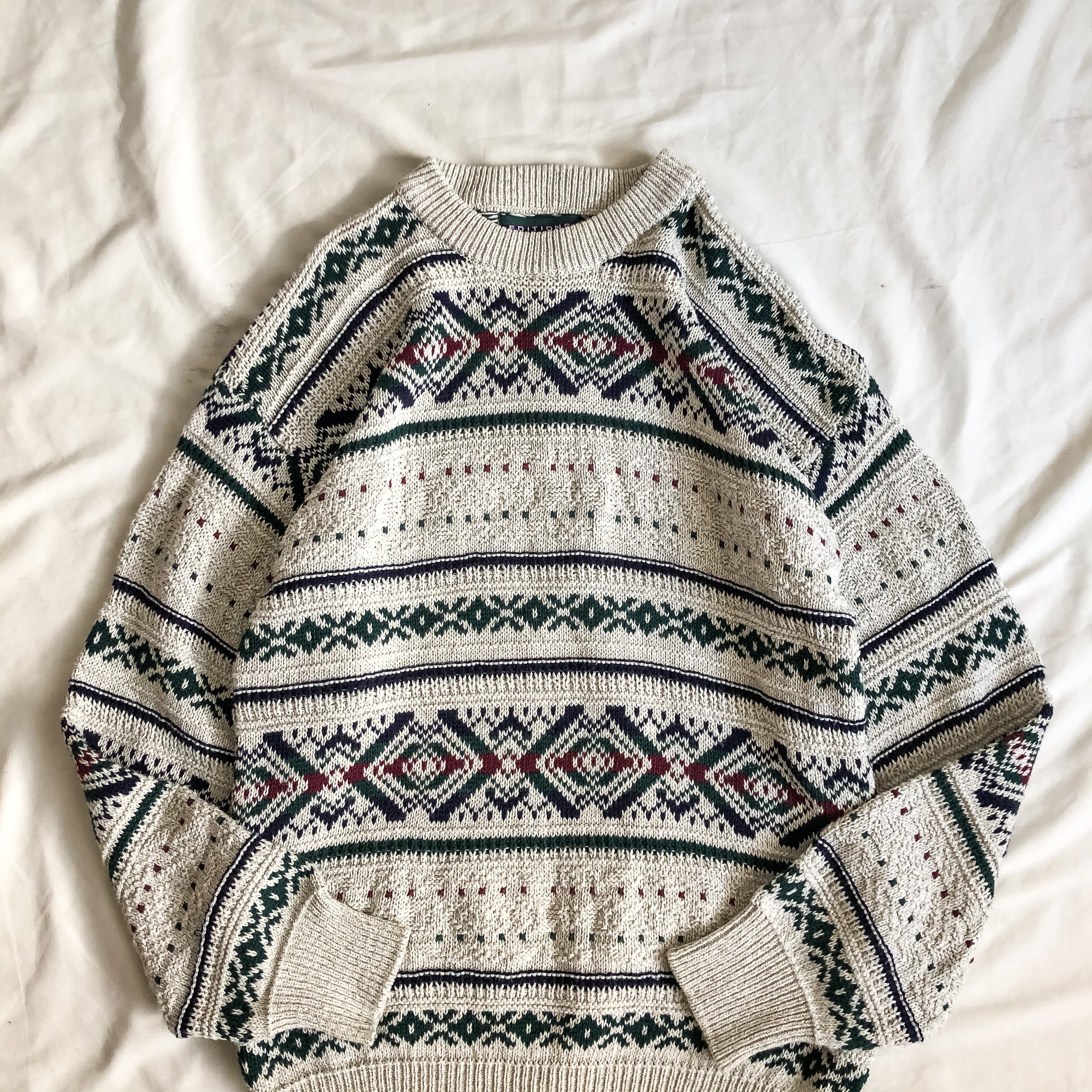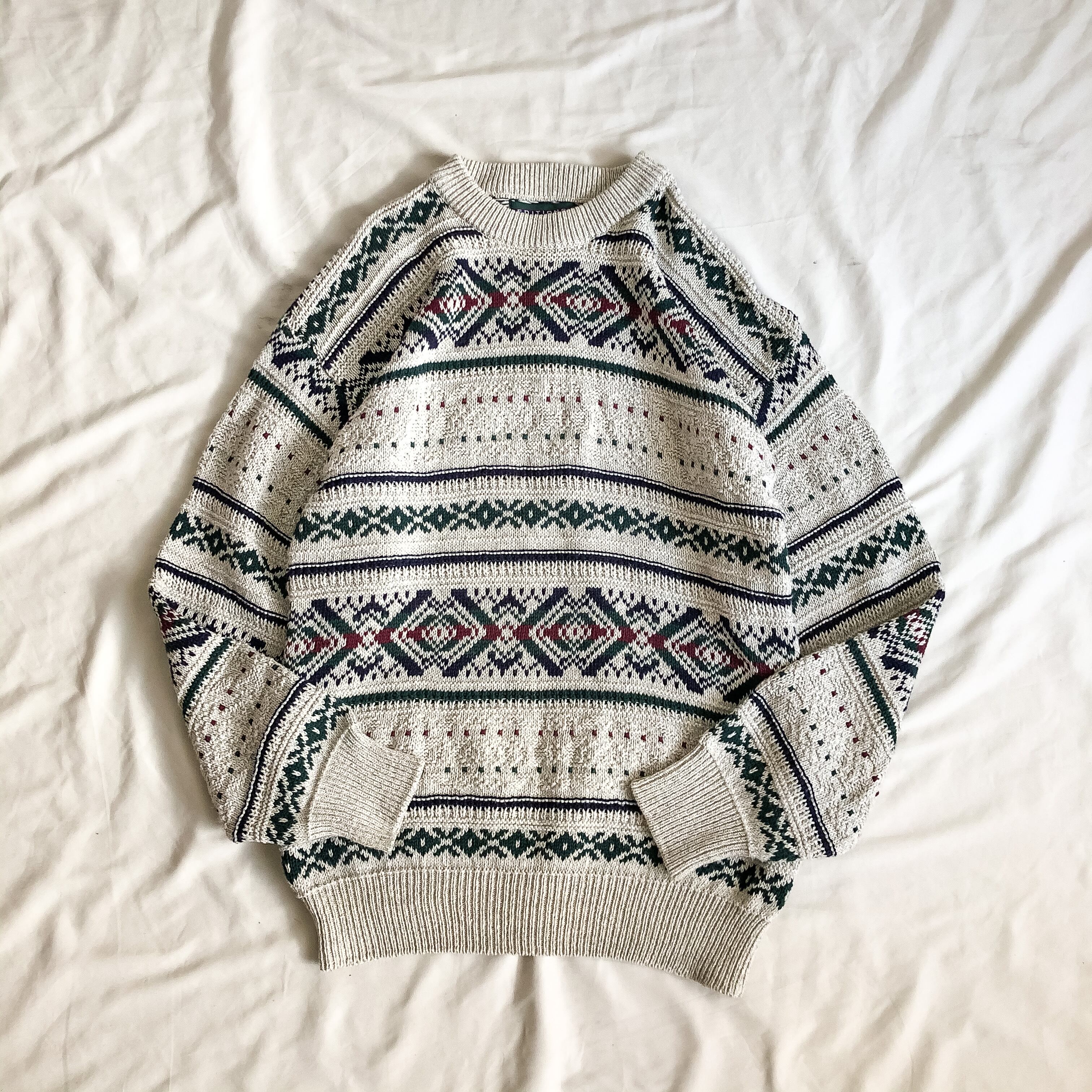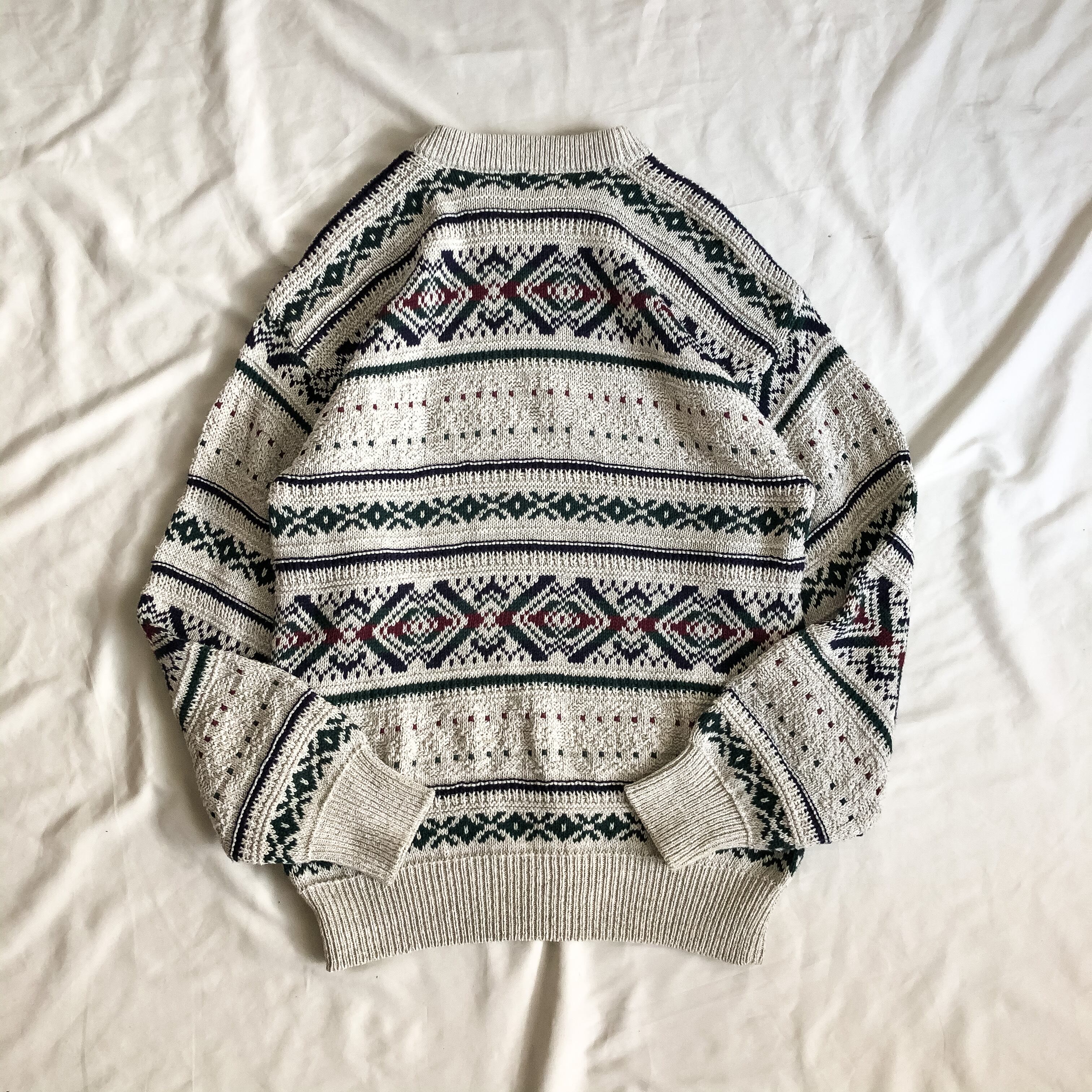 特徴 :ホワイトベースに柄のテキスタイルや編みの面白いコットンセーター。
