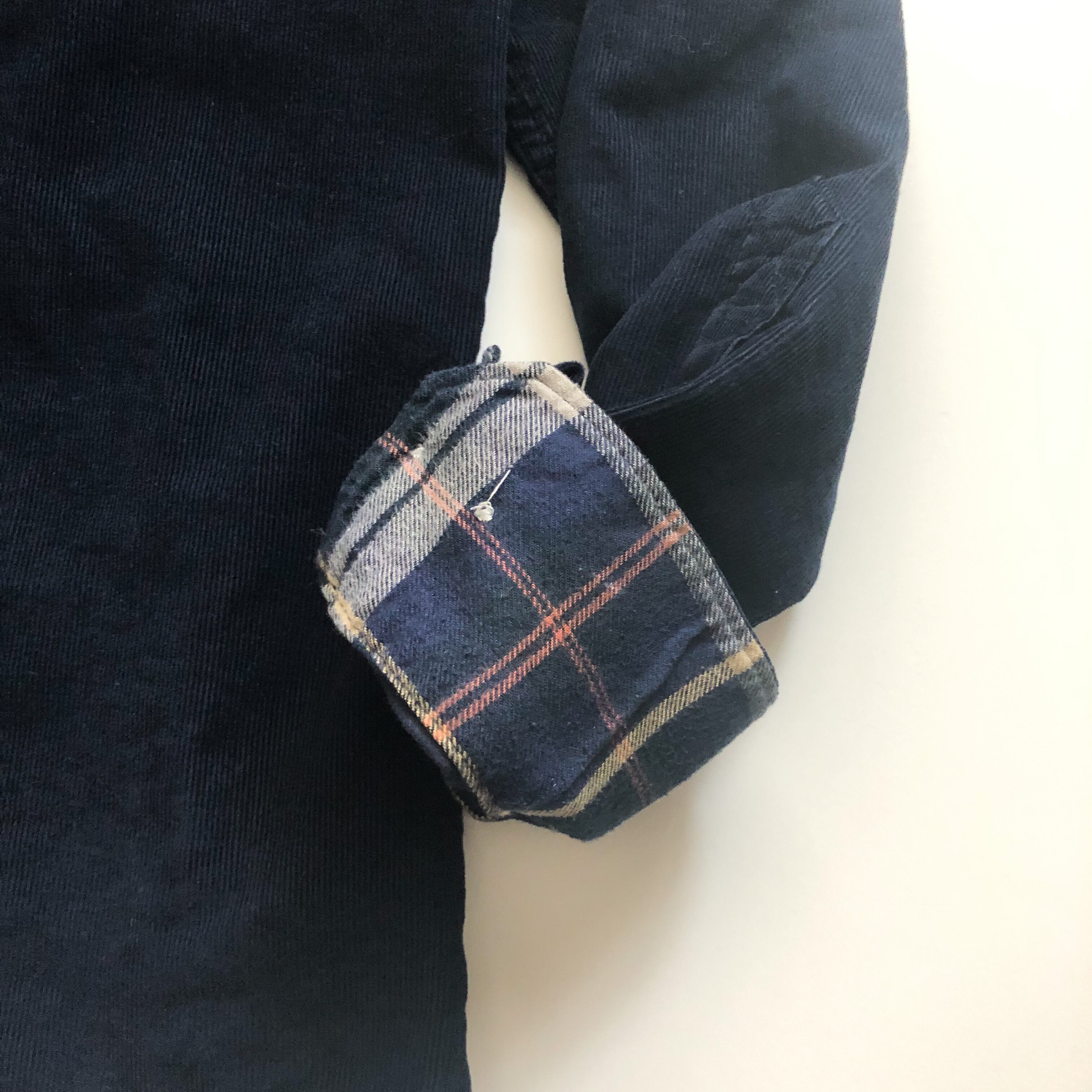 濃いネイビーボディーにボタンダウンのシンプルなコーデュロイシャツ。