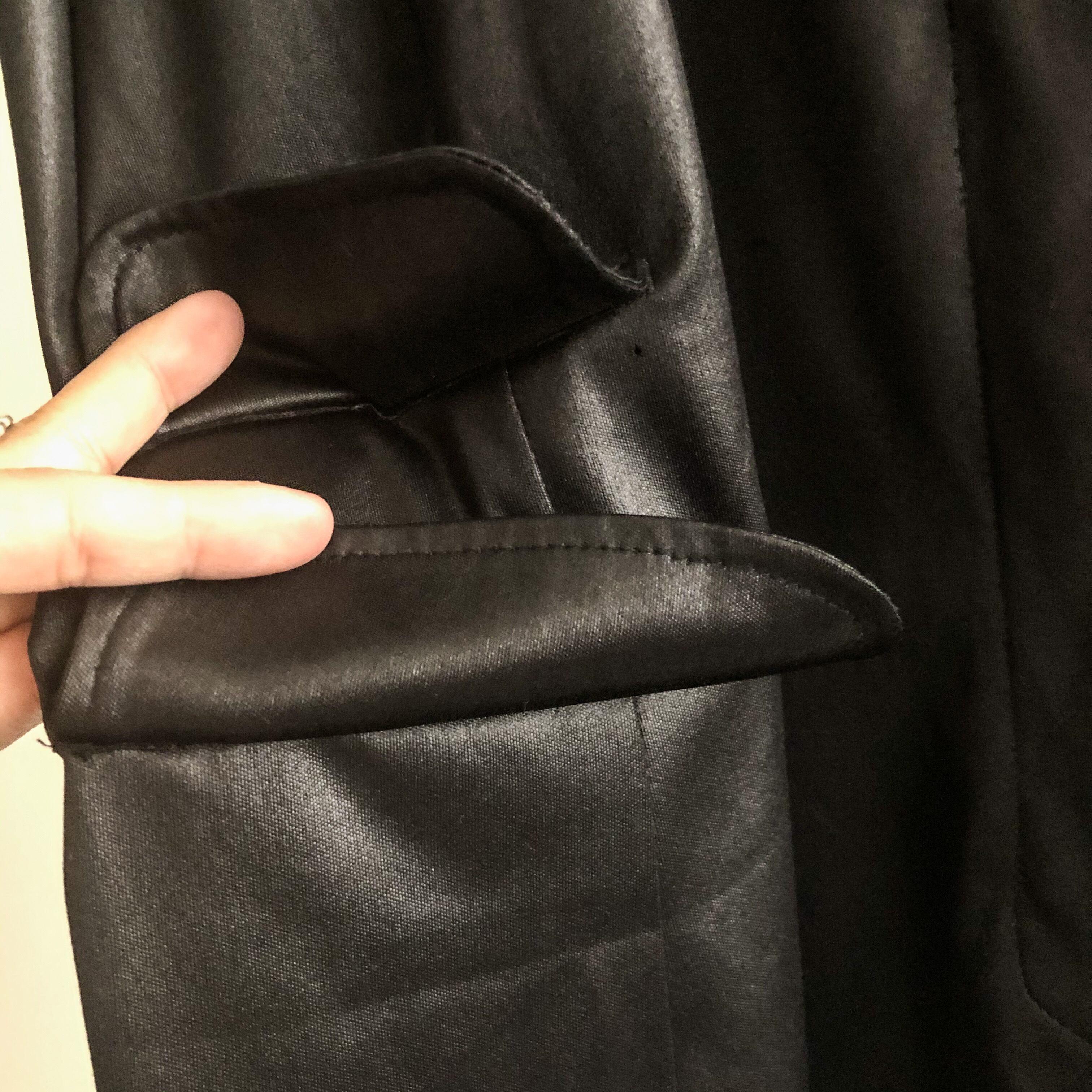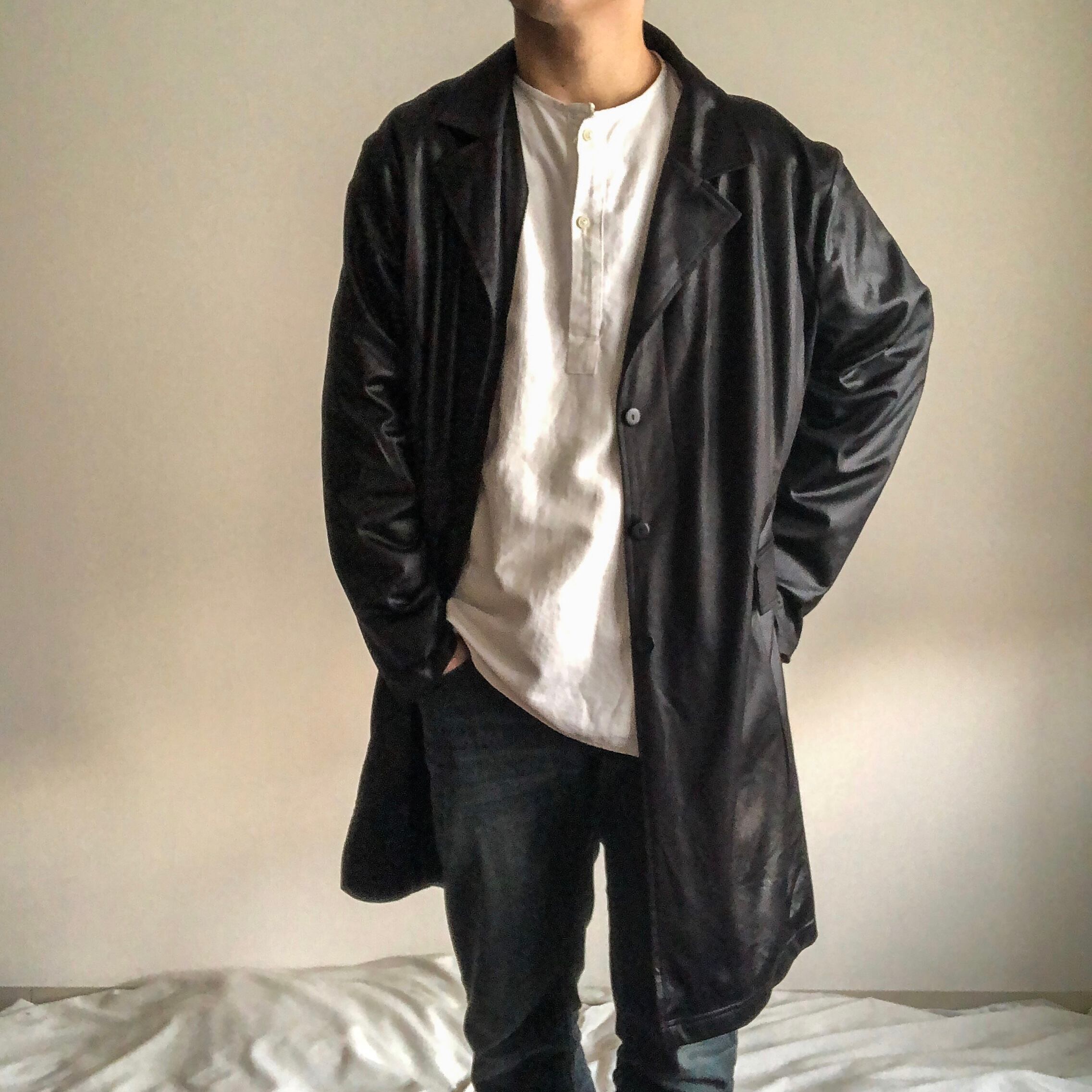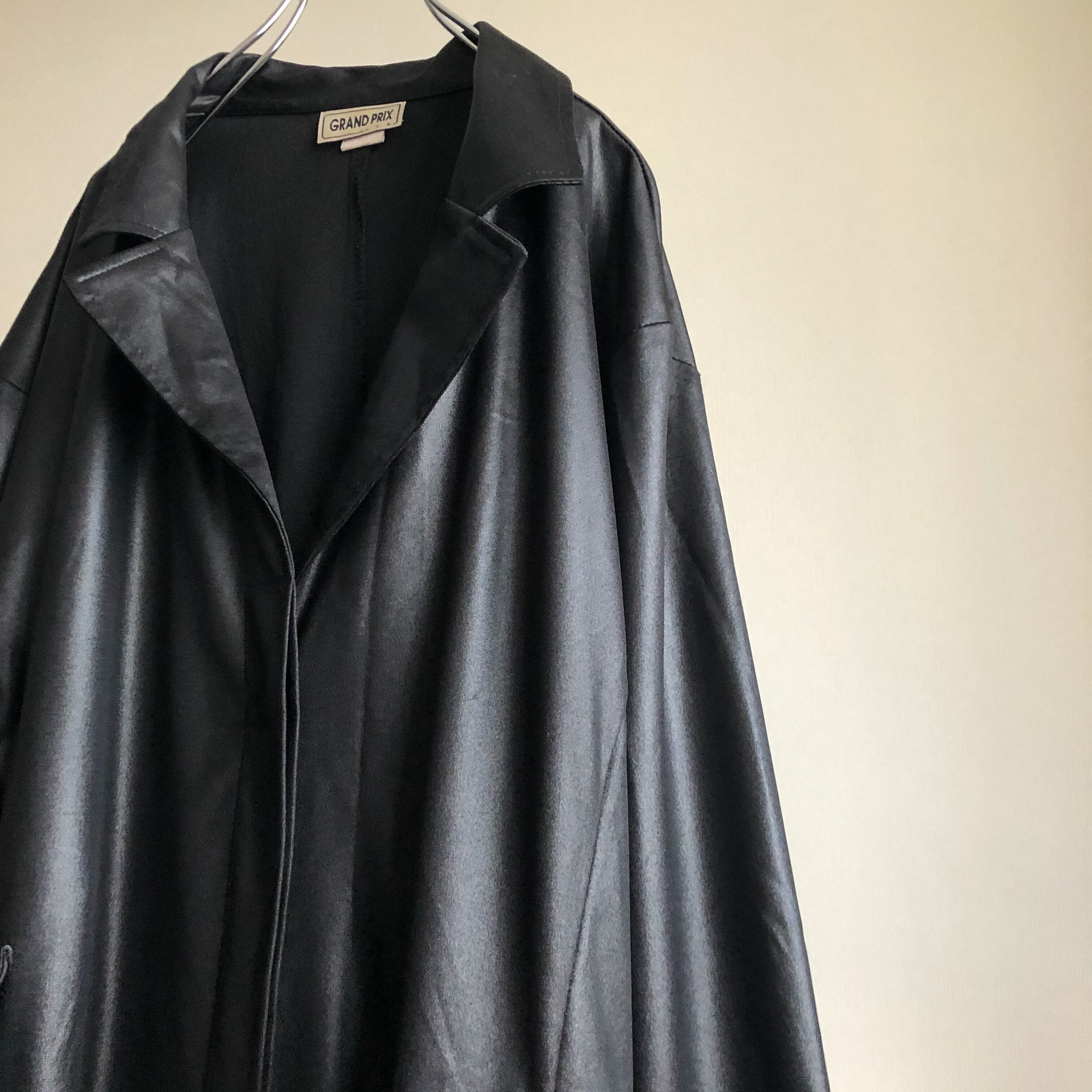 特徴 :光沢感のある独特な表情のブラックカラーがクールなオープンカラーコート。