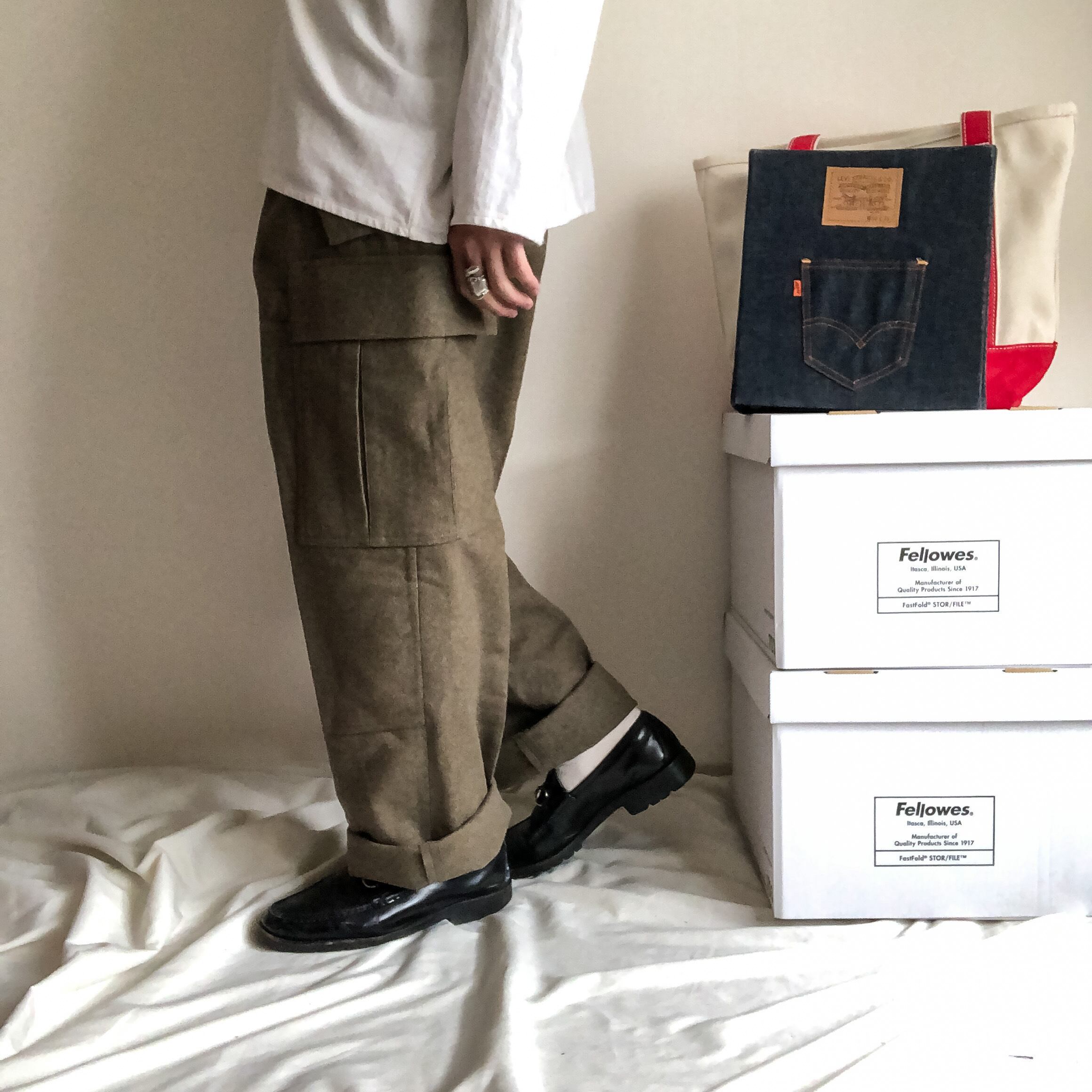 メルトンウール地のカーゴポケットに、腿から膝下にかけて二重生地になったダブルニーも珍しいディテールかと。