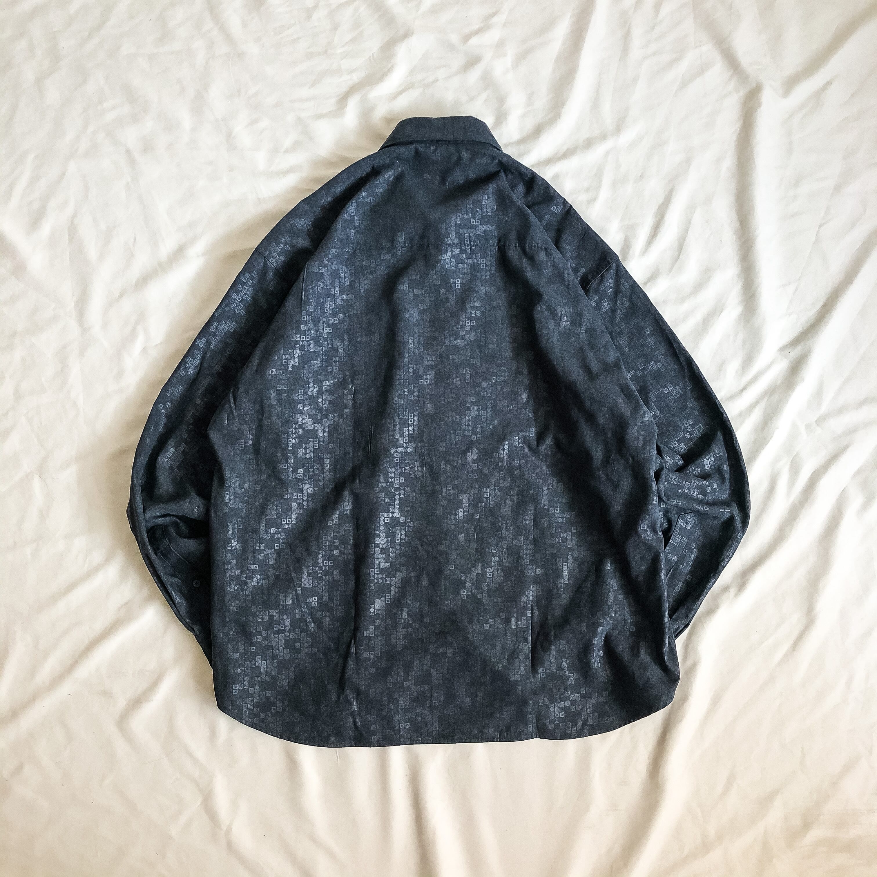 特徴 :ダークグレー系のカラーリングに、デジタルカモのようなテキスタイルがgoodな総柄シャツ。