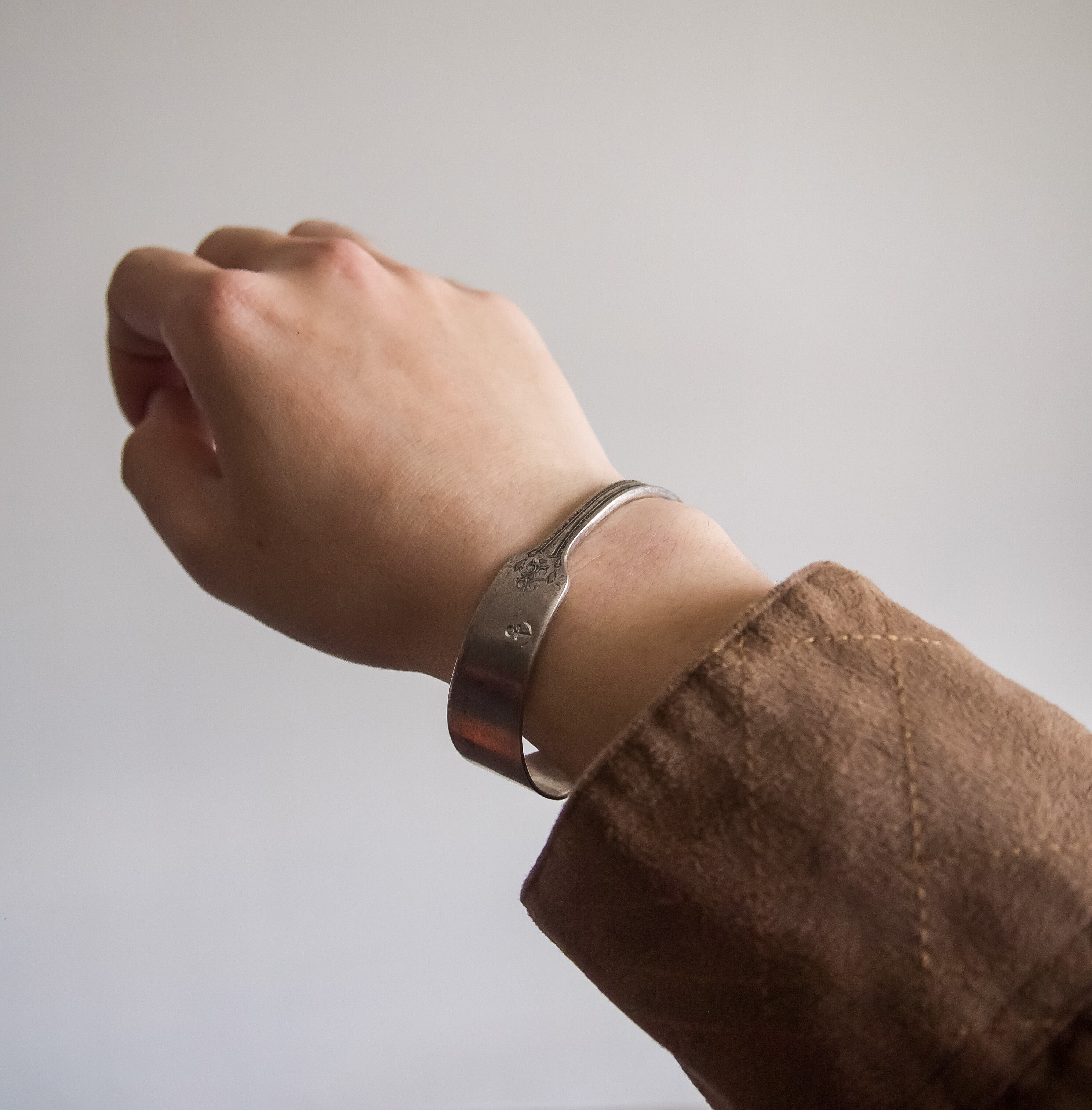 特徴 :シルバーのバターナイフを曲げてバングルにリメイクされた洒落たシルバーバングル。