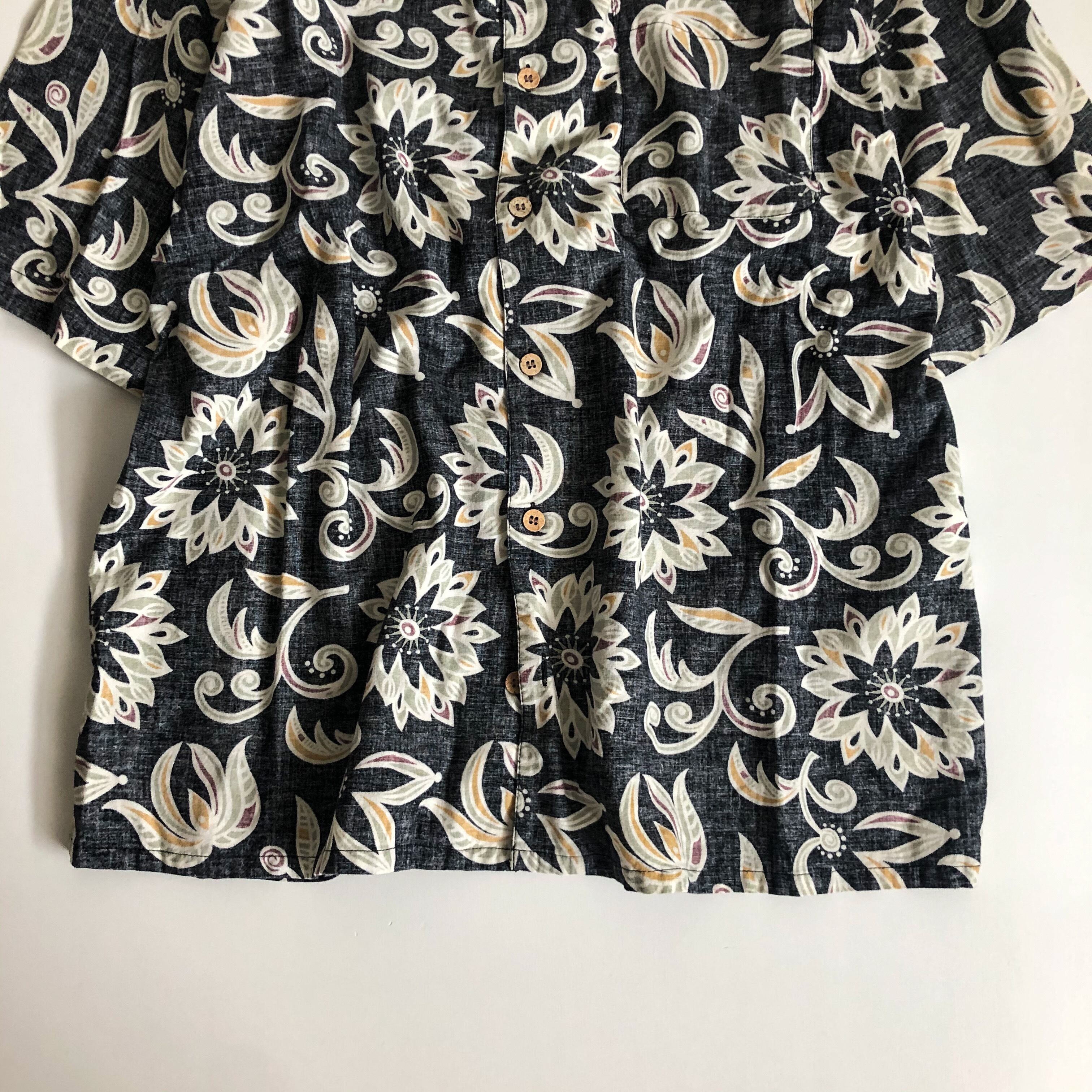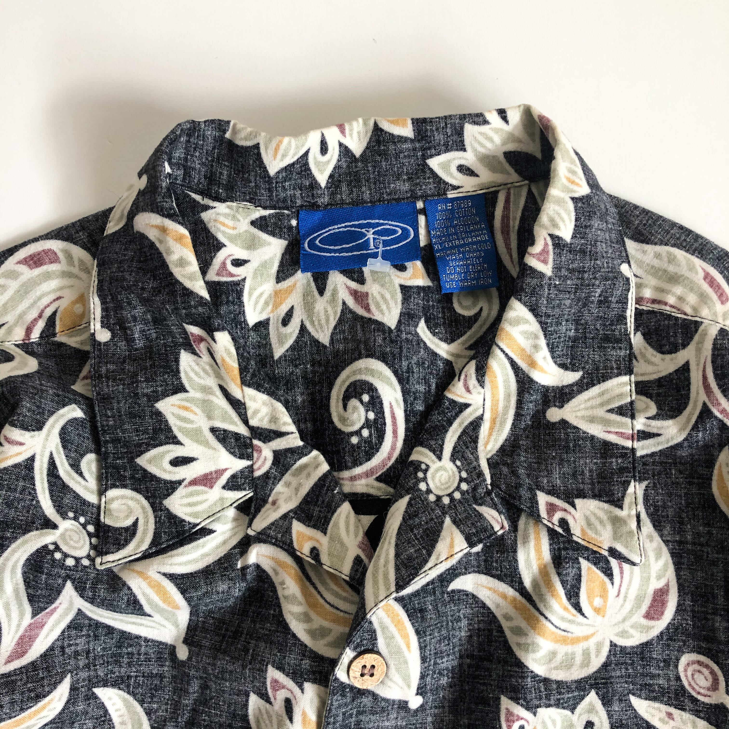 特徴 :オープンカラーに少し暗めのベースに花柄のテキスタイルがグッドな"OP"のハワイアンシャツ。
