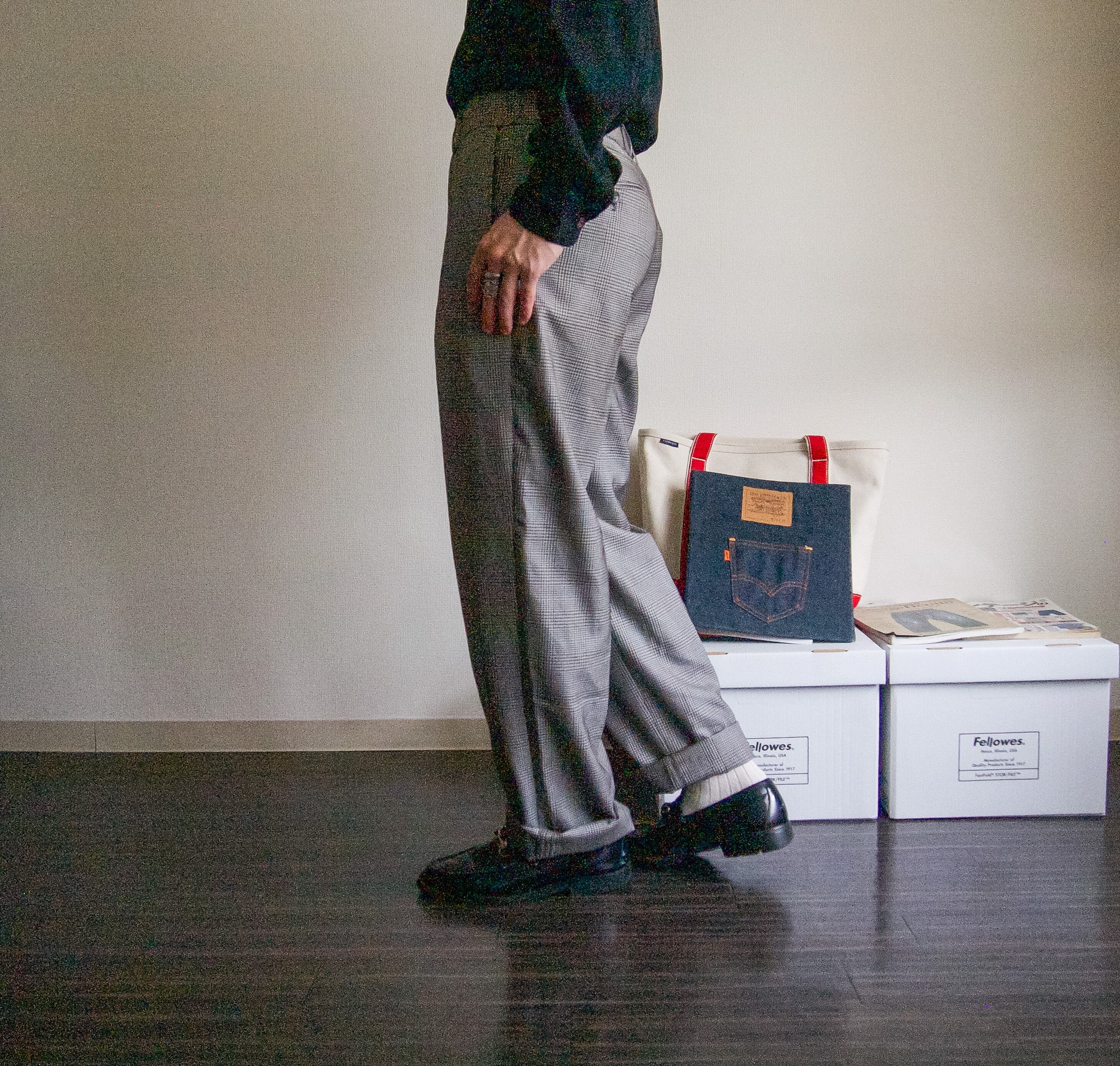特徴 :ブルーの入った配色の良いグレンチェックがgoodなスラックスパンツ。