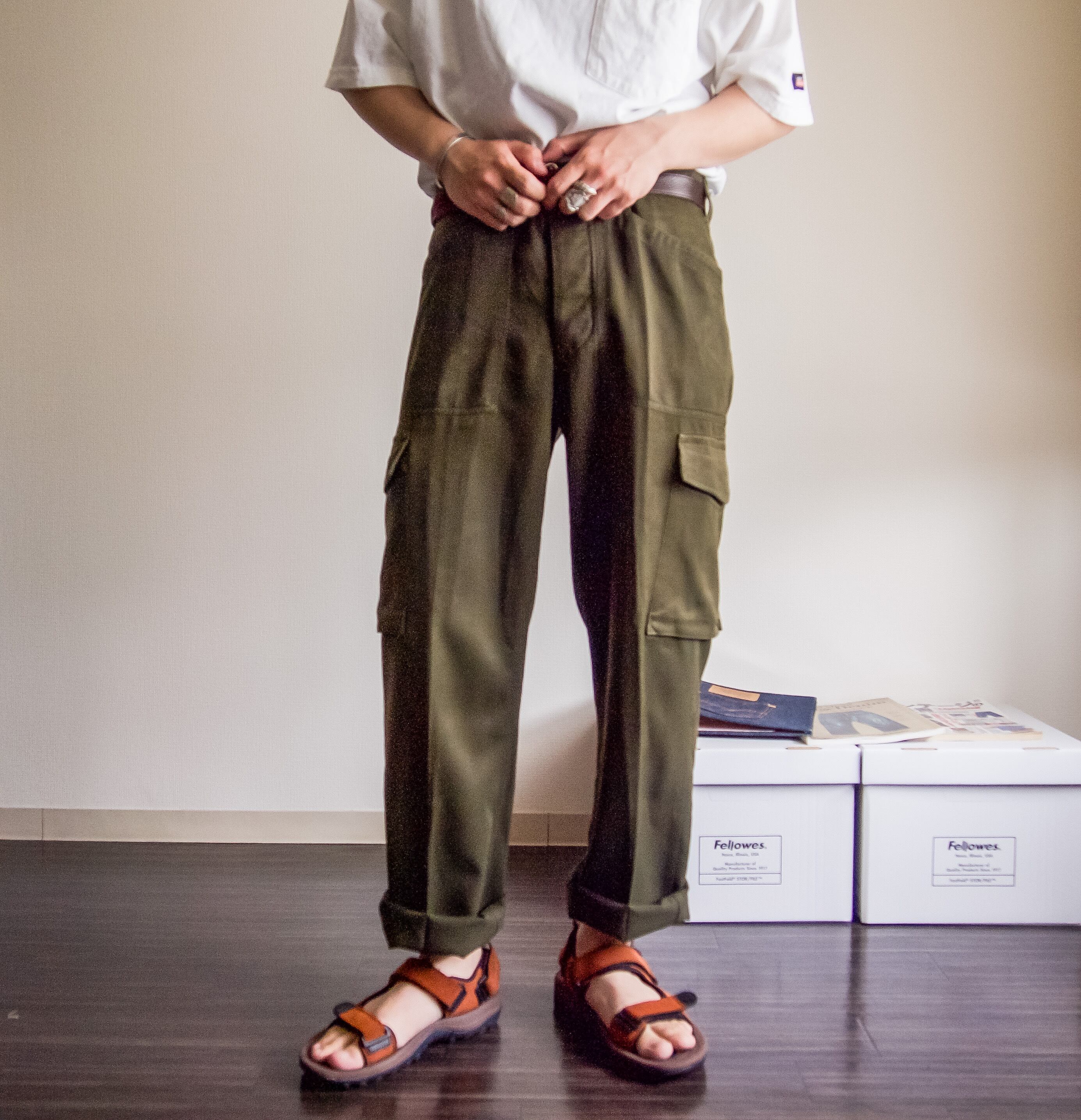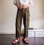 裾にかけてテーパードのかかる綺麗なシルエットと独特なデザインがファッション的に見ても非常に洒落ていて、ミリタリーらしさもありつつ、素材感やシルエットなどはデザイナーズのような一本。