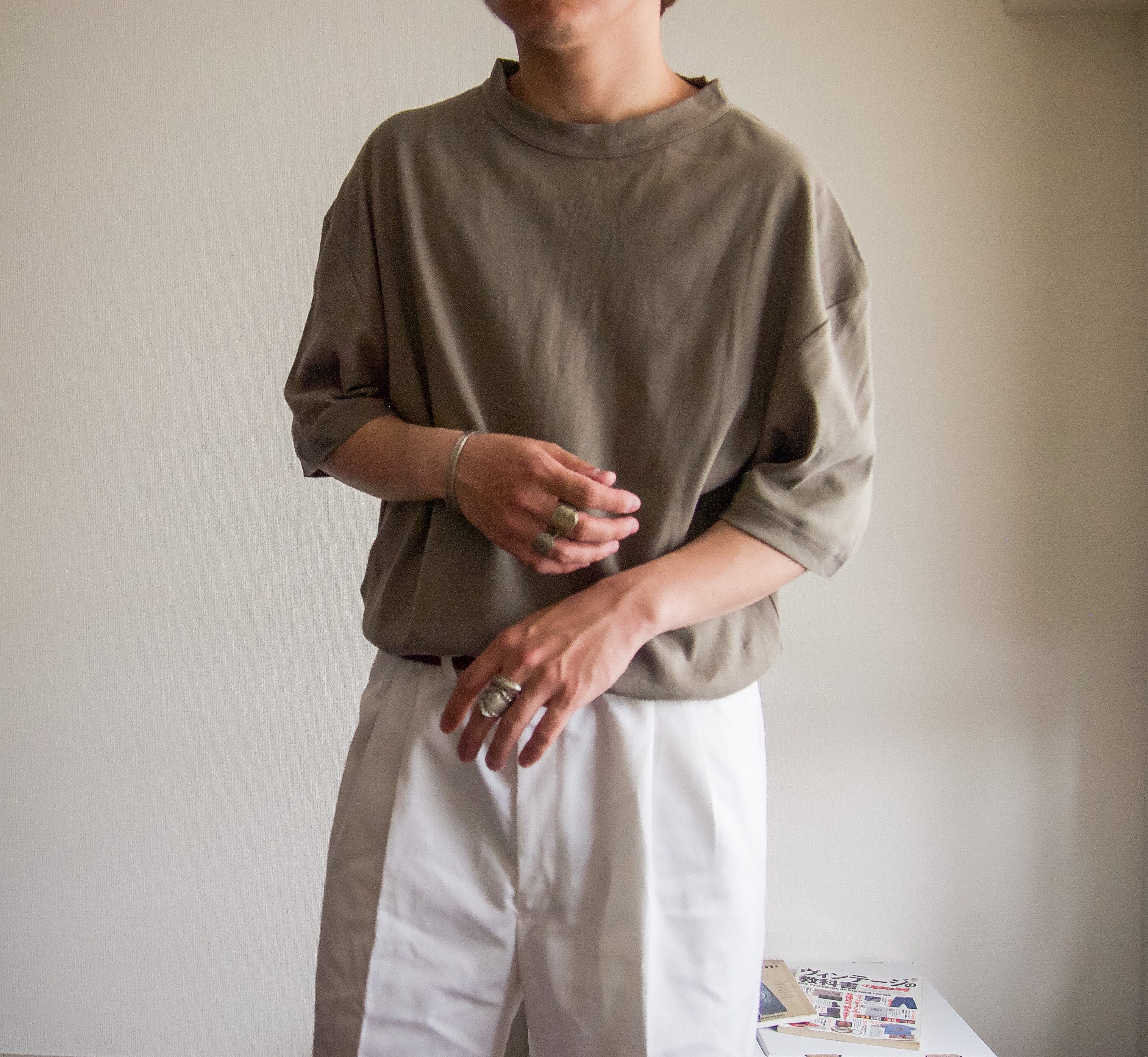 柔らかく肩に乗って緩やかに落ちる生地は、程よい厚みを持った、横に伸縮性を持つフライス生地でストレスフリーな着心地なのも素晴らしい。