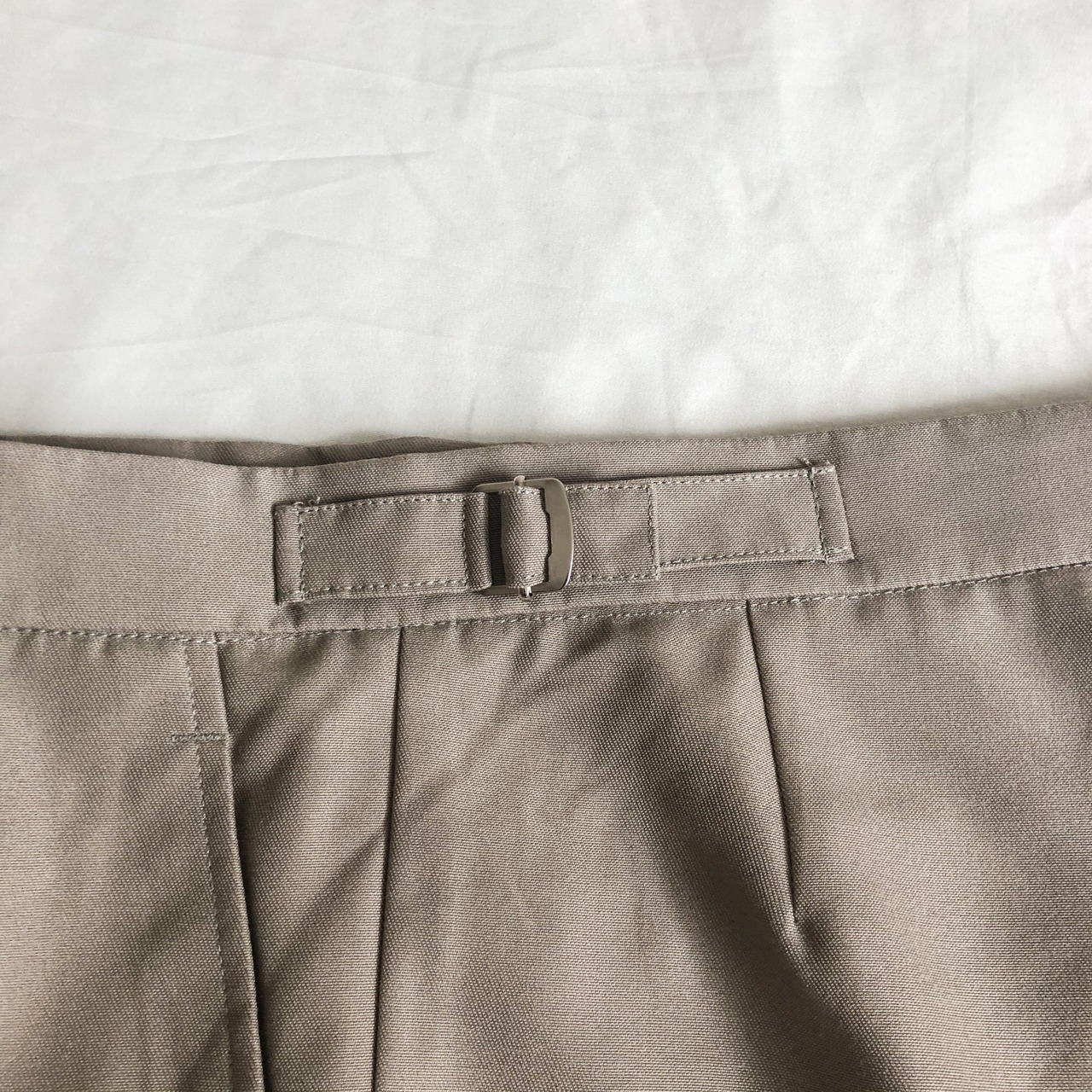 絶妙なシルエットと丈感で、落ち着いたストーンカラーがイギリスらしい雰囲気の一本です。
