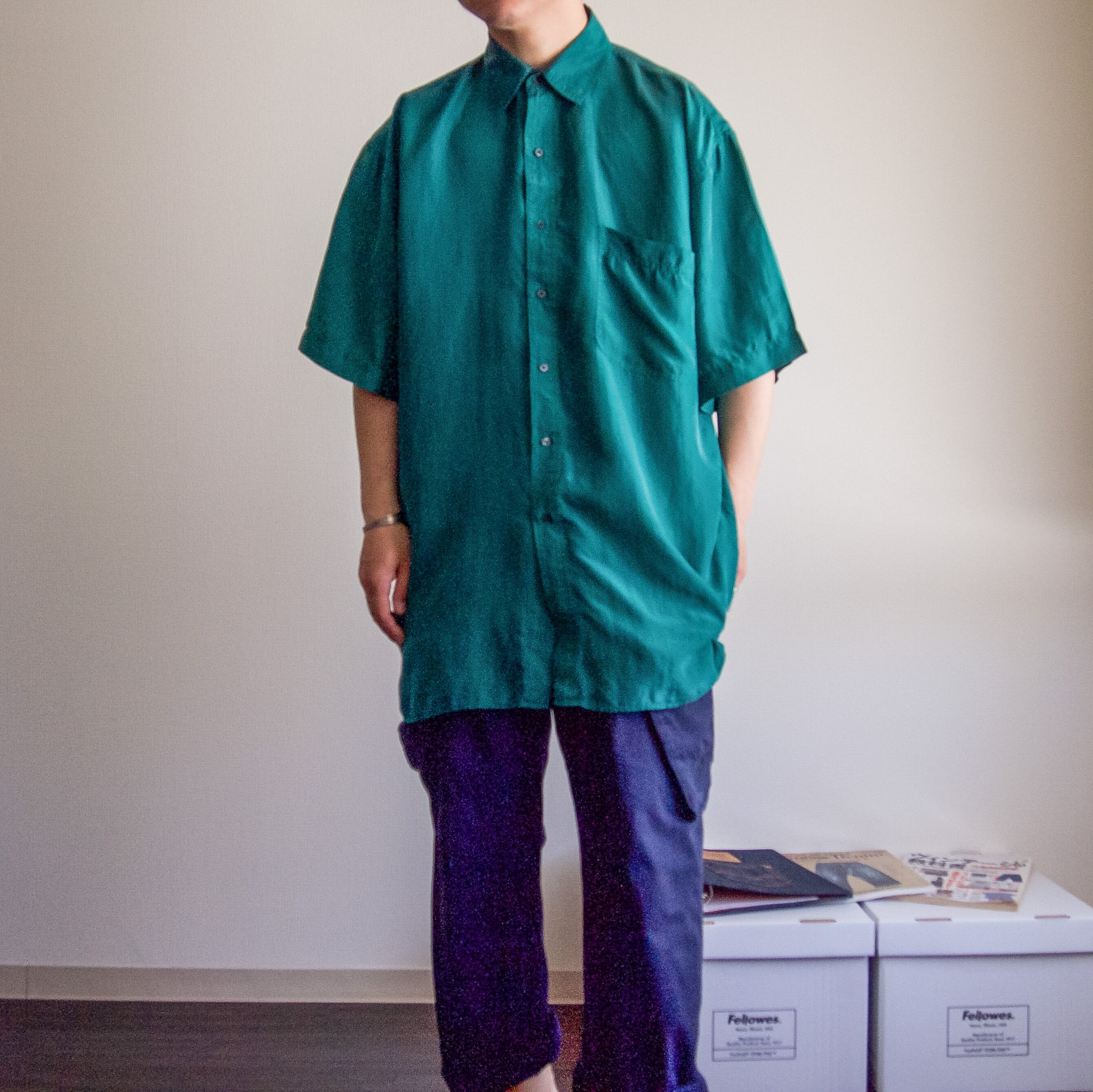 特徴 :光沢感のある独特なグリーンカラーがナイスな90年代頃のシルクシャツ。