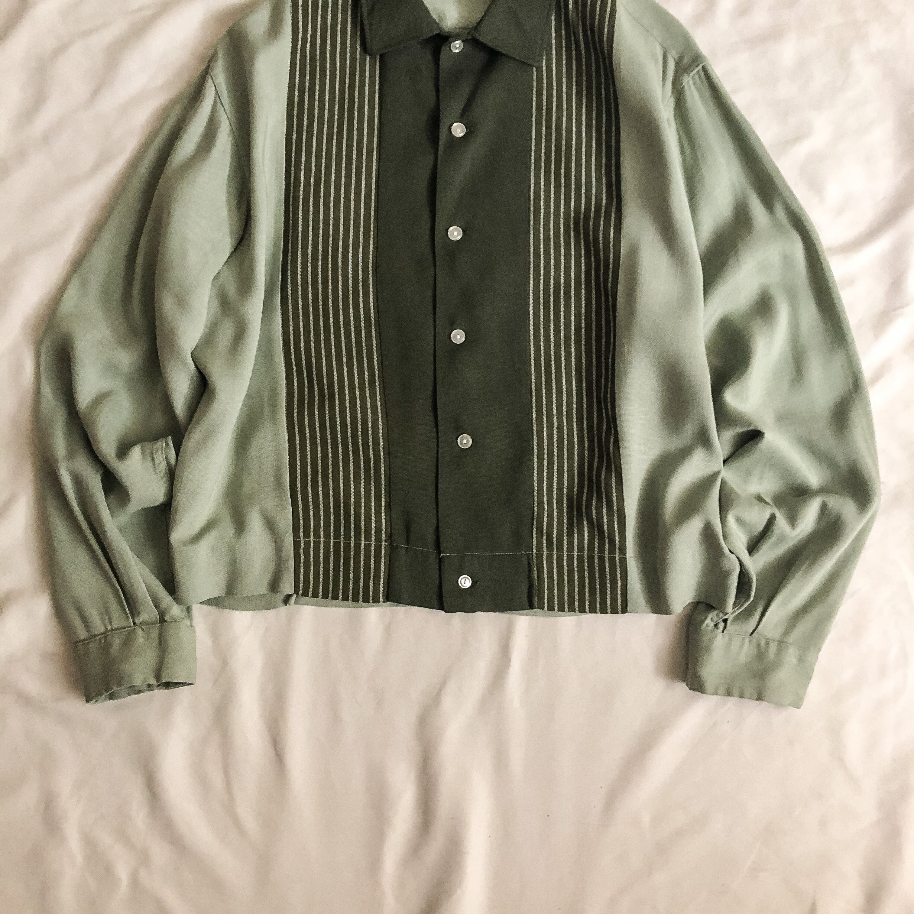 特徴 :グリーン系のツートンカラーの切り替えが珍しいヴィンテージレーヨンシャツ。