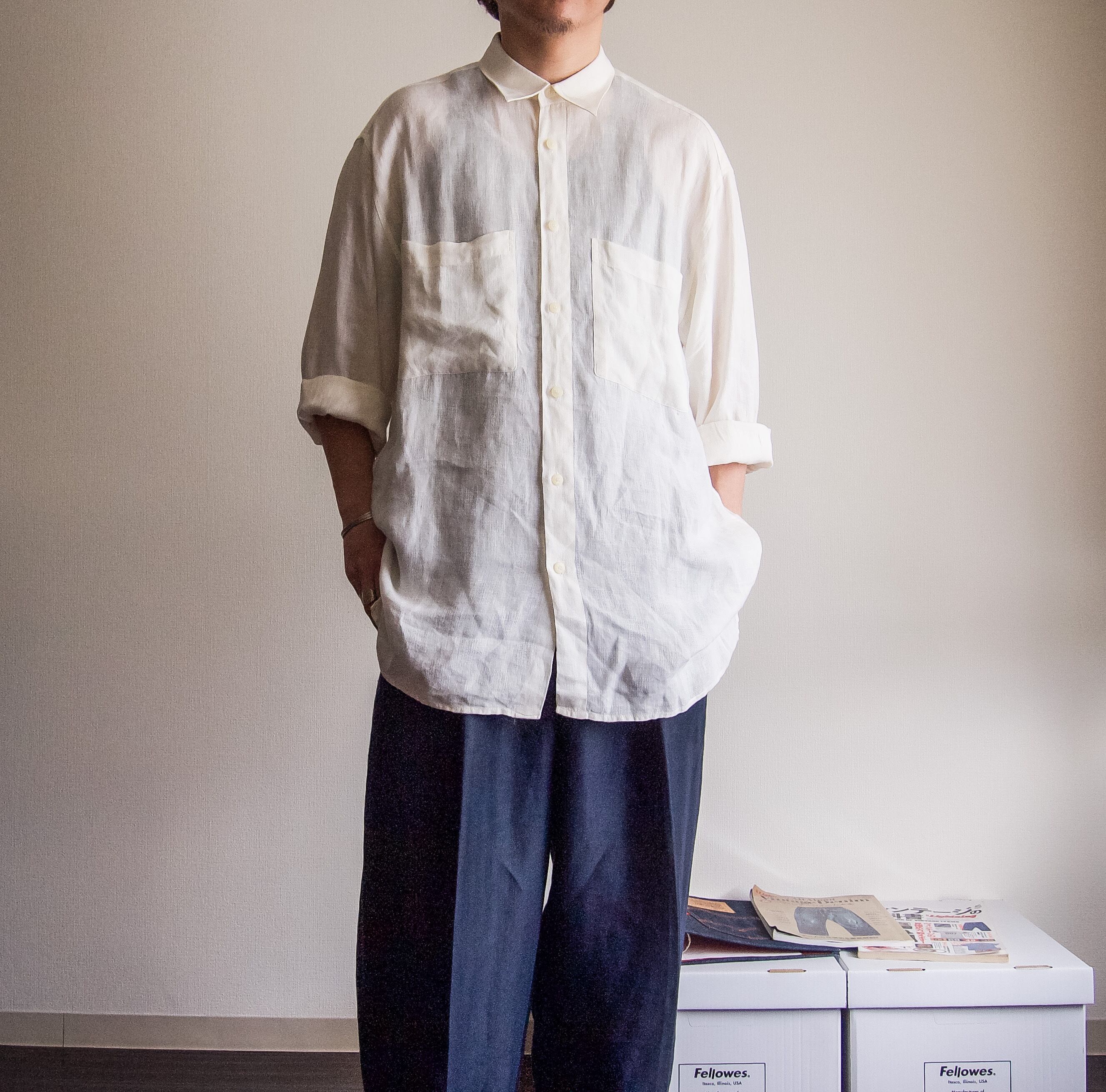 プルプルとした柔らかなリネンで落ち感もあり、サイズがビッグサイズなので着た時はドレープ感もあり動きが出るのもいいですね。