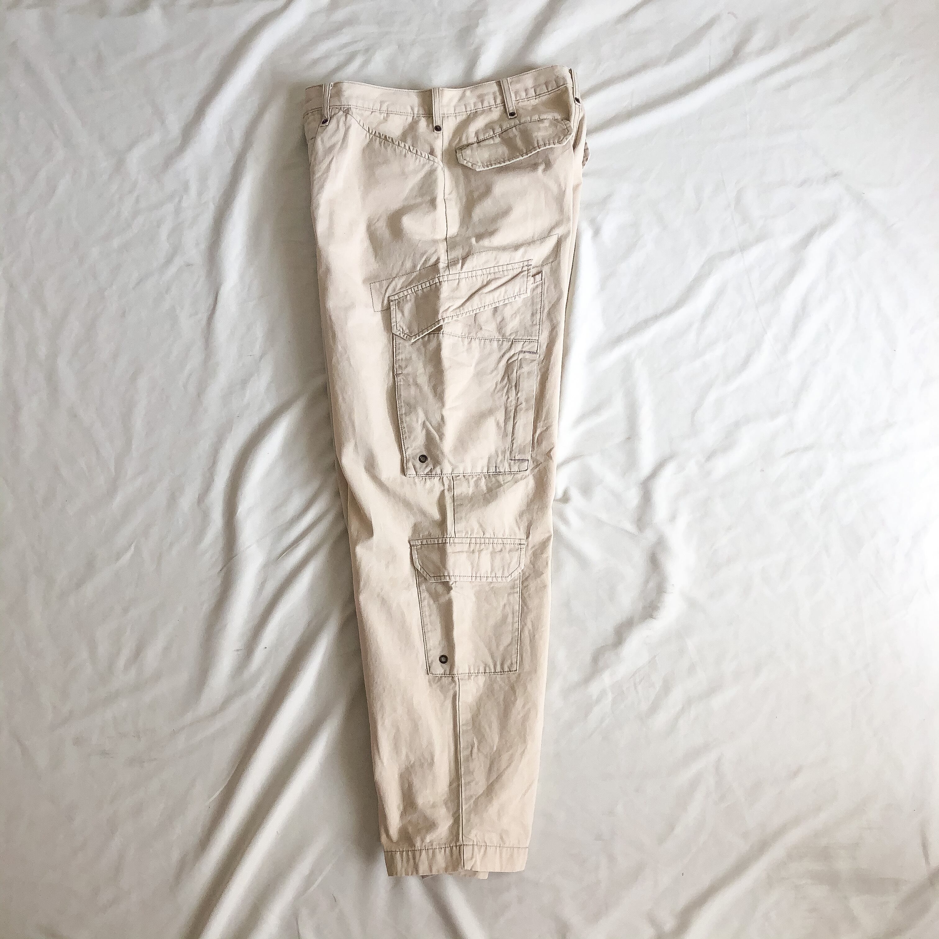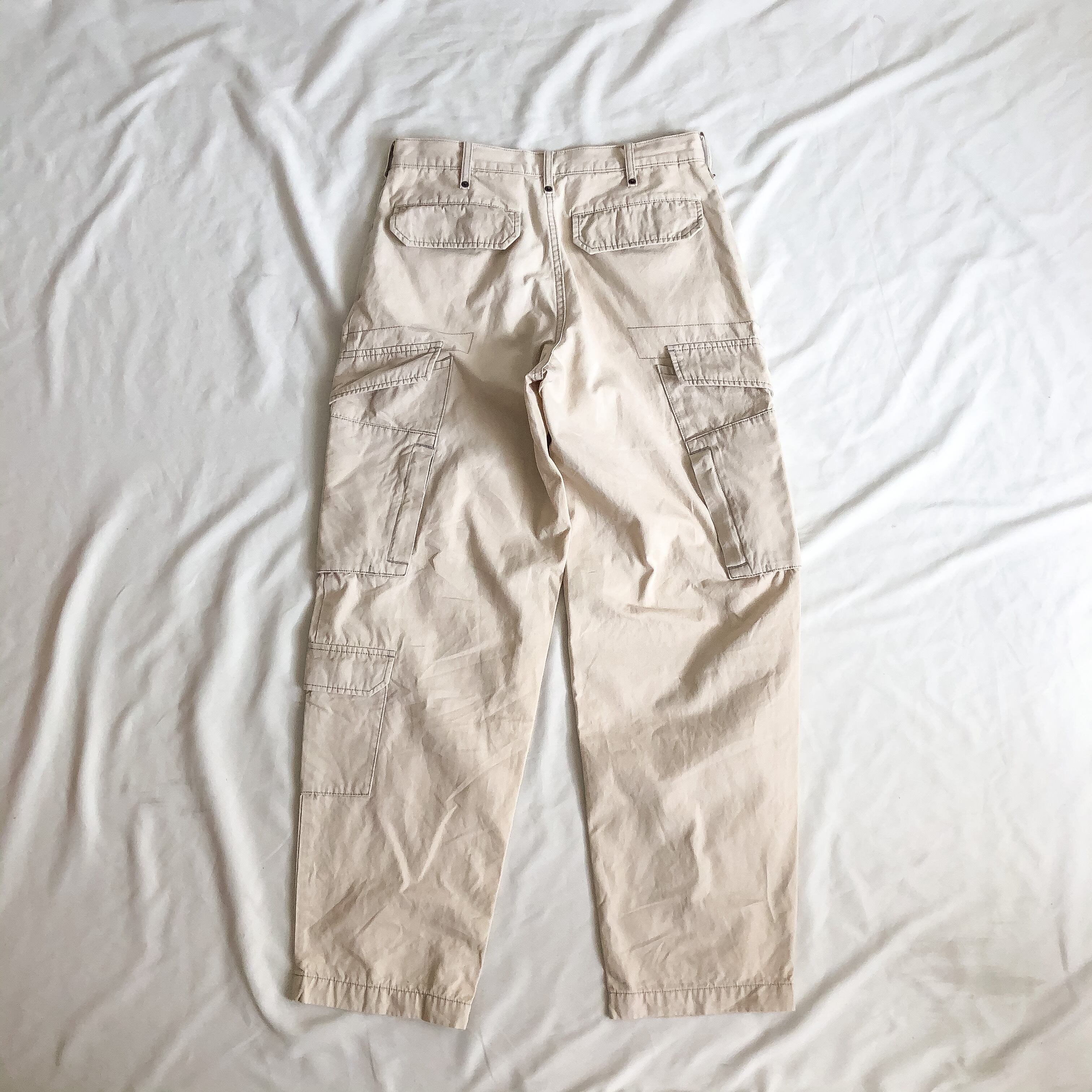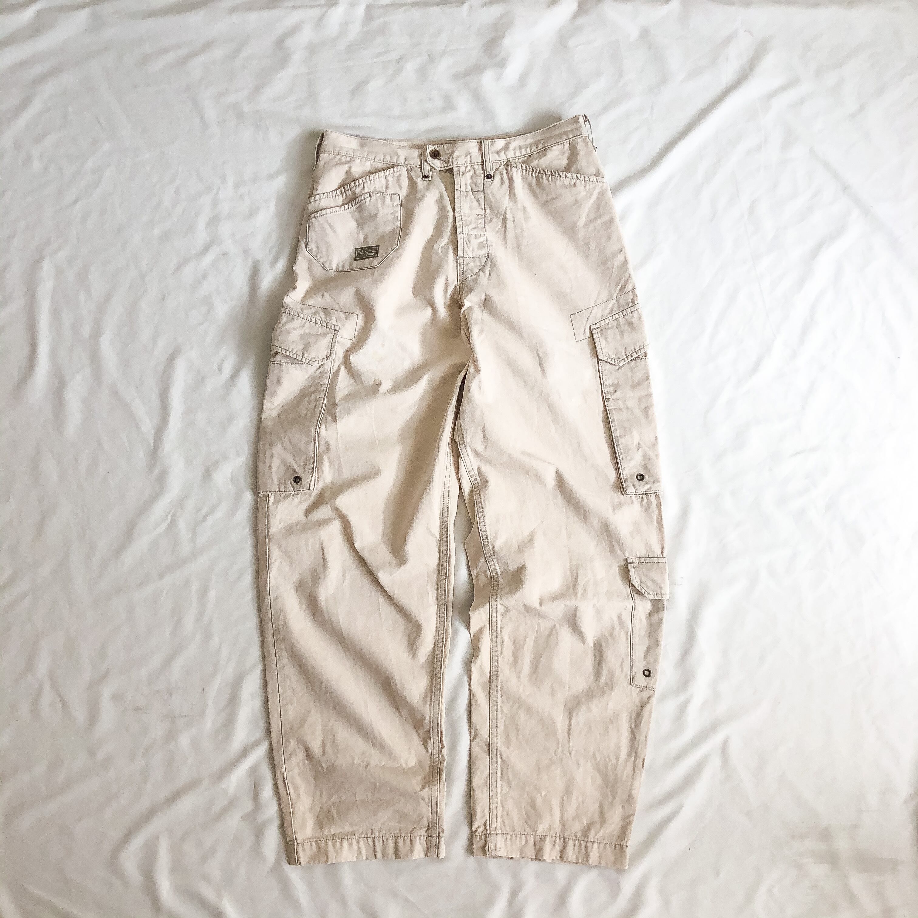 特徴 :アイボリーと薄いベージュが混ざったようなカラーリングに、多重ポケットやミリタリーライクなサイドカーゴデザインが洒落たポールスミスのスーパーチノパンツ。