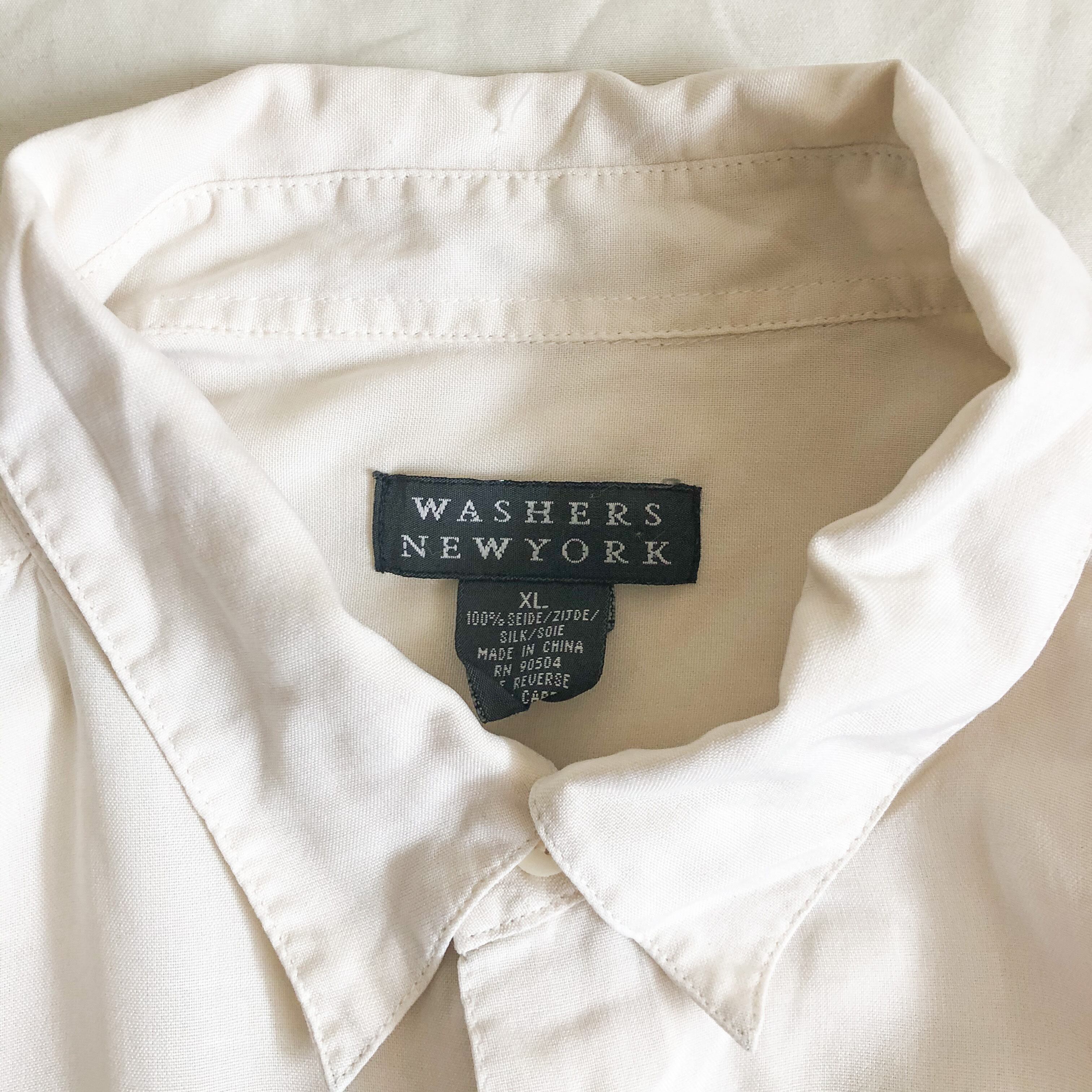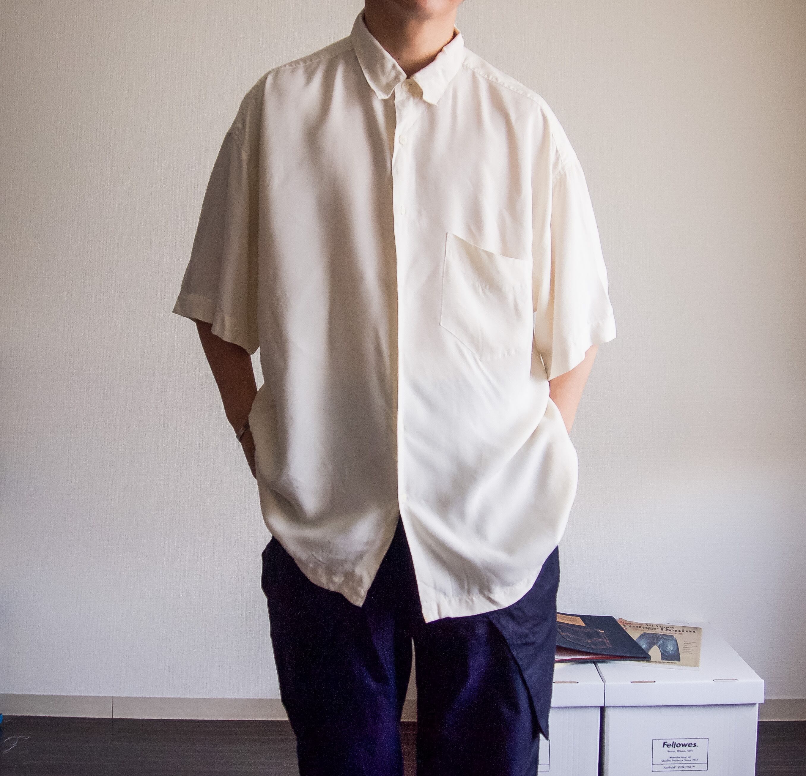 特徴 :光沢感のある独特なホワイトカラーがクールなシルクシャツ。