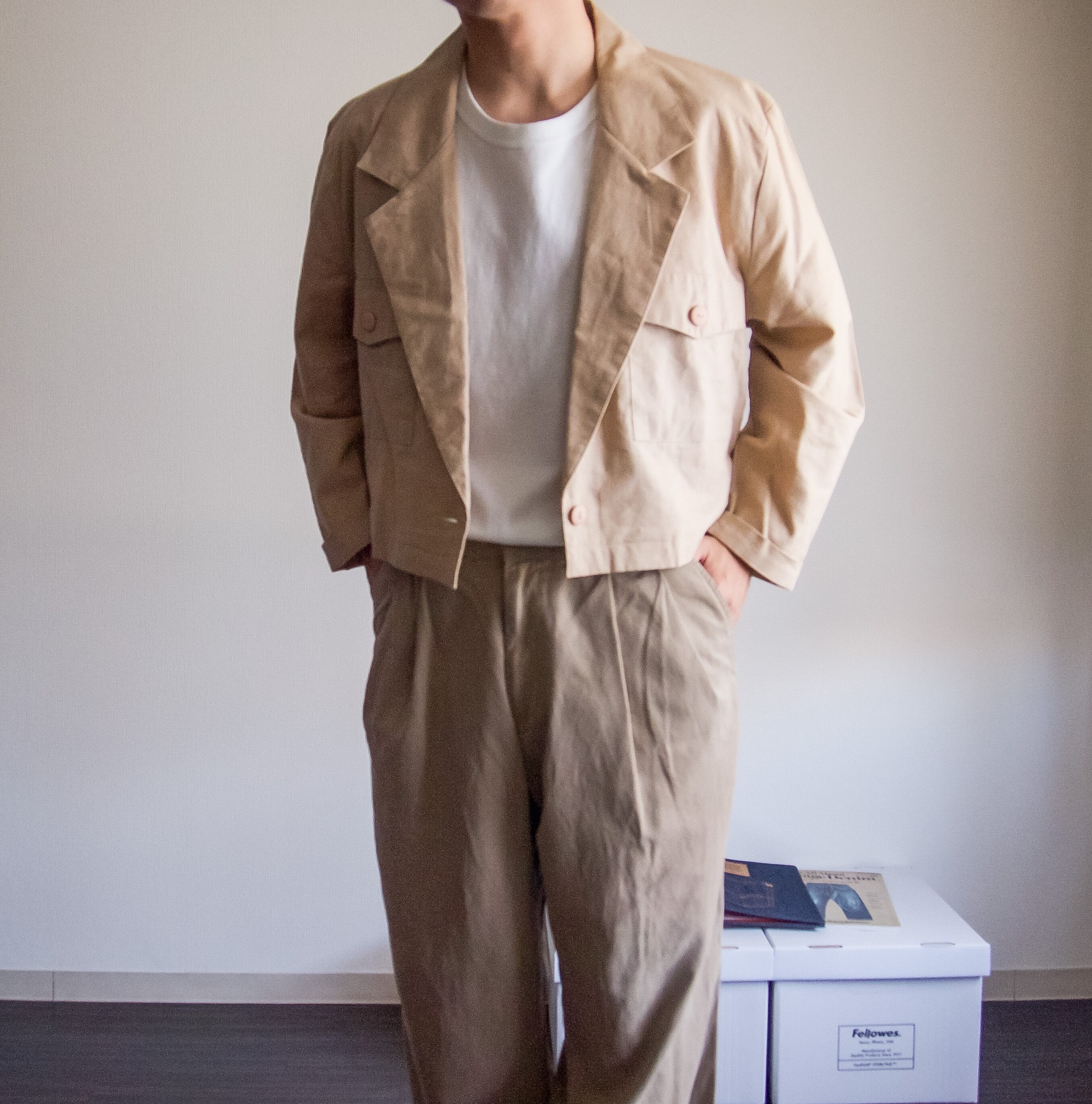 同じベージュ系のパンツと合わせてセットアップ風に着てもクールかと思います。