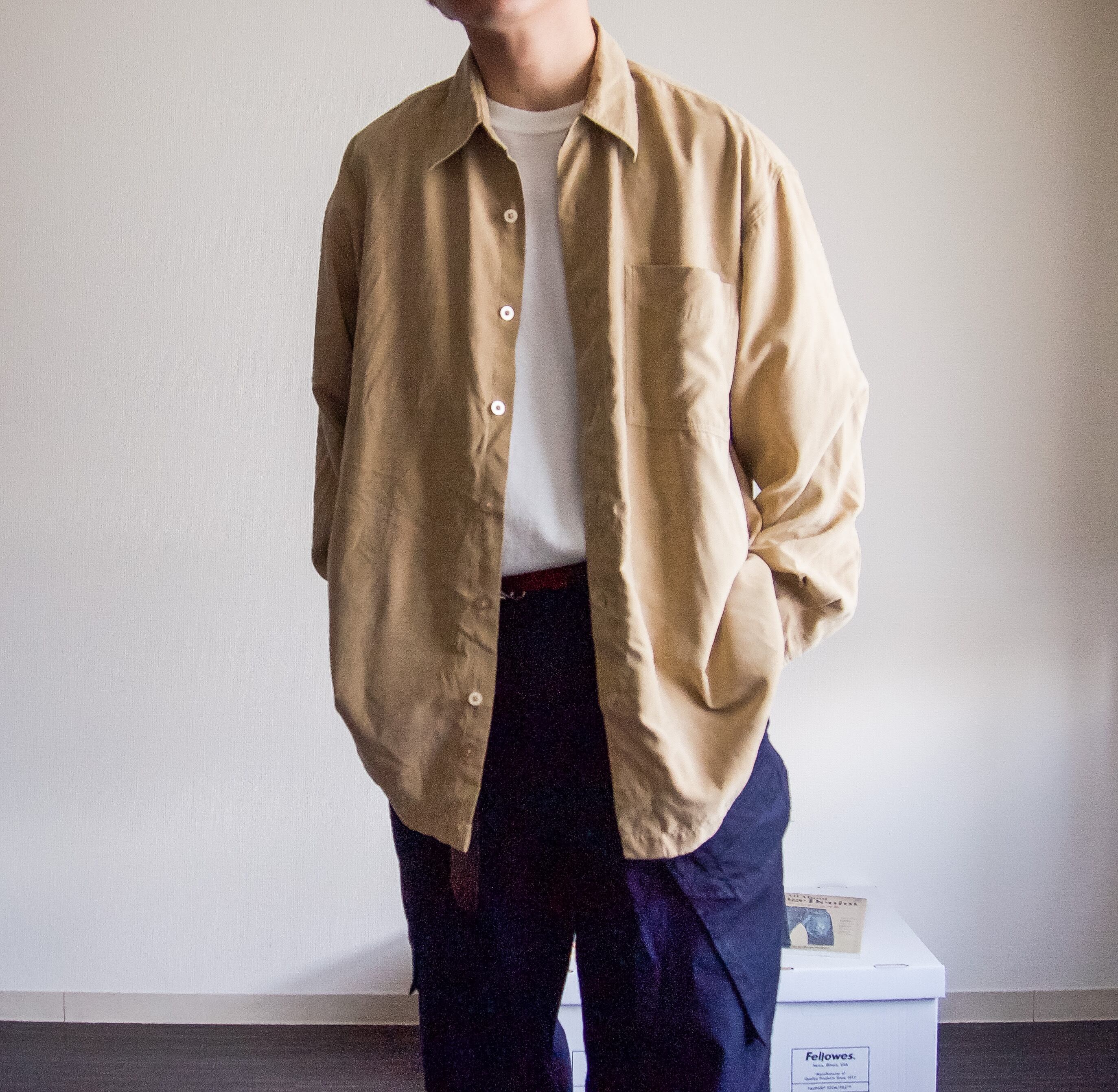 特徴 :ライトベージュ系のカラーリングがグッドなフェイクスエードシャツ。