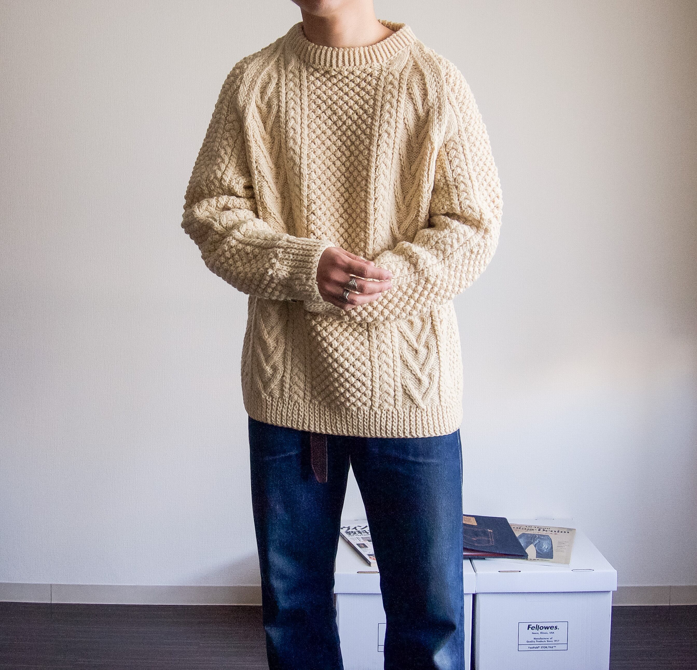 特徴 :ヴィンテージニットらしさのある、みっちりとした編み目が可愛いアランニット。