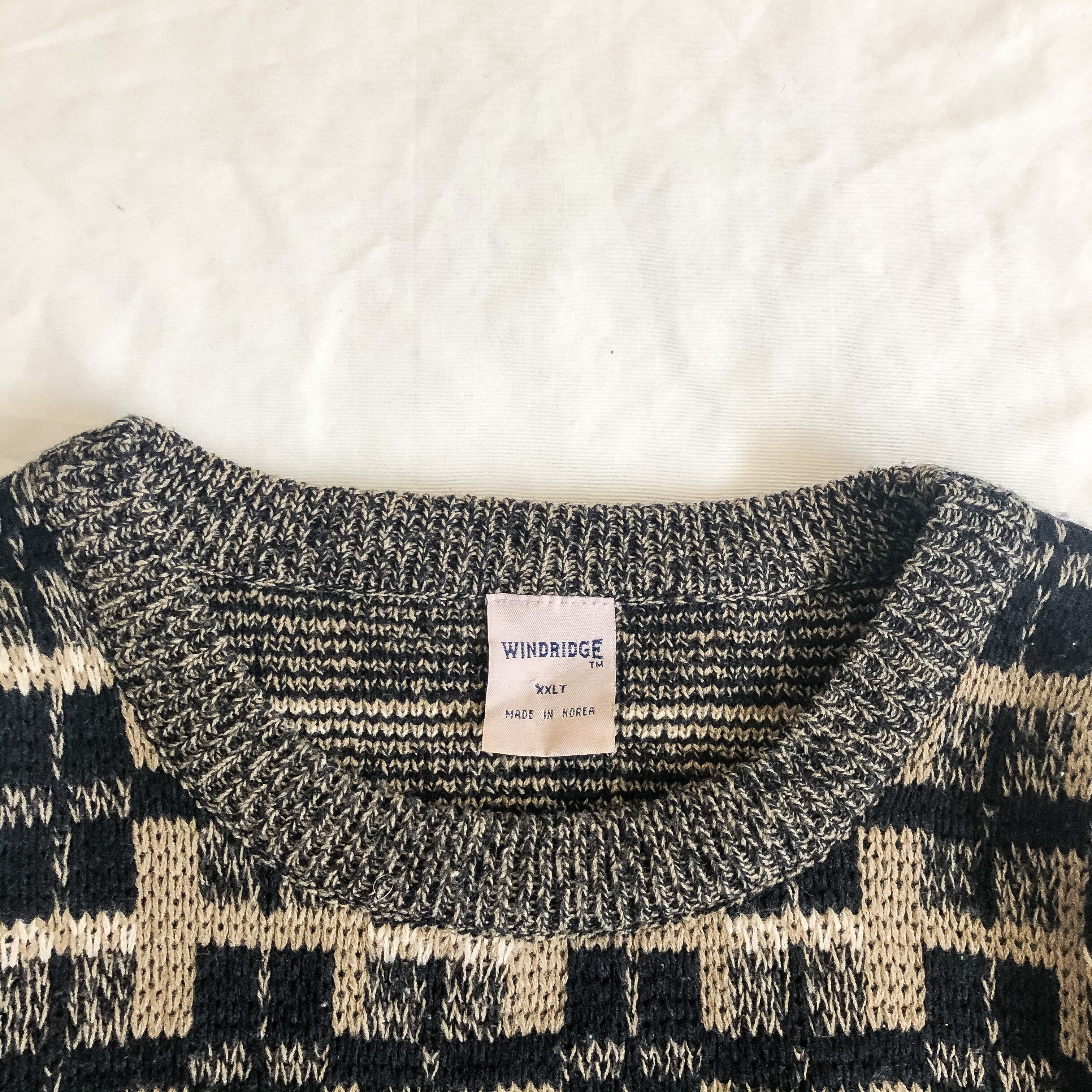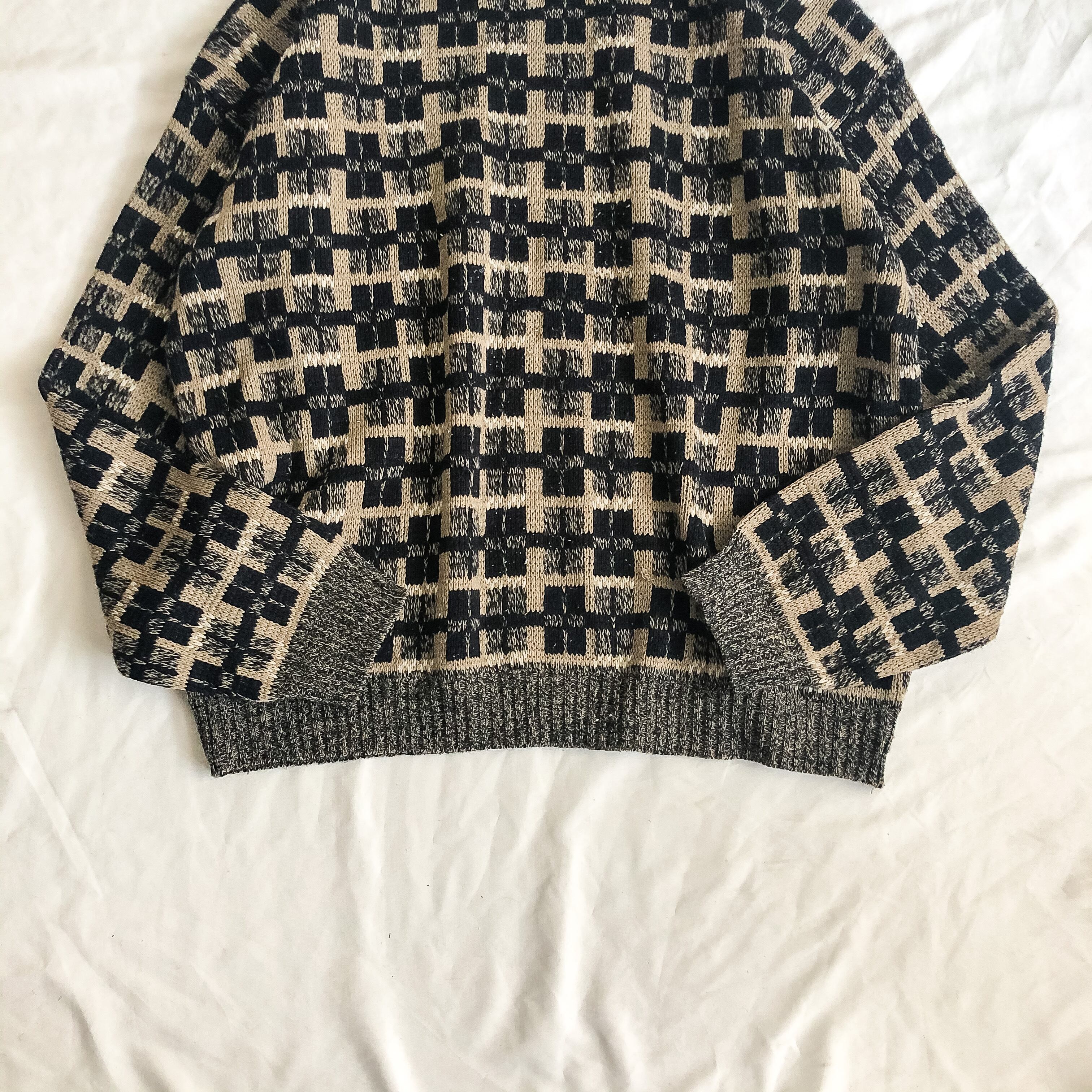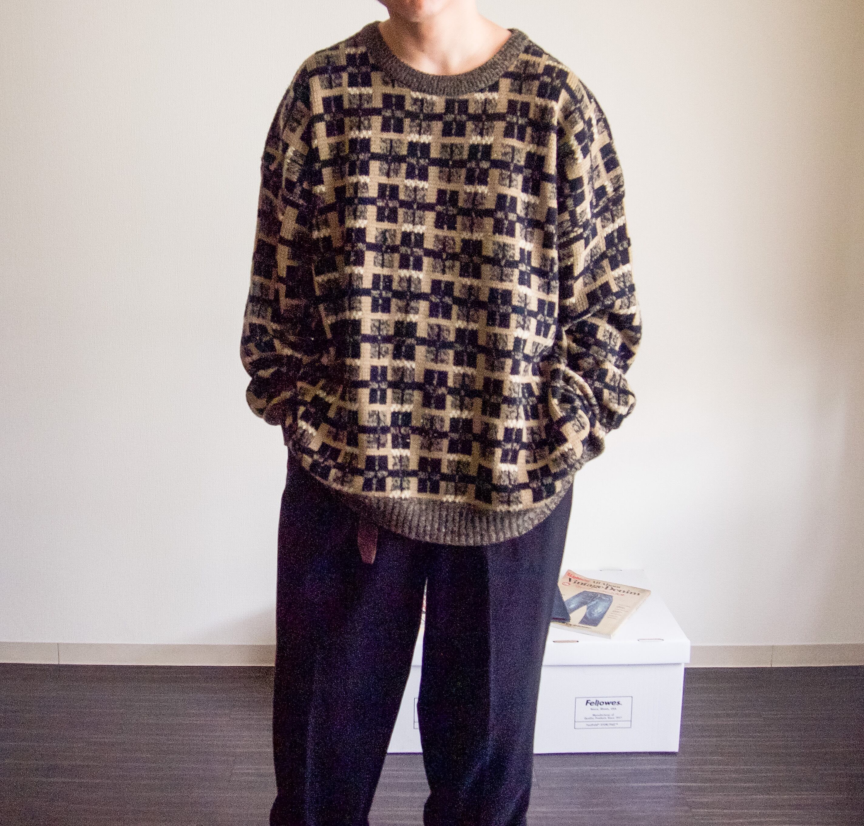 特徴 :チェック柄のような独特な総柄のテキスタイルがグッドな総柄セーター。