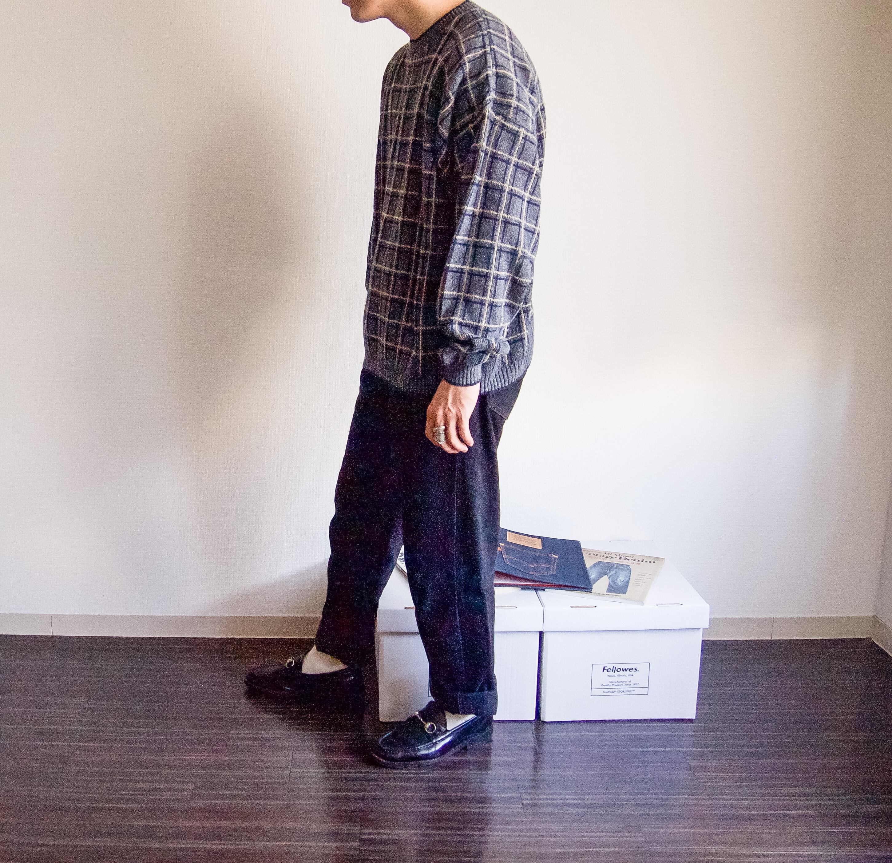 特徴 :グレーベースのチェック柄が可愛い総柄セーター。