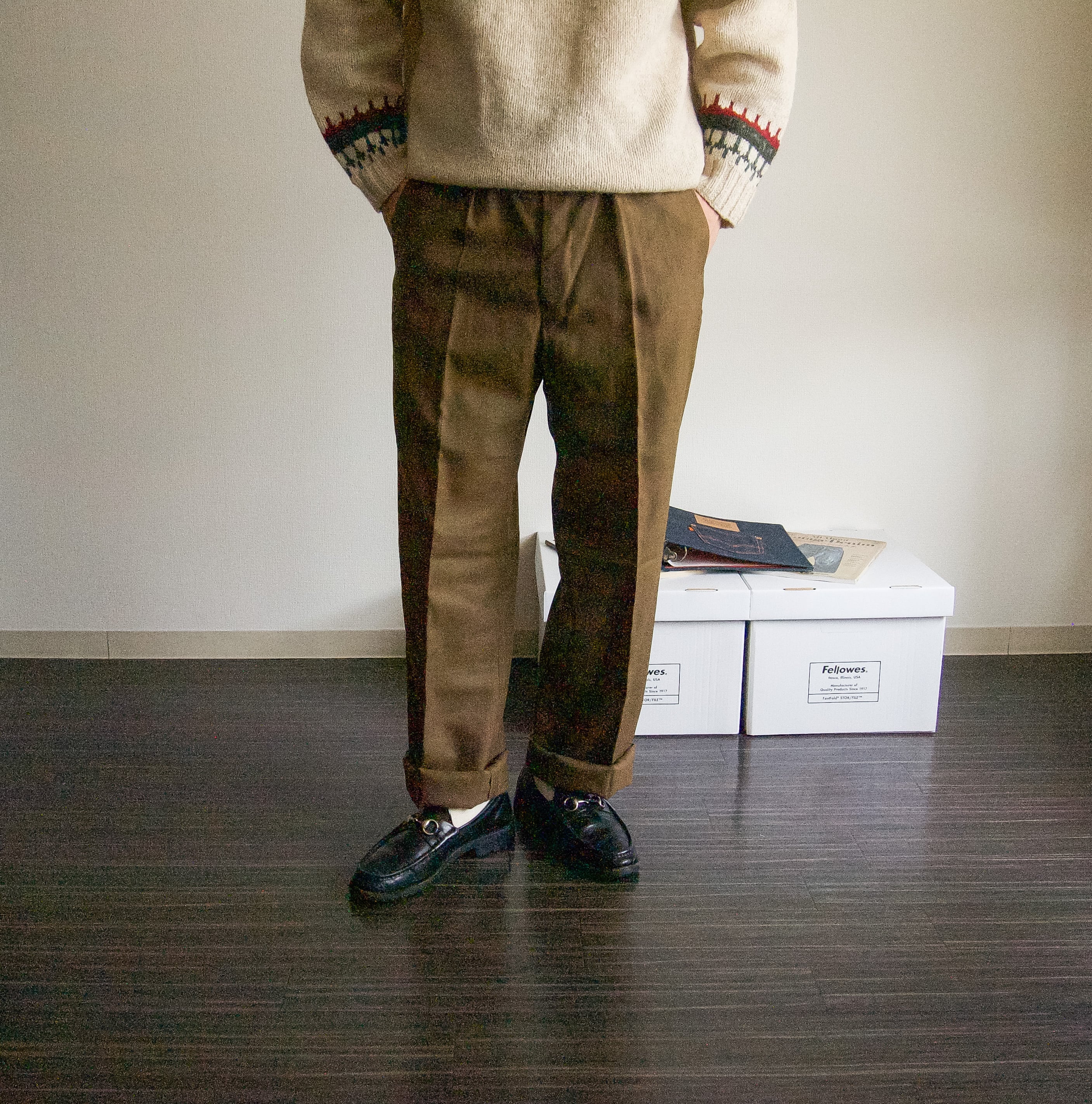 ドレスパンツながらカチッとしすぎていないので、クラシカルなスタイルからカジュアルまで幅広く使える素晴らしいアイテムです。