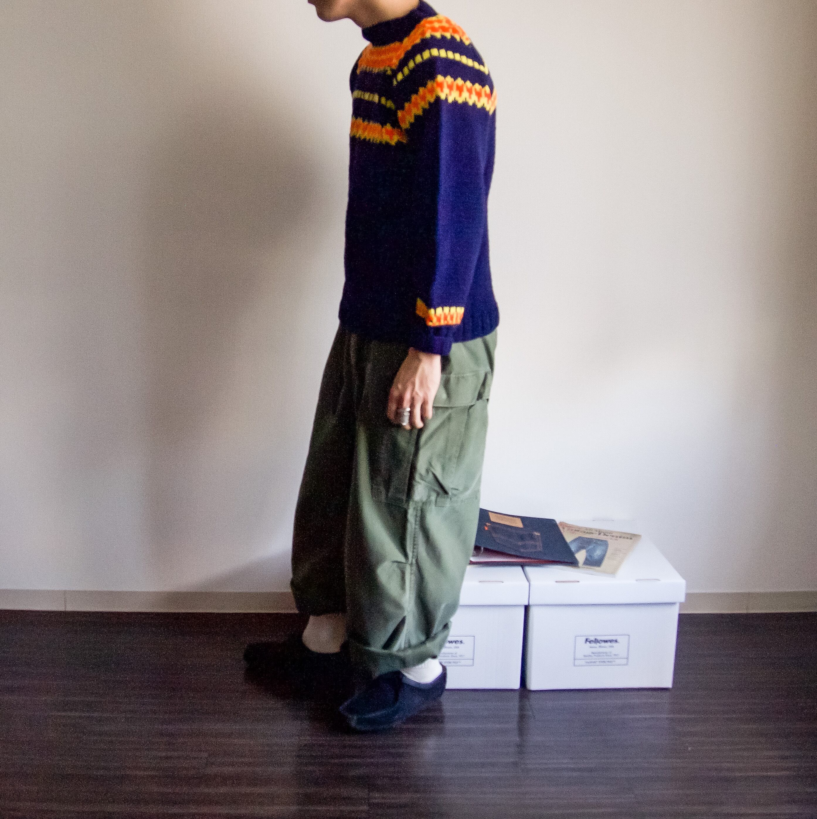 特徴 :ネイビーベースにイエロー×オレンジのノルディック柄が可愛い1970's~頃のヴィンテージセーター。